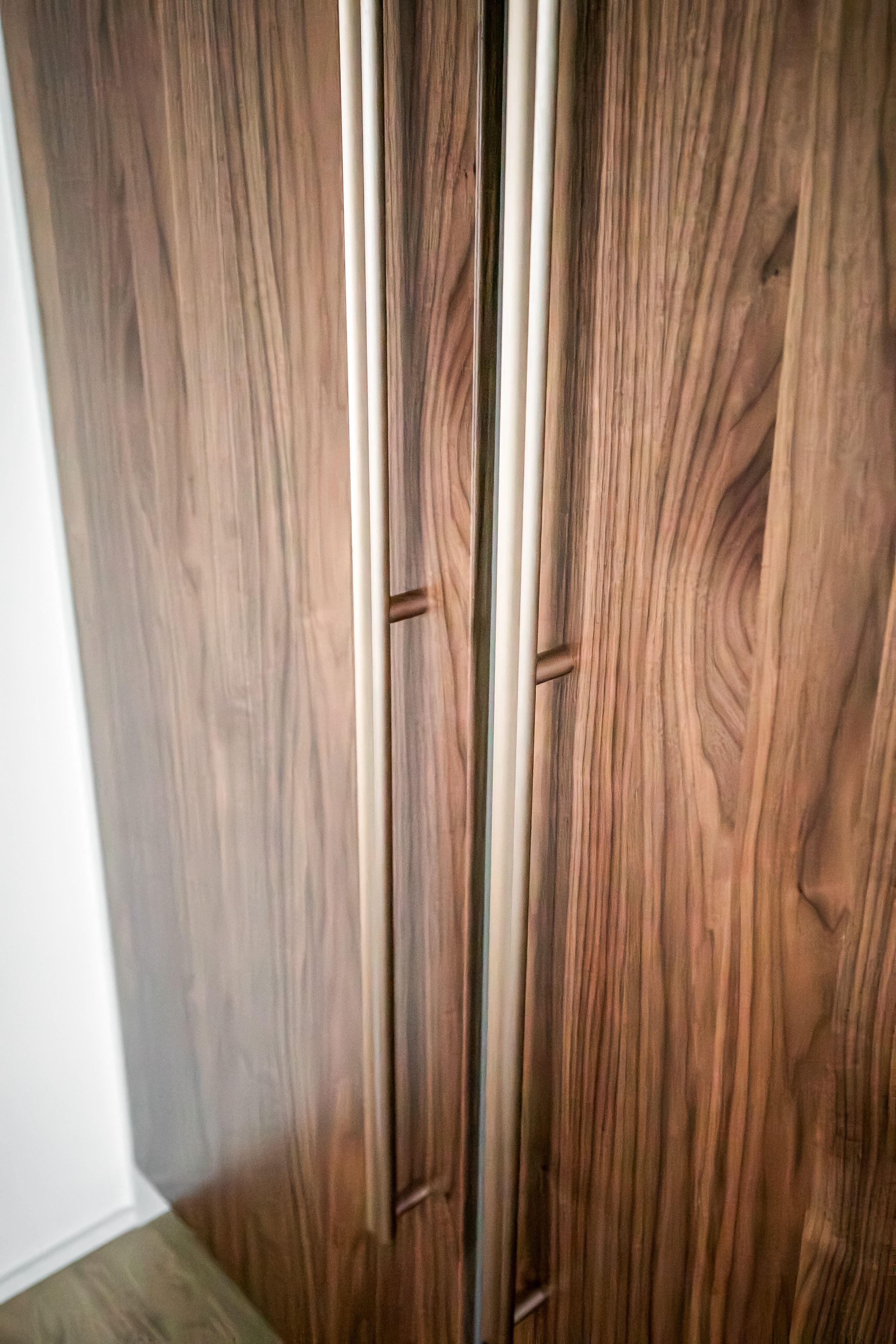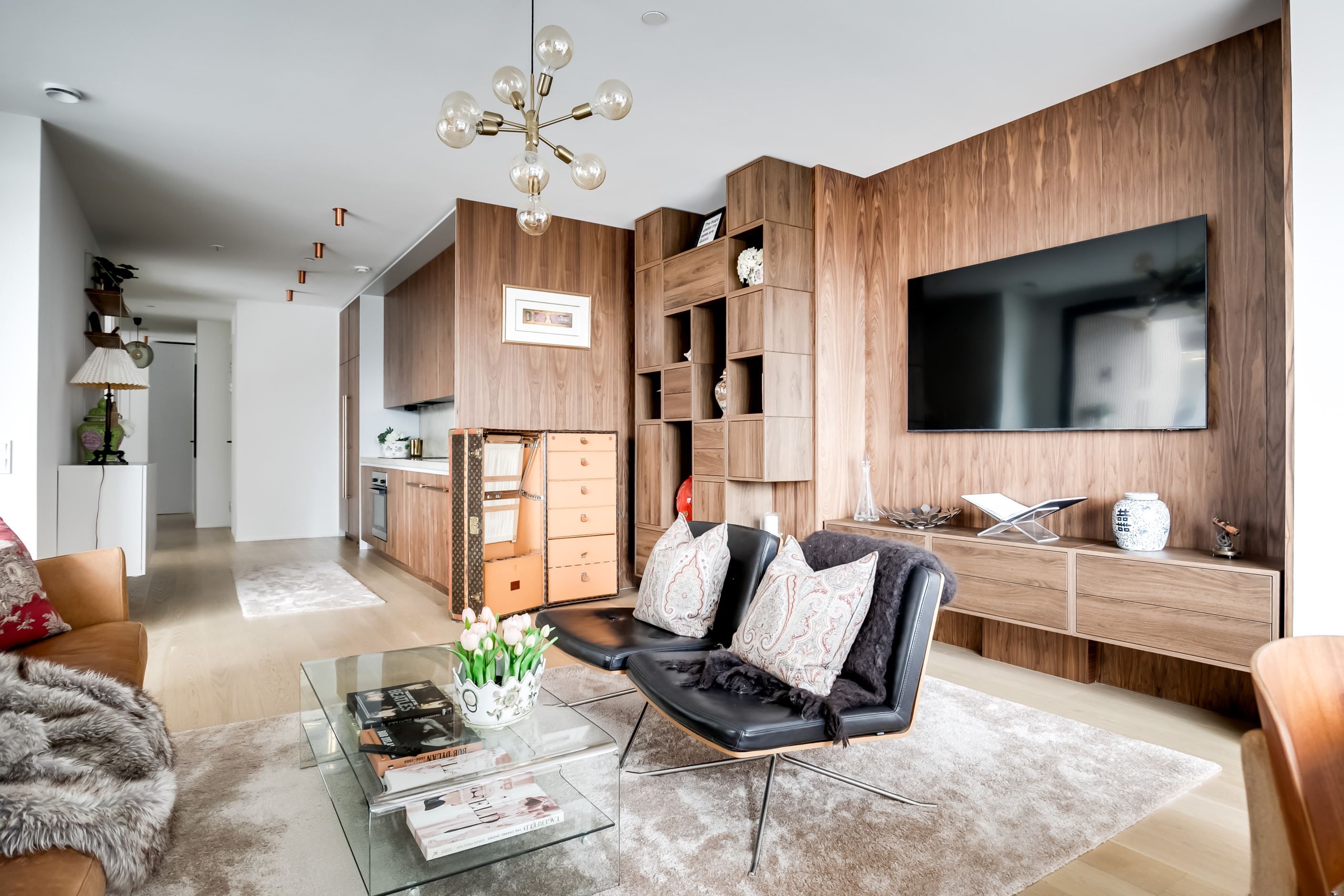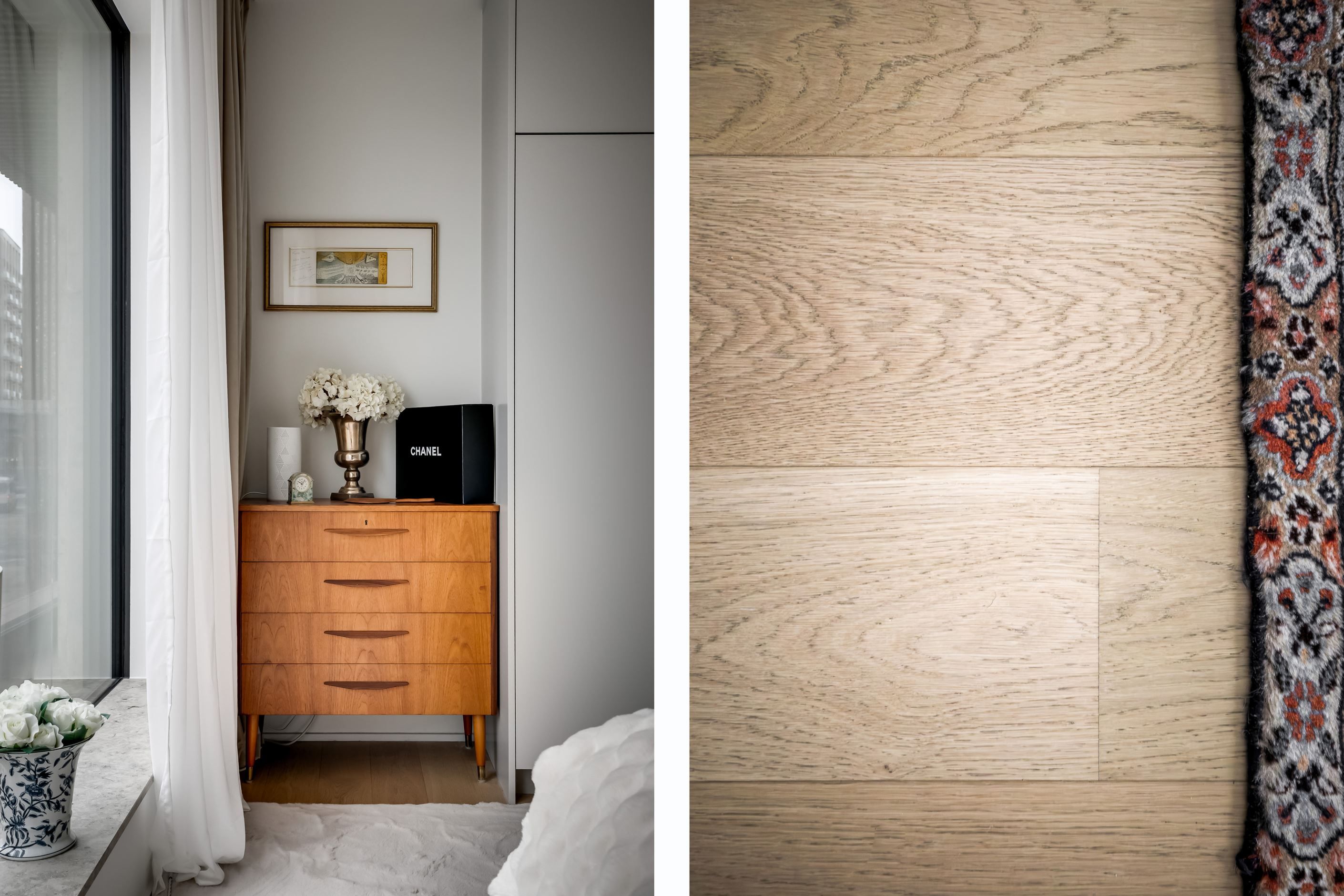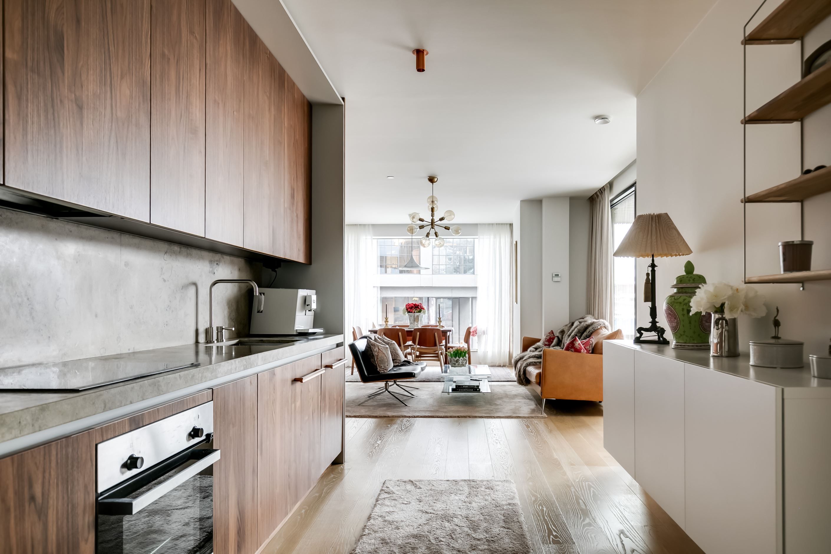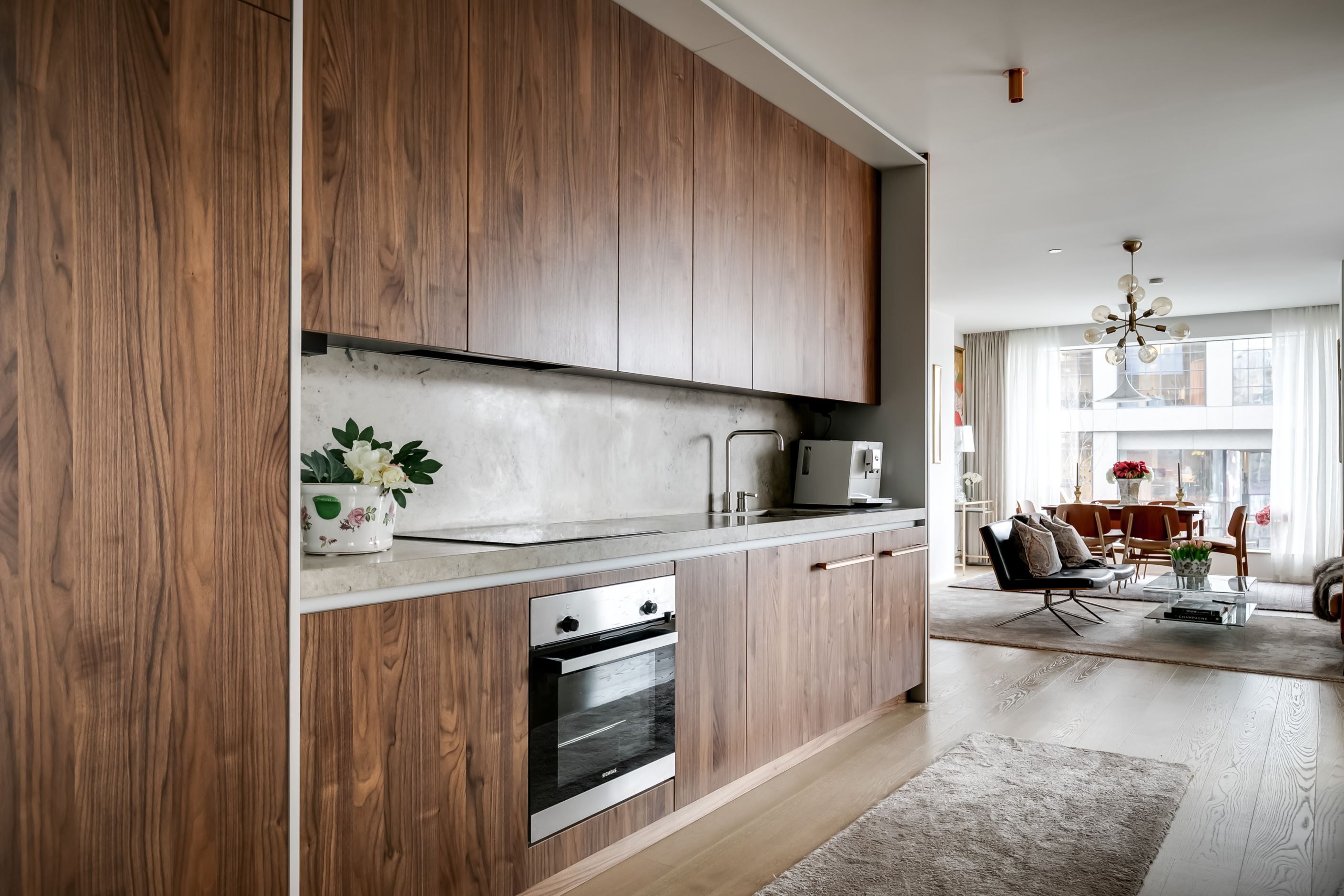 Materialvalen är påkostade och harmoniska, med ljusa ytor, vackra valnötsdetaljer och noggrant utvalda lösningar som kombinerar estetik med funktion. Väggar med platsbyggd förvaring smälter diskret in i arkitekturen och bidrar till ett stilrent, genomarbetat och lättmöblerat hem.