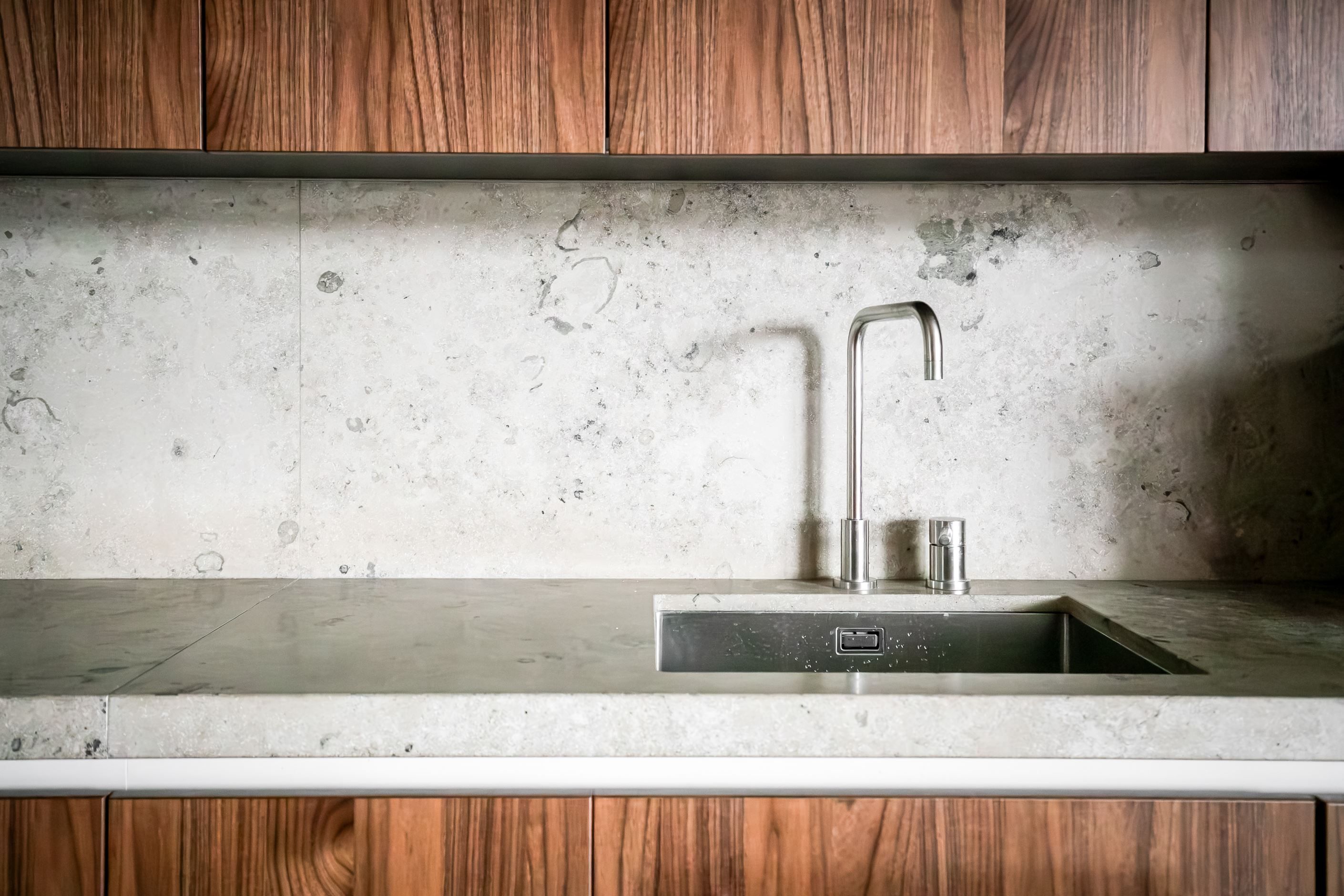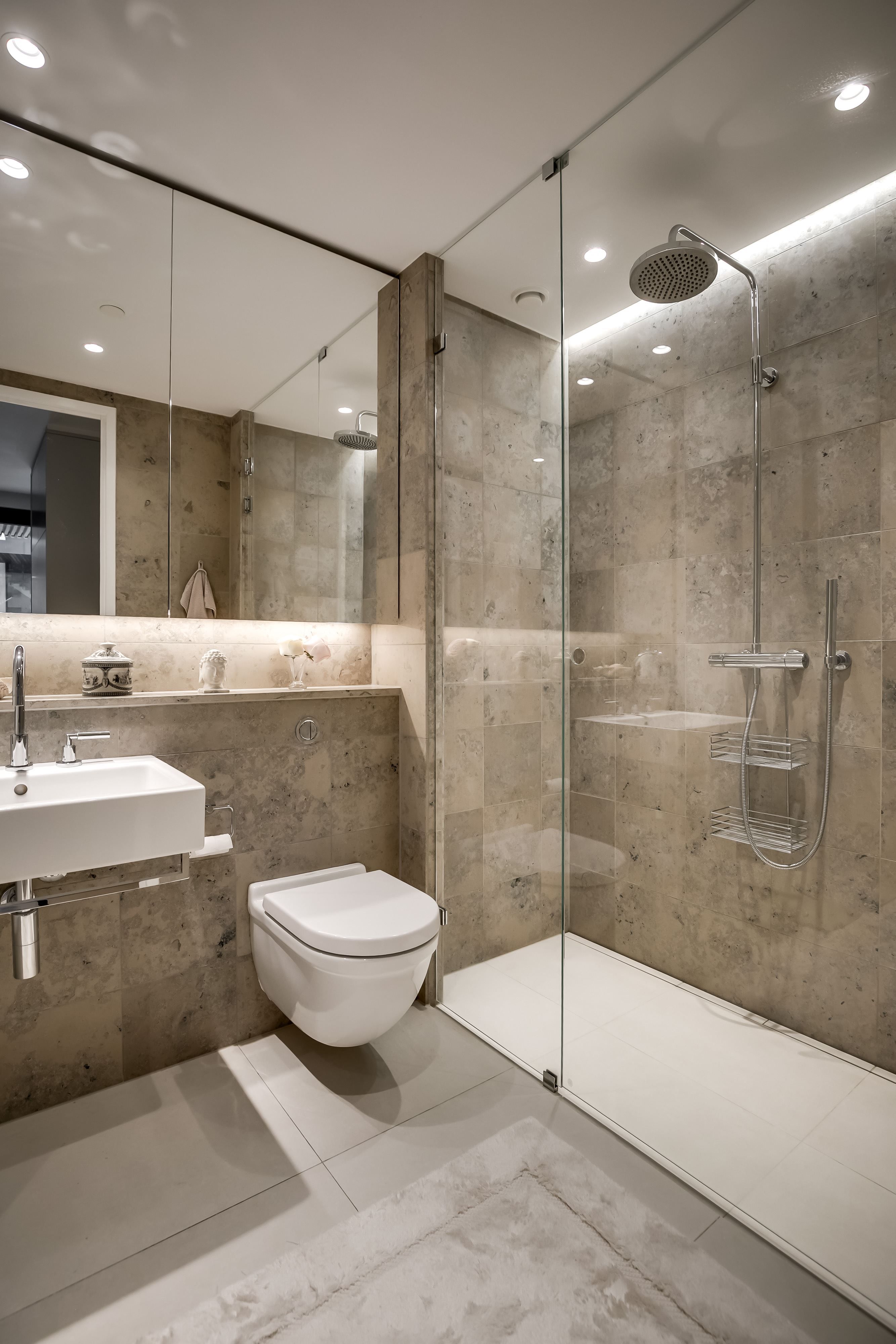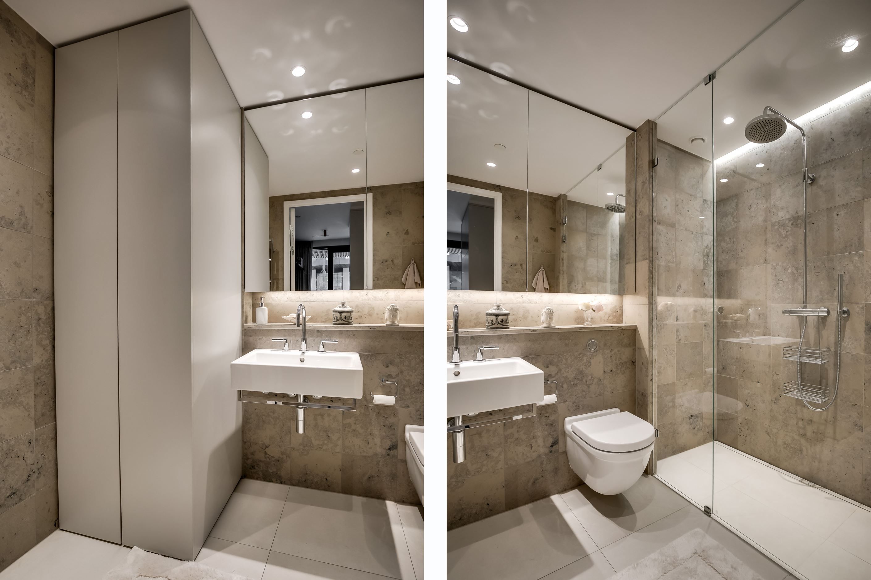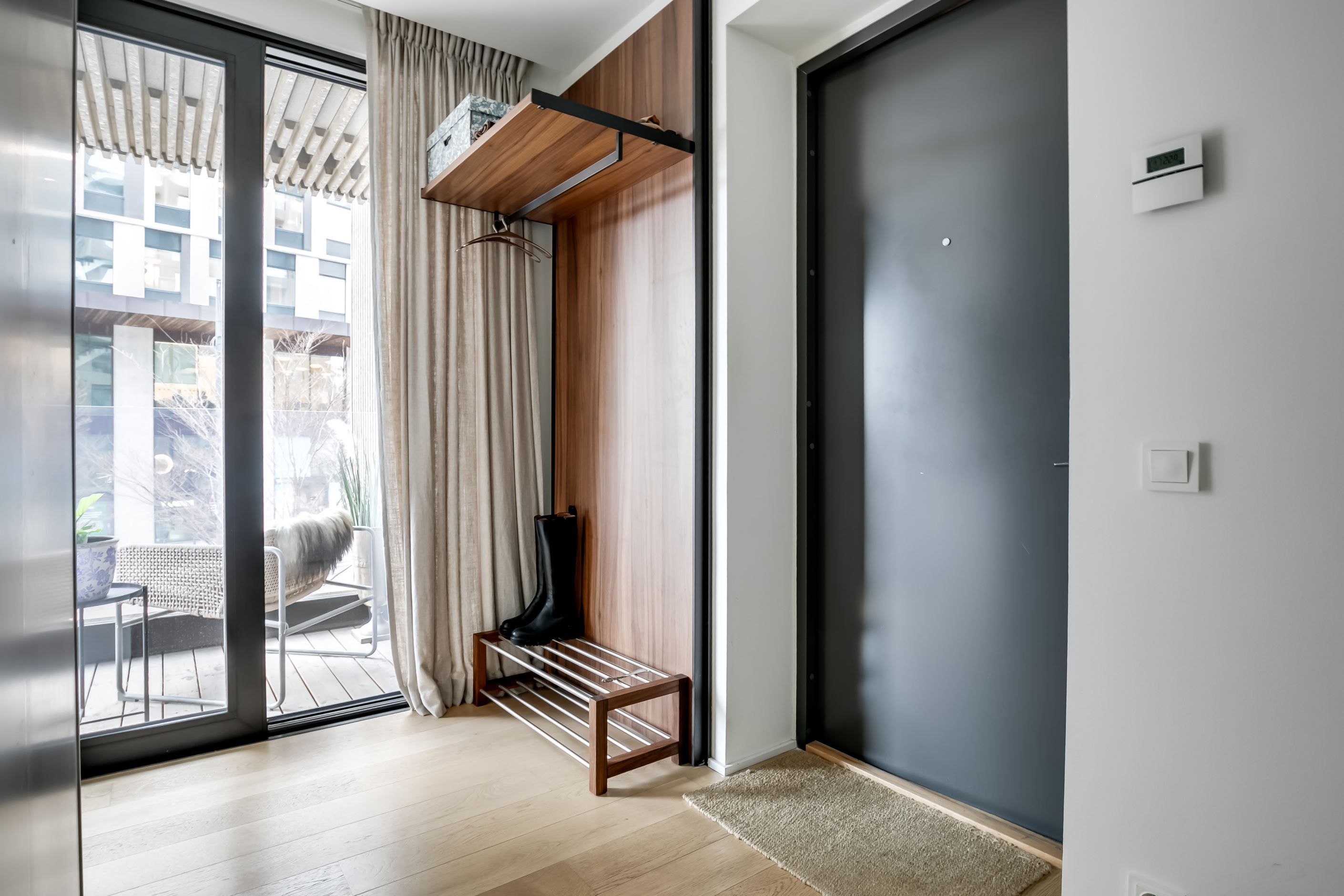 Materialvalen är påkostade och harmoniska, med ljusa ytor, vackra valnötsdetaljer och noggrant utvalda lösningar som kombinerar estetik med funktion. Väggar med platsbyggd förvaring smälter diskret in i arkitekturen och bidrar till ett stilrent, genomarbetat och lättmöblerat hem.