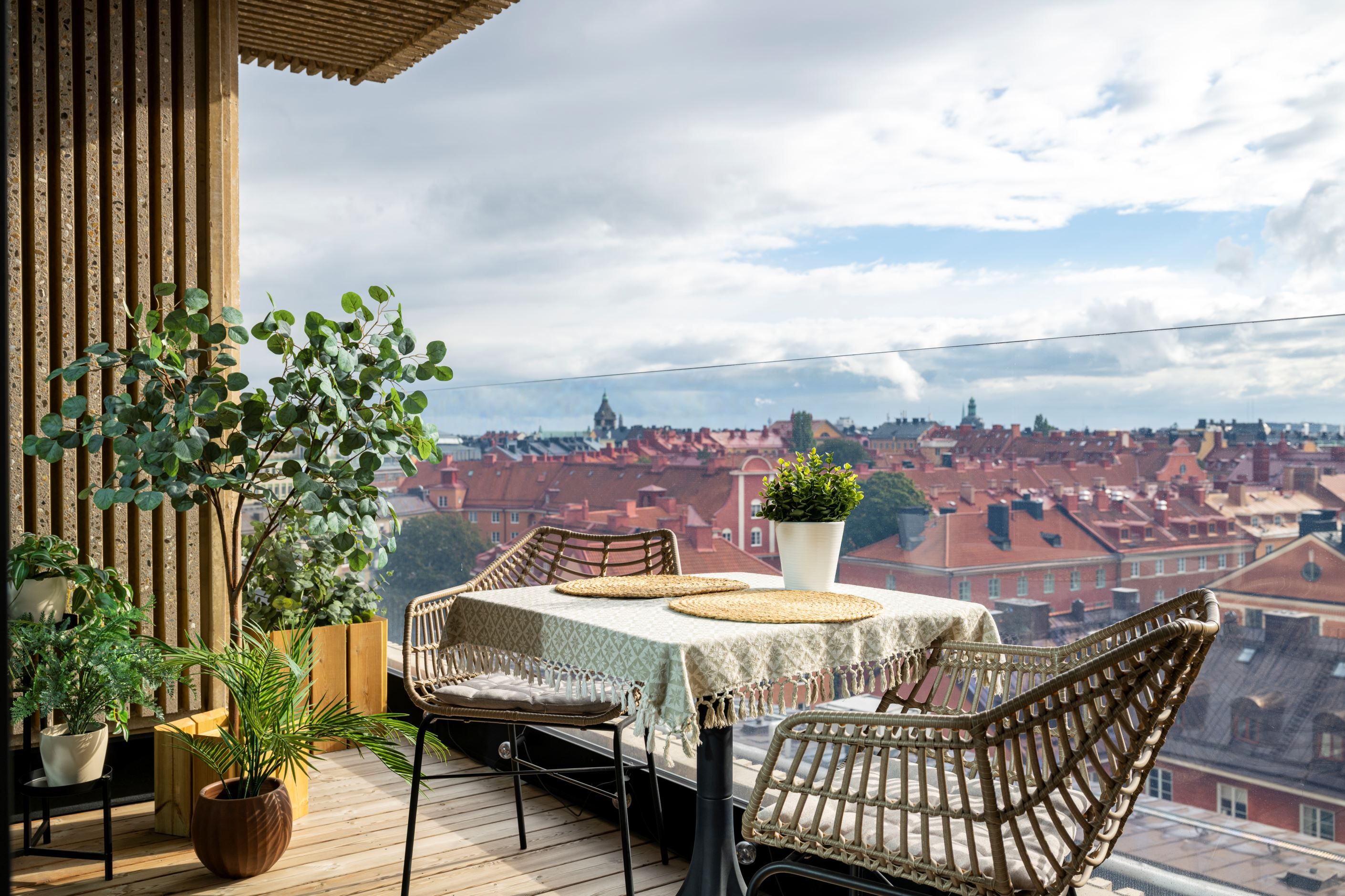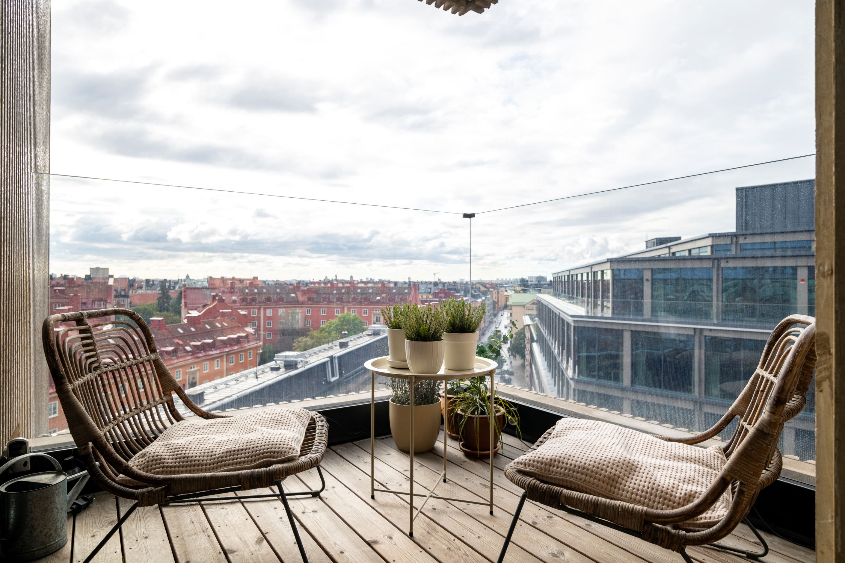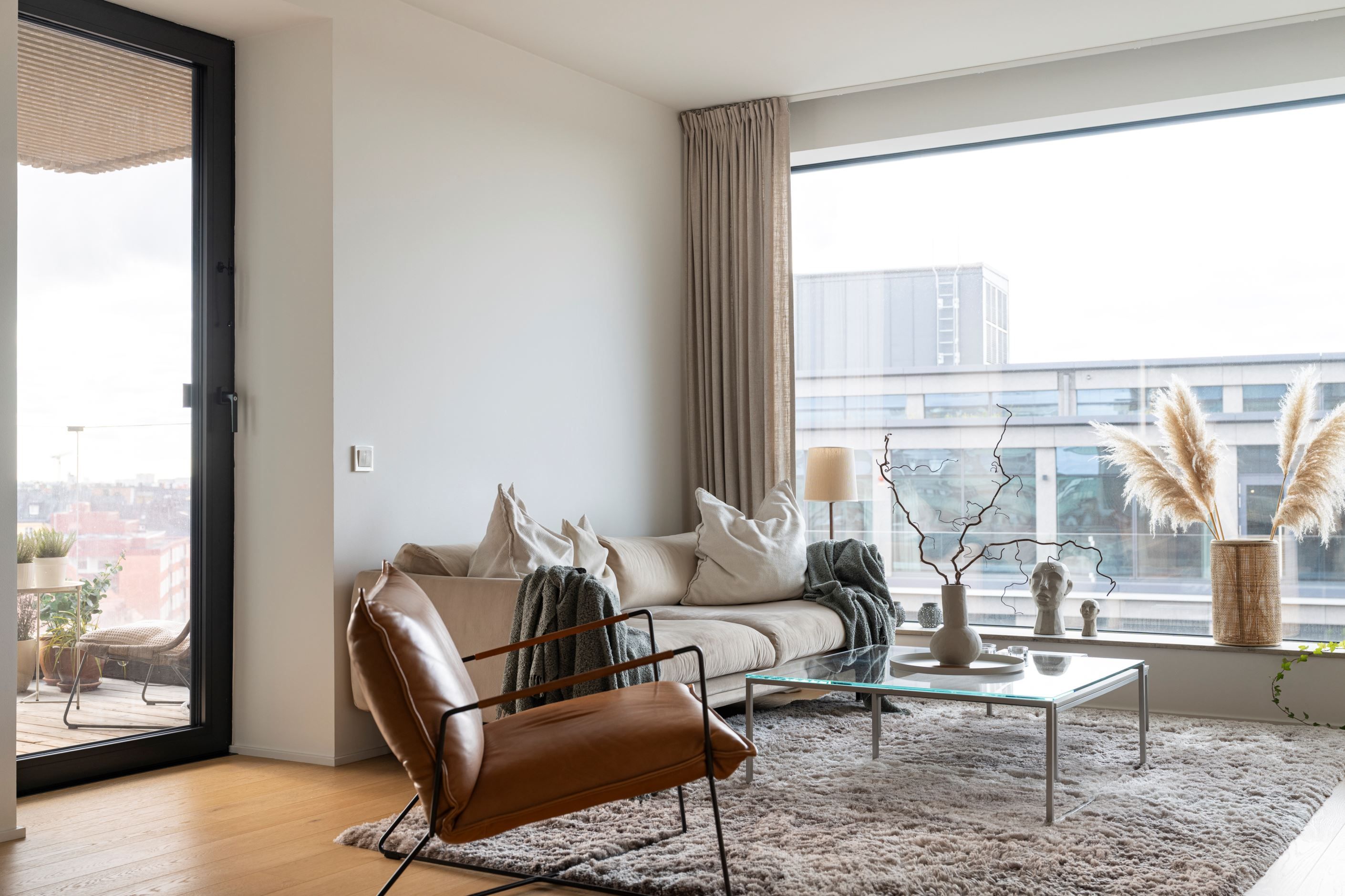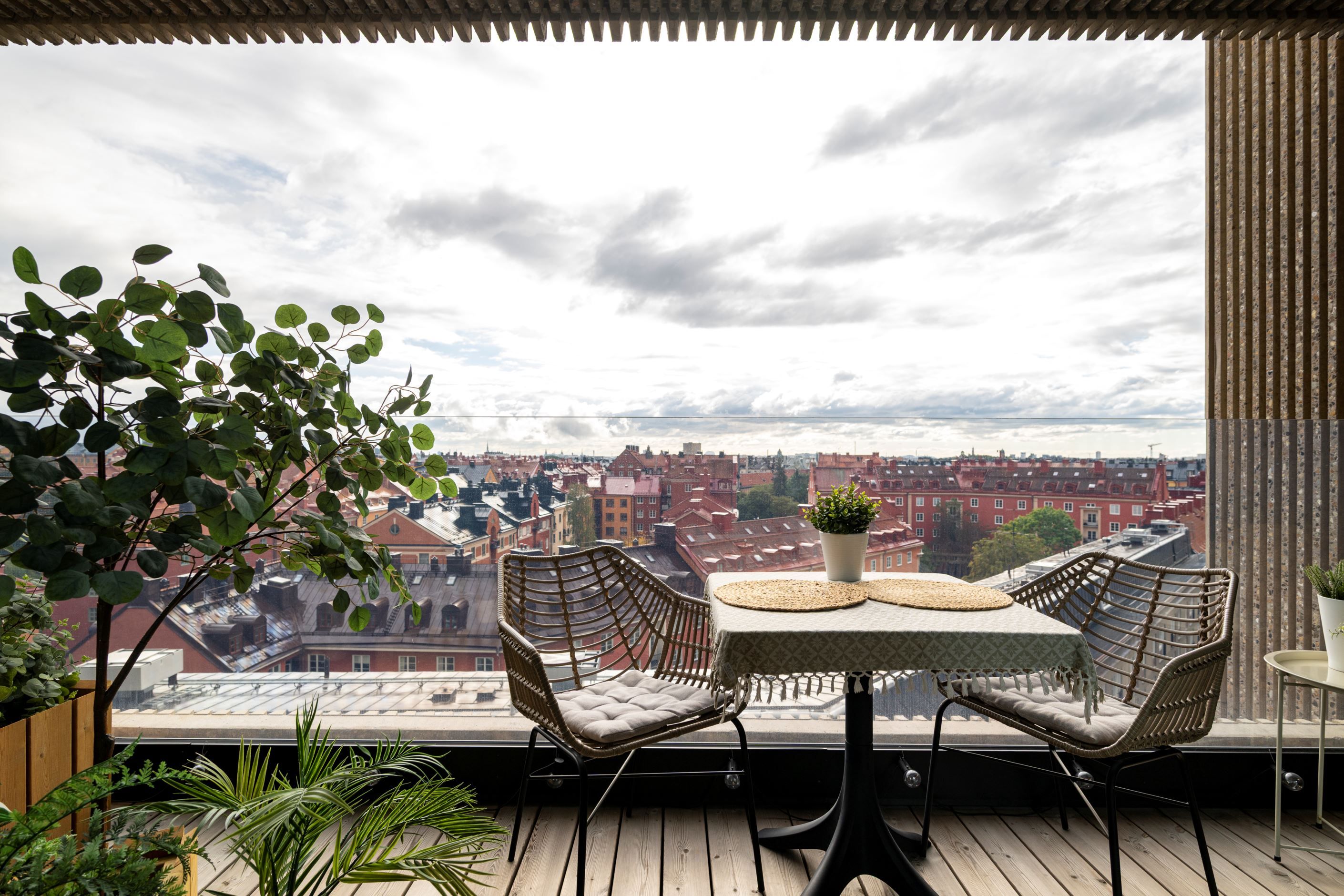 Lägenheten omges av fantastiska panoramafönster som låter ljuset flöda genom bostaden och öppnar upp mot enastående utsikt över Vasastans takåsar. Två generösa terrasser i soligt läge förlänger sällskapsytorna och blir naturliga samlingsplatser för både vardag och fest. Planlösningen är optimerad för ett bekvämt stadsliv med tre rymliga sovrum, två exklusiva badrum med påkostade materialval – varav det ena med praktisk tvättpelare – samt ett kök i öppen planlösning där design och funktion möts i en social yta som bjuder in till middagar och umgänge. De stora fönsterpartierna i varje rum skapar rymd och ett fantastiskt ljusinsläpp som ger bostaden en öppen och luftig känsla.