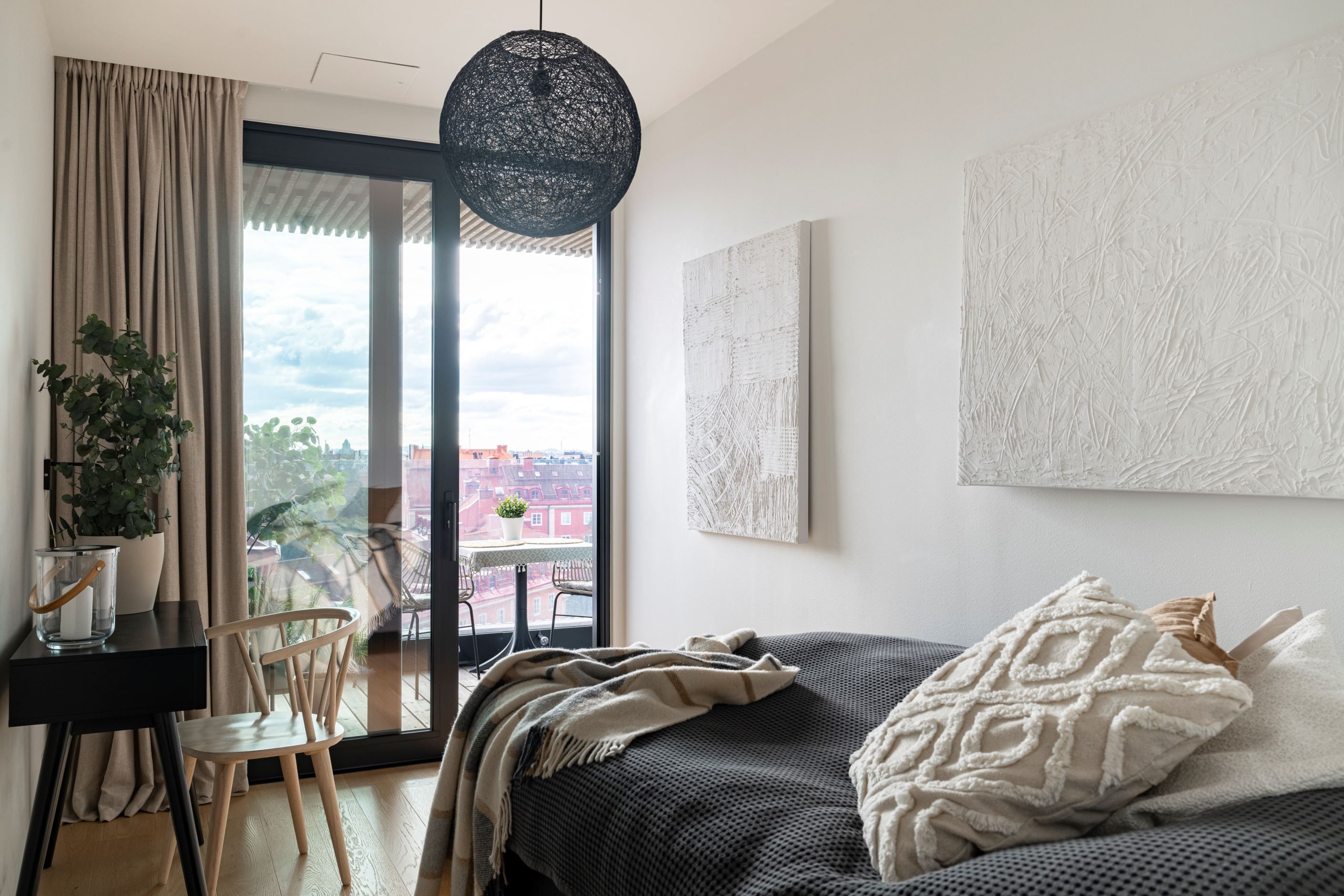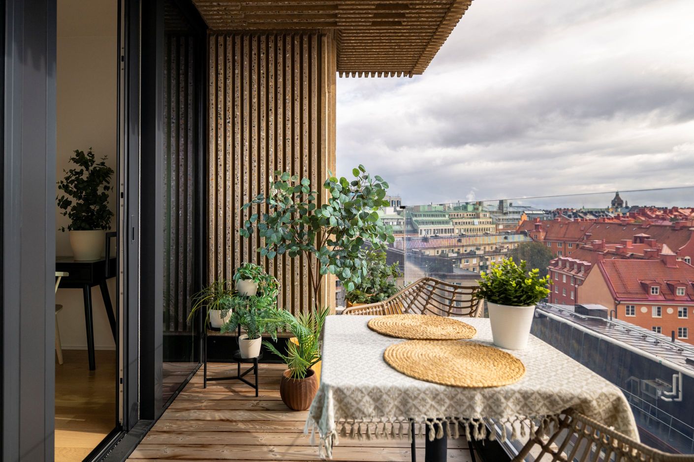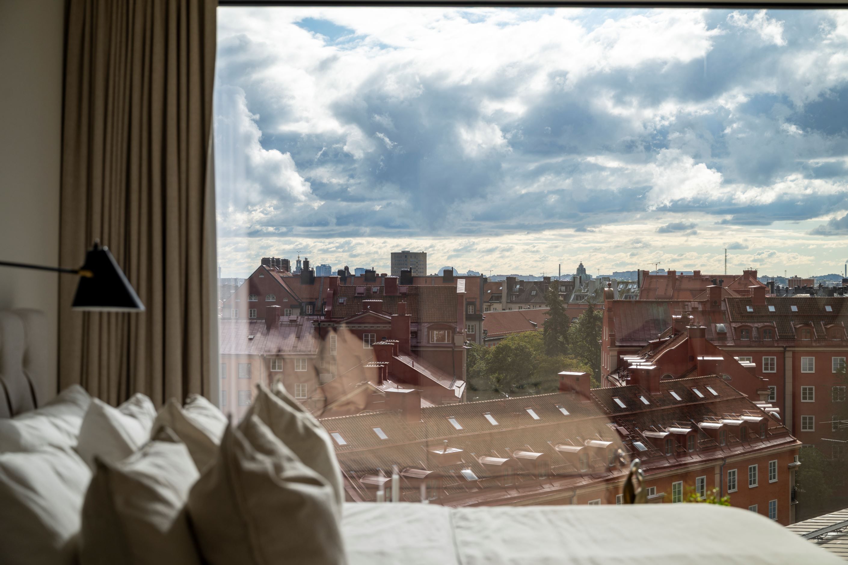 Utöver bostaden erbjuds en boendeservice i världsklass med gym, bastu, biosalong, gästlägenhet och en gemensam takterrass på 34:e våningen med milsvid utsikt över Stockholm.