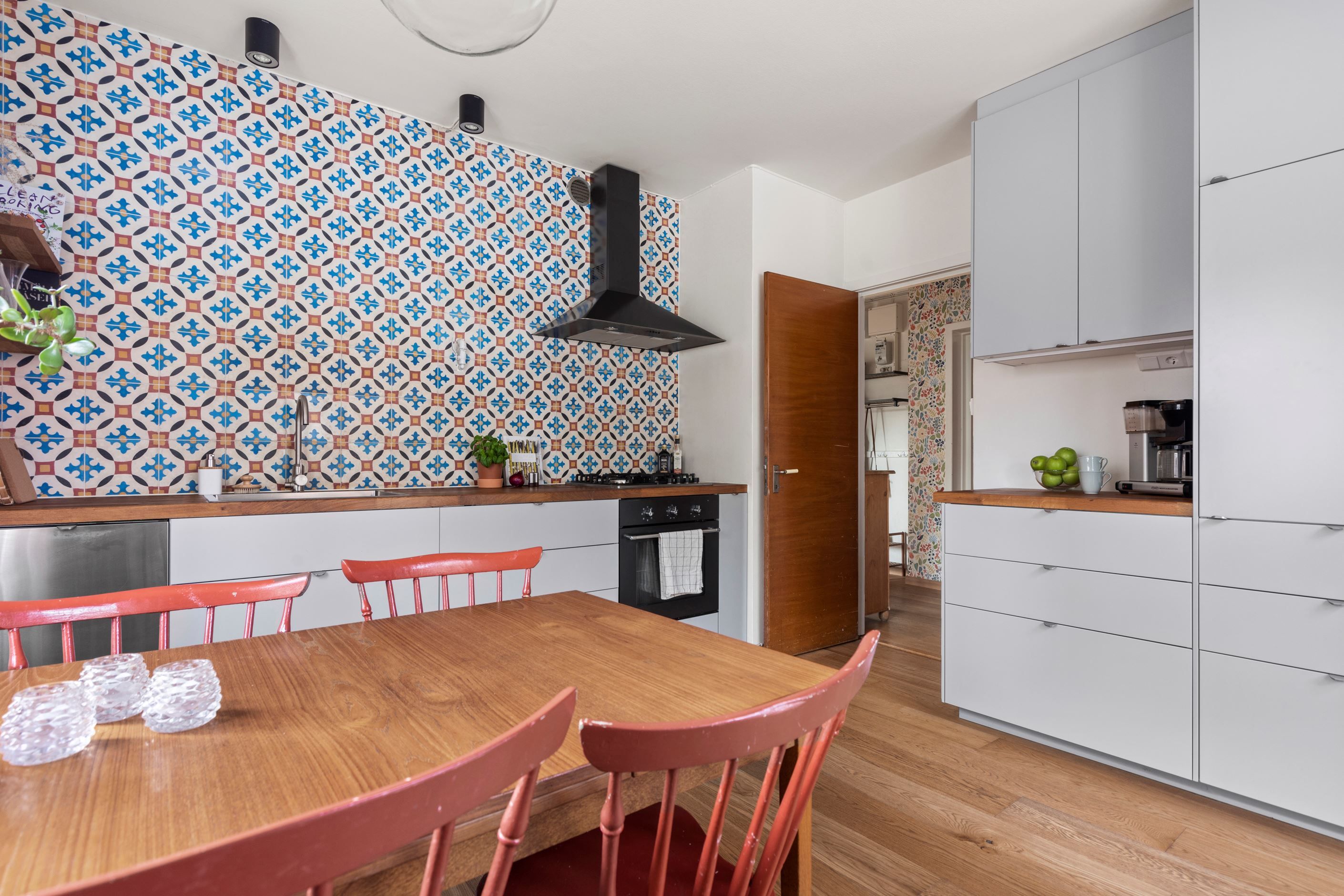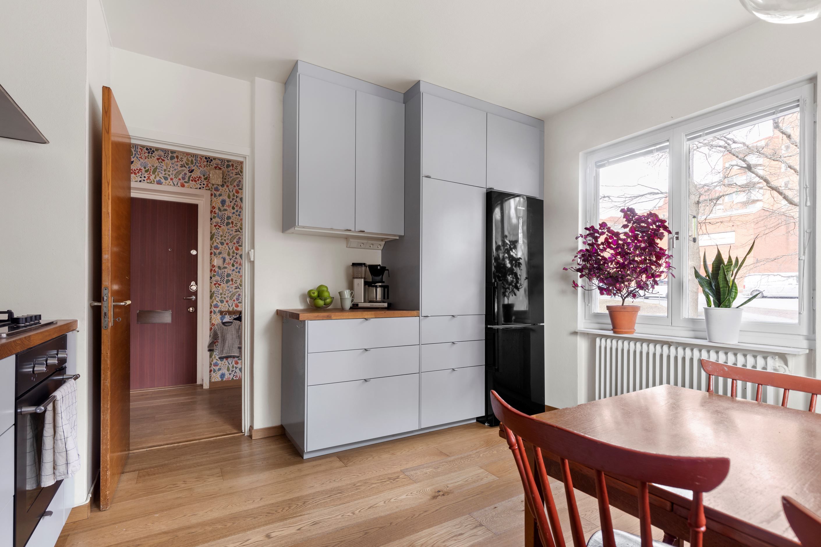 Lägenheten ligger i ett funkishus från 1949. Gavelläget med ljusinsläpp från tre väderstreck skapar ljus och rymd. Solig och möblerbar balkong i söder med fint lummigt läge. Balkongen är en egen oas för en kaffe eller god bok. Vardagsrum med plats för soffa och tv-bänk, i den platsbyggda delen av vardagsrummet finns ett litet sovrum eller utrymme för hemmakontoret. För den som vill går det går enkelt att återställa om man hellre vill ha ett lyxigt stort vardagsrum. Fint renoverat kök med gott om förvaring, goda arbetsytor och plats för matbord där det går att duka upp middagar för stort sällskap. Rymligt sovrum med utrymme för dubbelsäng, förvaring och skrivbord. Helkaklat badrum med badkar samt litet fönster som ger behagligt ljusinsläpp. Bra förvaring i praktisk klädkammare, inbyggd garderob och dessutom tillhörande förråd i källaren som är på ca 9 kvm samt ett matkällarförråd.