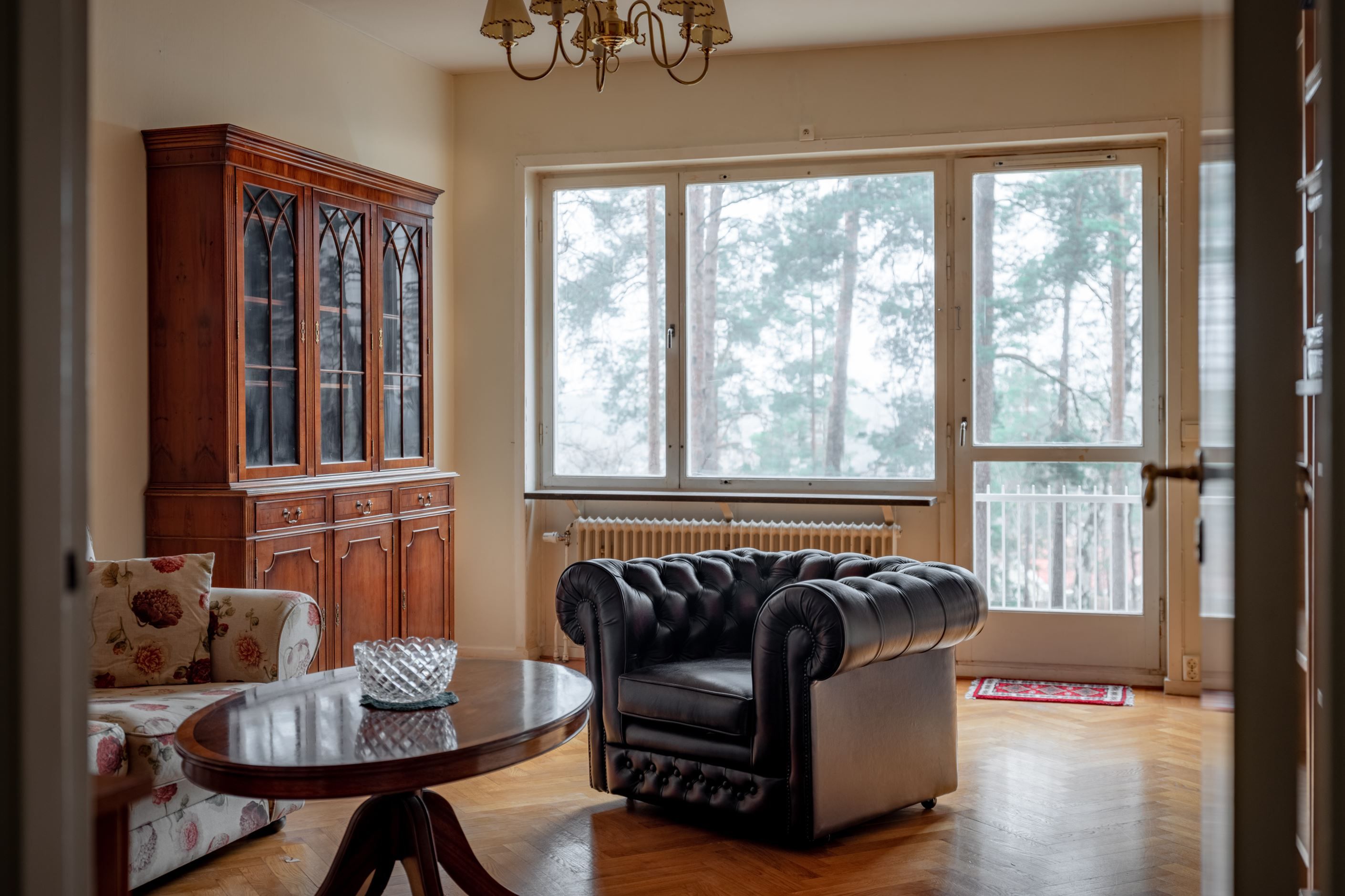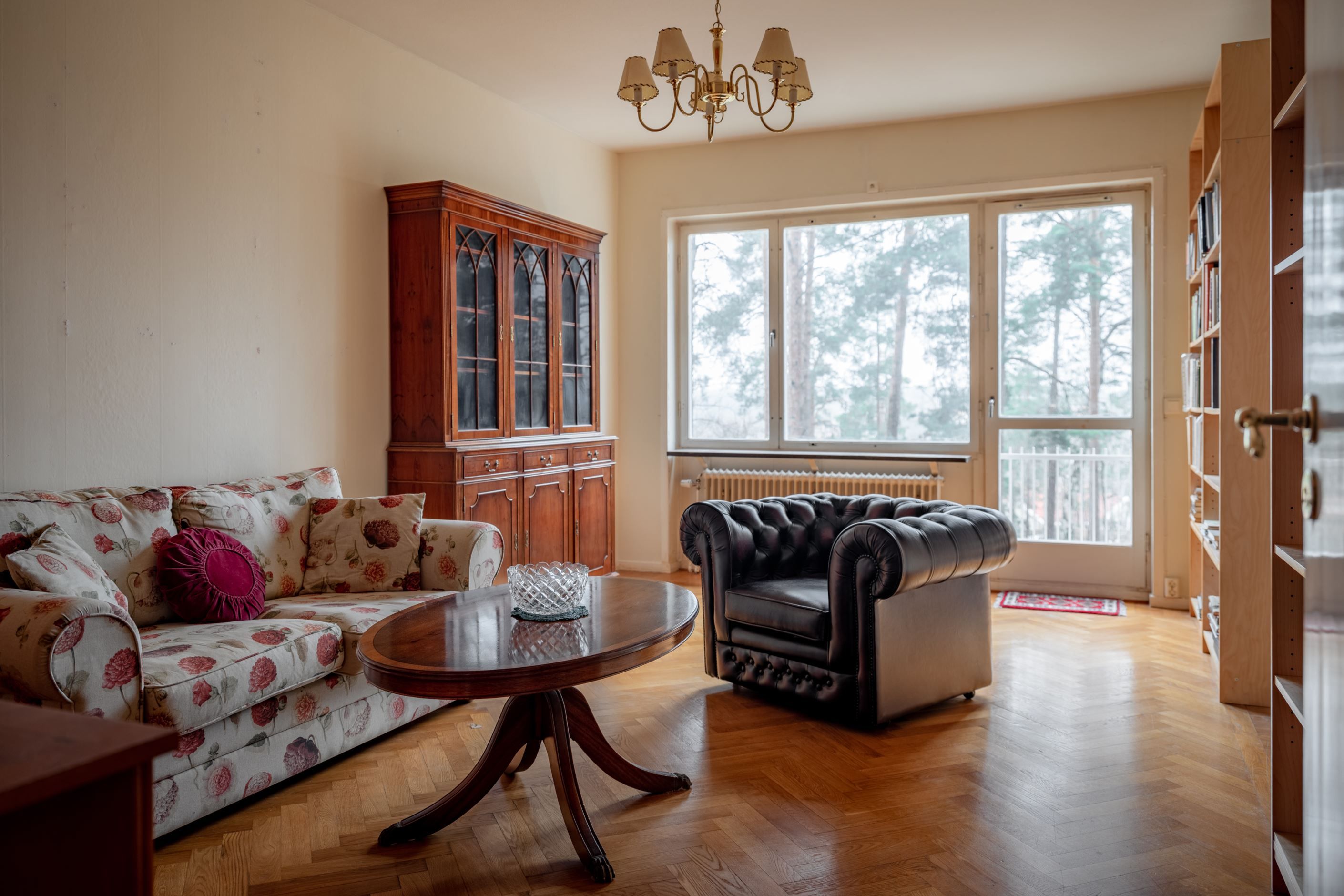 Ljusinsläpp i två väderstreck och en takhöjd om 2,70 m ger lägenheten härligt ljus och rymd. Balkong och fransk balkong mot naturen. Låg avgift. Vardagsrum med fiskbensparkett och vackert fönsterparti med skiva i sten. Generöst sovrum. Original kök med plats för frukostbord. Badrum med fönster. Stor klädkammare.