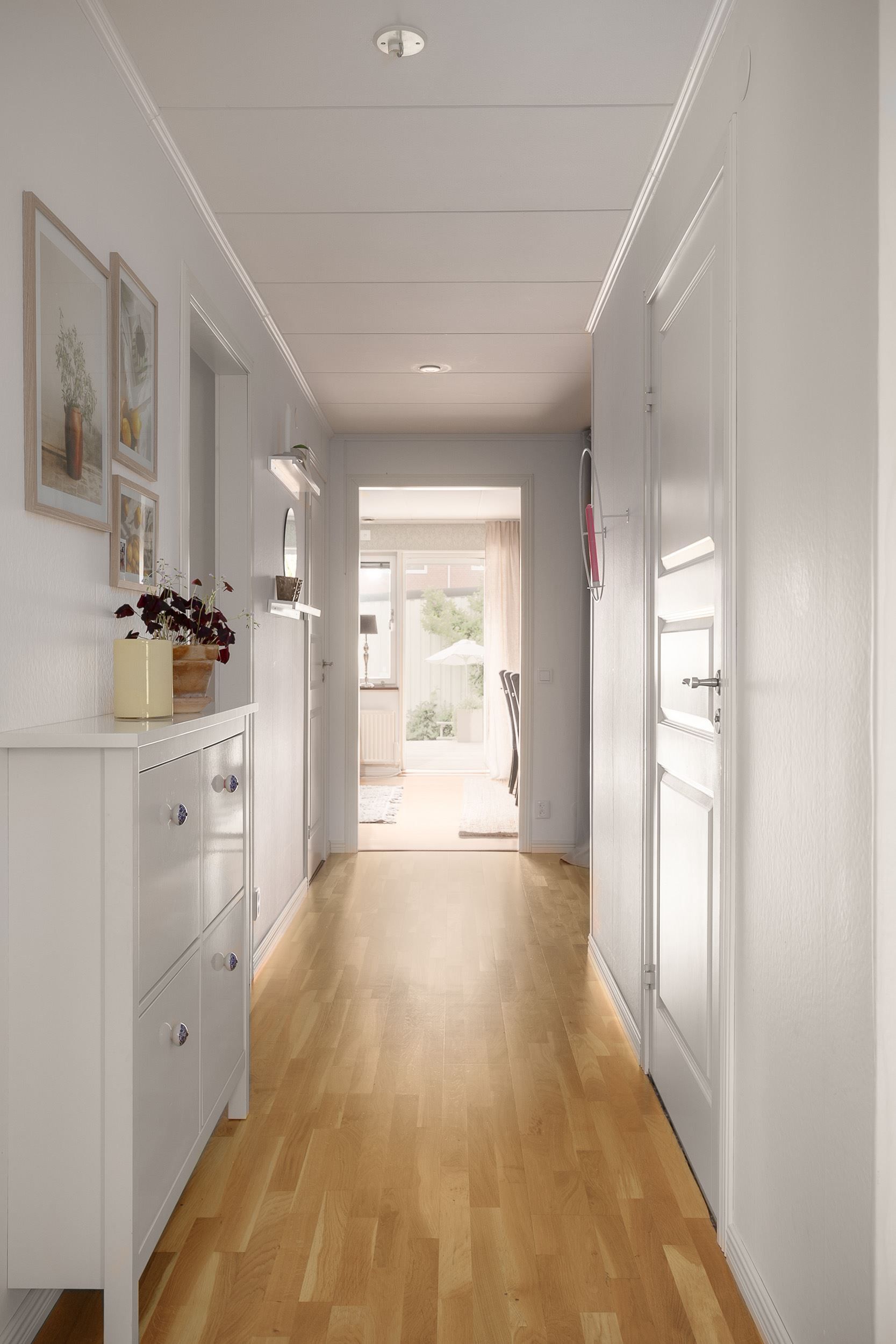 Entréplanet rymmer också ett fräscht badrum med kaklade väggar och golv, dusch, wc samt en stor kommod med spegel. Den praktiska tvättstugan är uppdaterad med en smidig kombimaskin för tvätt och tork.