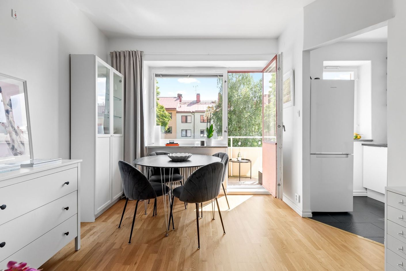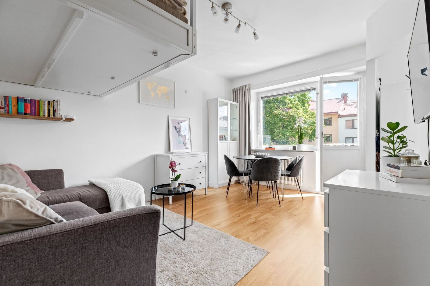 Idealisk som första bostad – lättskött, yteffektiv och med låg avgiftStora fönster i ett insynsskyddat läge mot rogivande innergård, belägen vid en lugn enkelriktad gata. En smart och trivsam bostad som passar utmärkt som första boende.