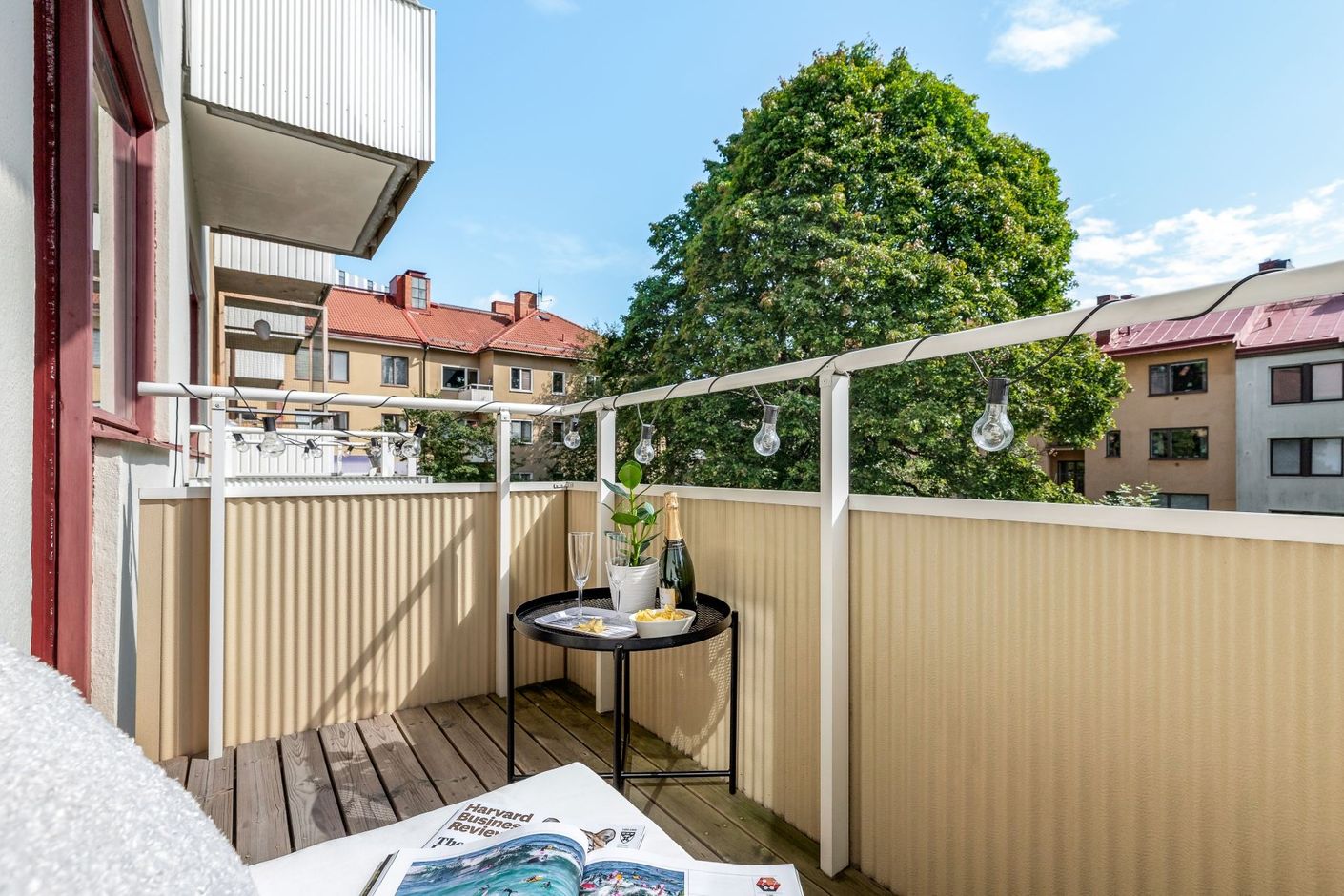 Fantastisk, möblerbar balkong i soligt söderläge med utsikt över föreningens grönskande och lugna innergård – en perfekt plats för umgänge med vänner och familj.