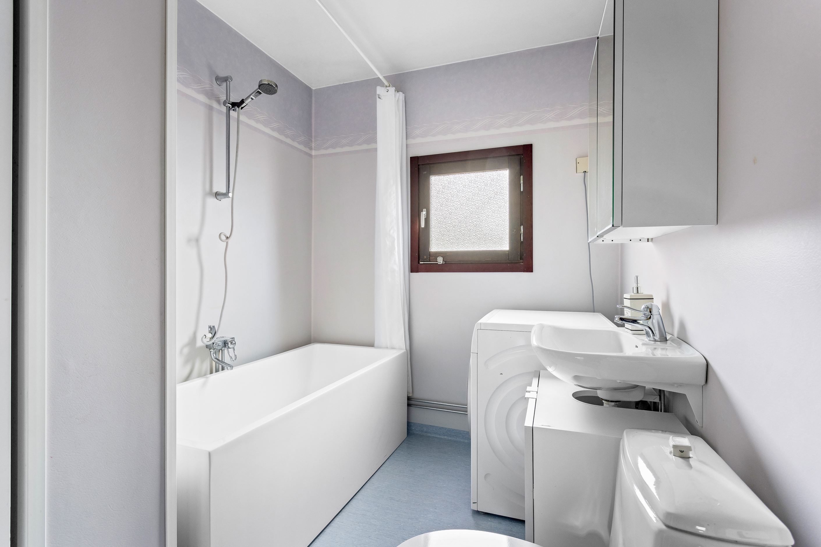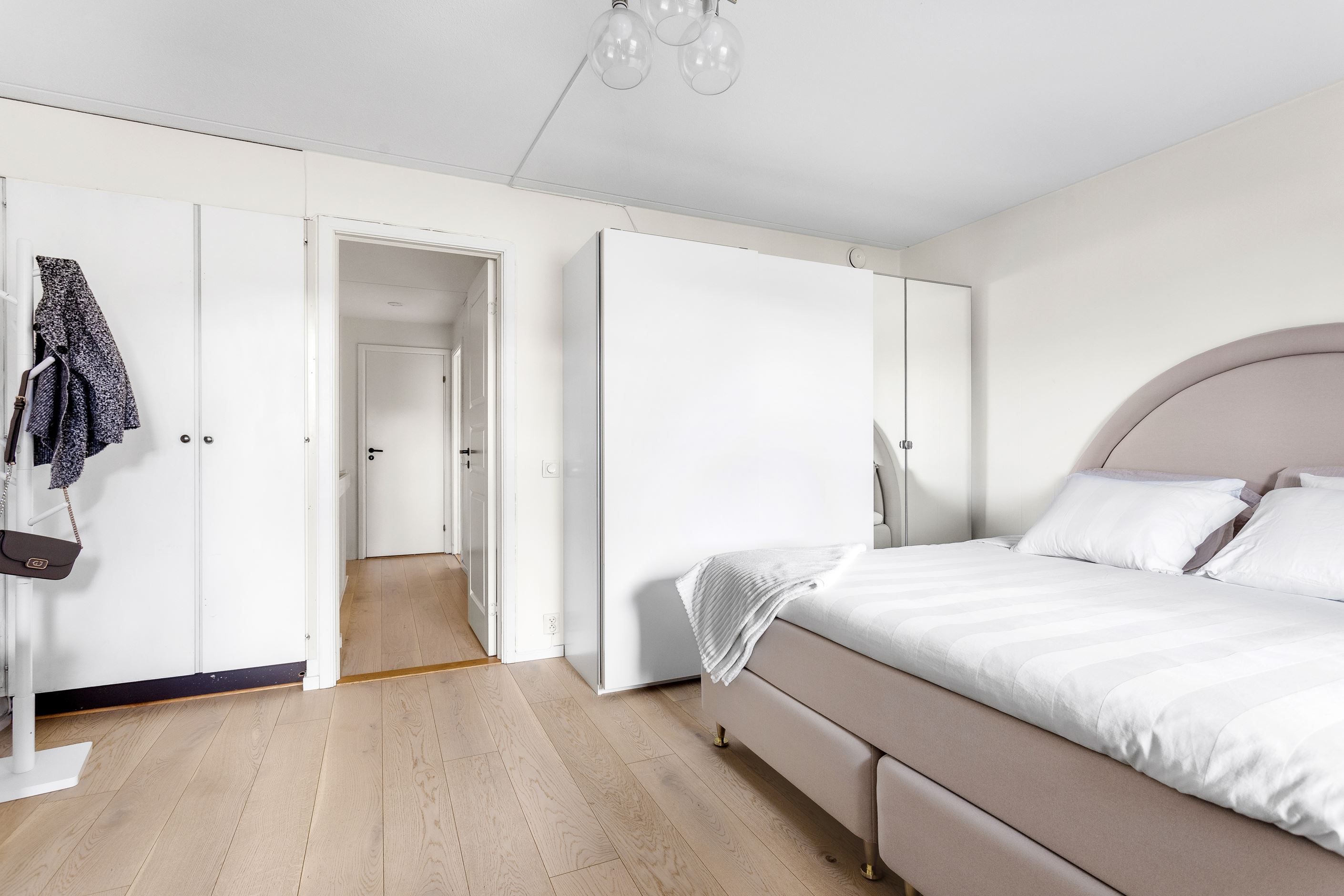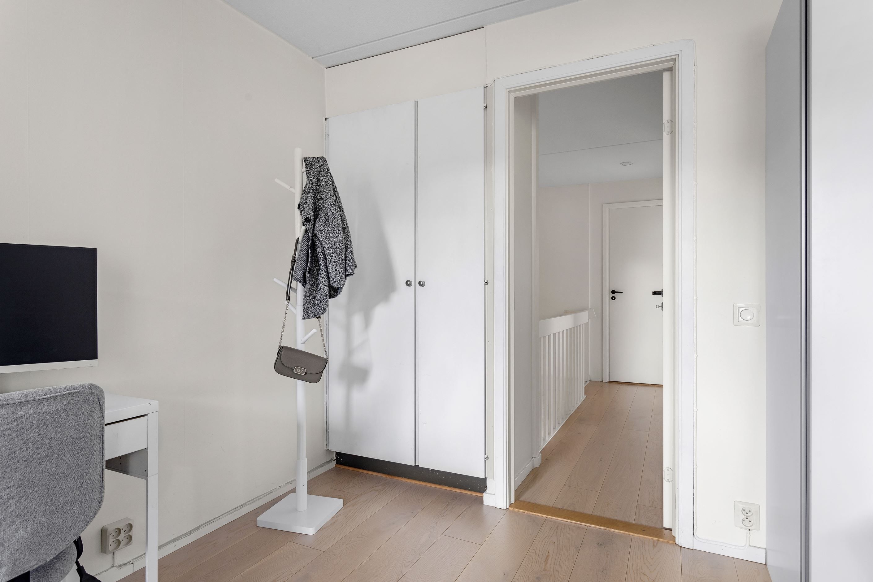 En trappa upp kommer ni upp till bostadens samtliga rum, dvs familjens privata avdelning. På övre plan finner ni ett stort sovrum med plats för säng och garderober. Från sovrummet nås den härliga balkong undertak med vy mot husets bakgård. Vidare erbjuds ett ytterligare sovrum med plats för säng och förvaring. Intill ett av sovrummen finner ni även det stora badrummet utrustat med tvättmaskin som underlättar vardagens bestyr