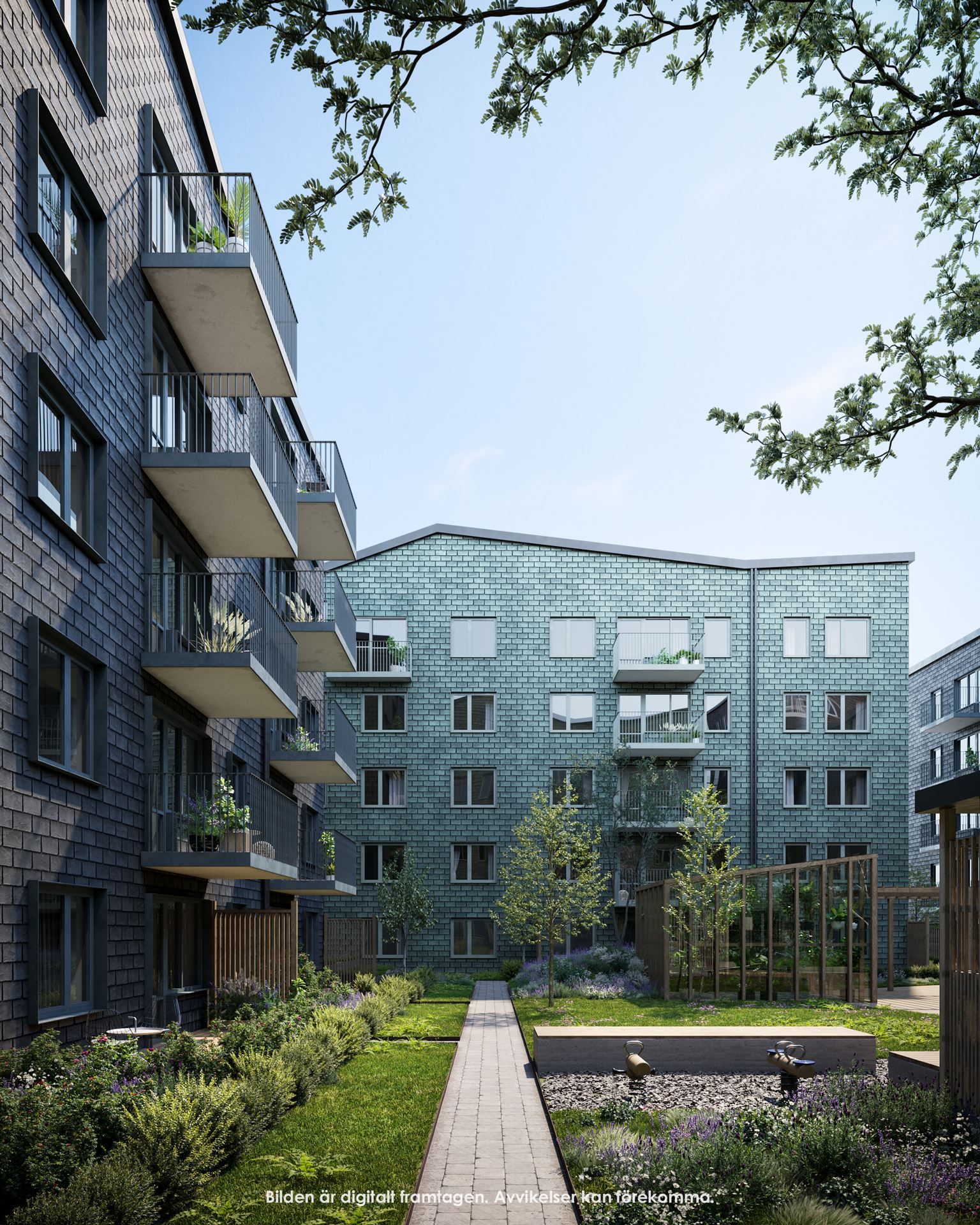 Den gemensamma gården blir hjärtat i kvarteret och en grön oas att vistas på under vår- och sommartid. Runt gården ligger fem olika huskroppar som alla har sin egen identitet och karaktär. Samtliga hus har vackra fasader av det gedigna och miljövänliga naturmaterialet skiffer, i skiftande kulörer och mönster. Ett varierat taklandskap binder ihop kvarteret och tillsammans med de skiftande skifferfasaderna bidrar de till att ge kvarteret sin alldeles egna identitet i stadsdelen.