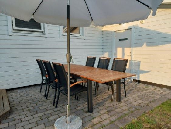På husets framsida finns en altan med vindskydd som erbjuder morgonsol och en glimt av Fårösundet. Den inglasade altanen bjuder på härlig eftermiddagssol och här finns även en stenbelagd uteplats där du kan duka upp trevliga middagar.