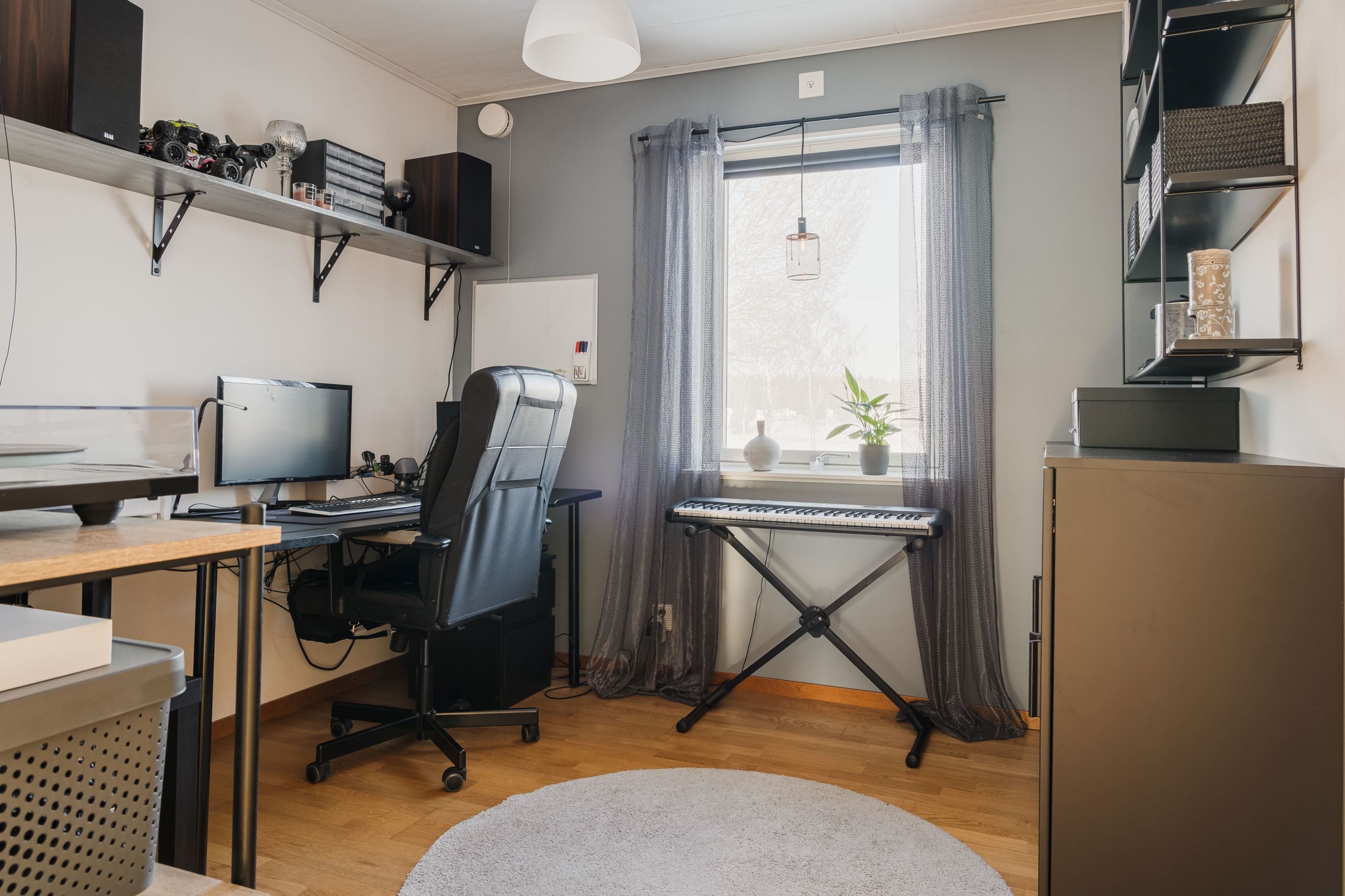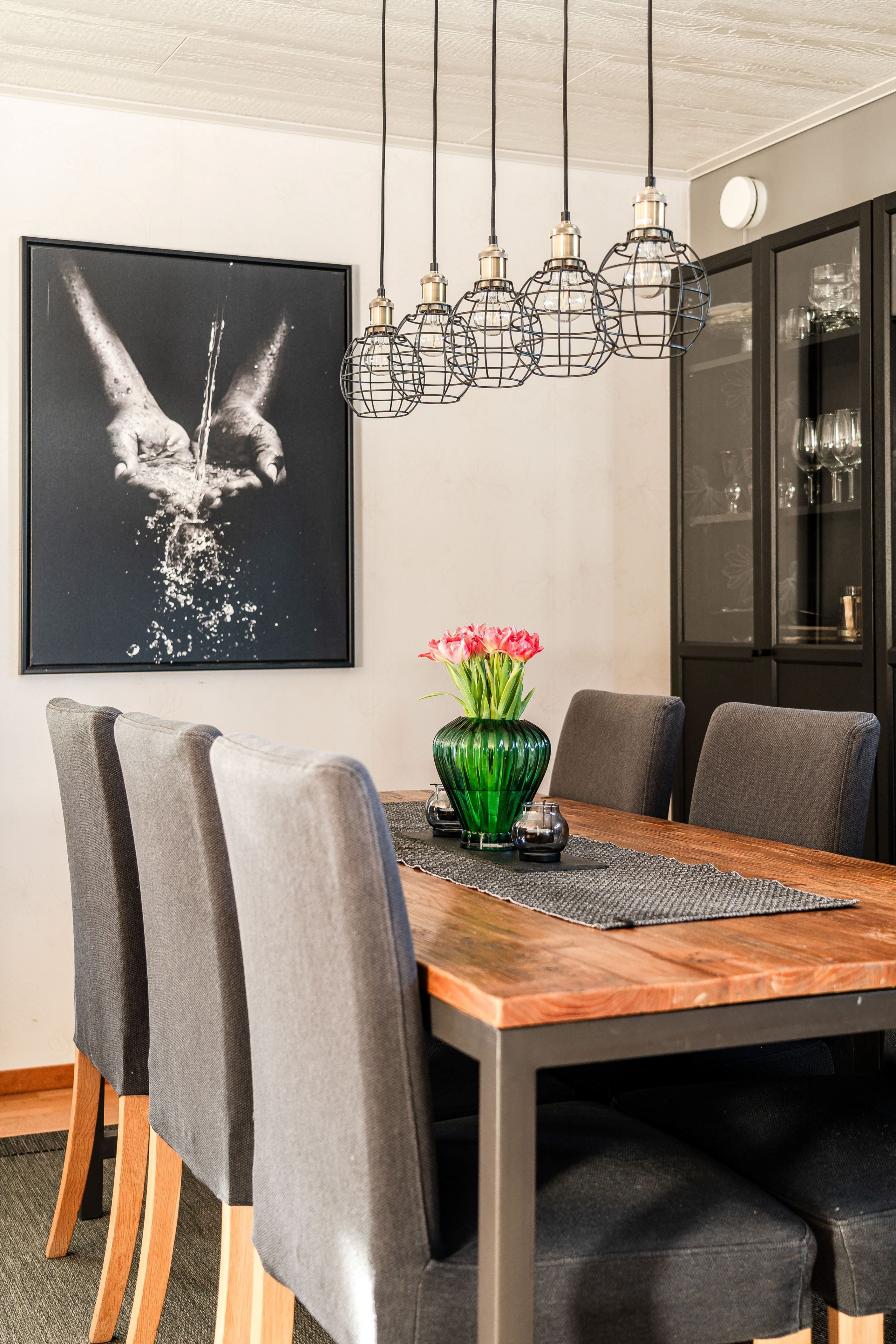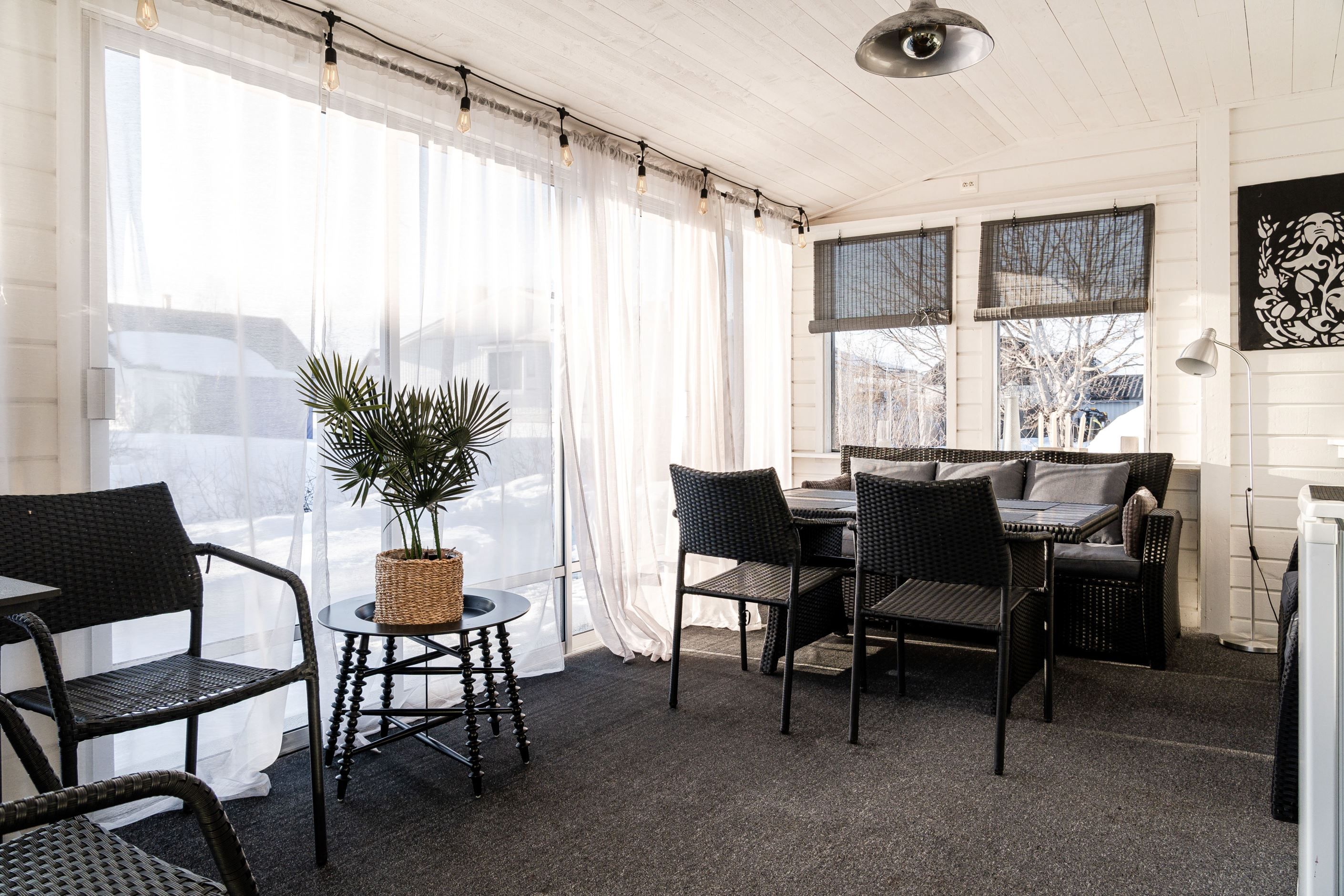 Bostadens hjärta är den generösa öppna planlösningen mellan vardagsrum, matplats och det stilrena köket från Trisco, installerat 2017. Här finns gott om arbetsytor och plats för både vardagsliv och trevliga middagar i goda vänners lag. Den mysiga kaminen bidrar med både värme och trivsam atmosfär. Från vardagsrummet nås både altanen och den inglasade altanen, perfekta platser för avkoppling och sociala stunder året om.