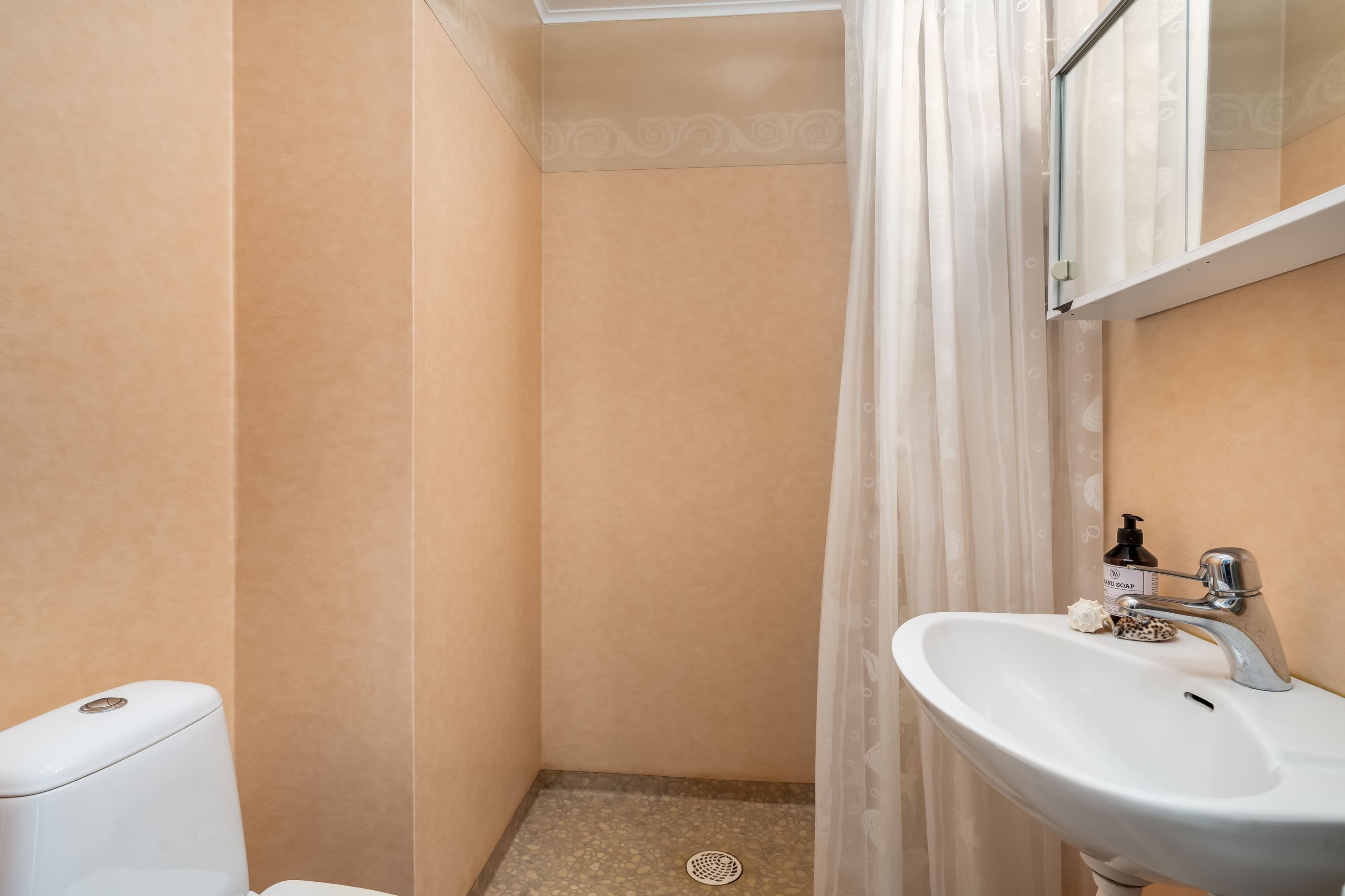 Ett av bad- och duschrummen har fönster i österläge, vilket ger ett fint morgonljus och förstärker känslan av gavelläge. Båda badrummen är praktiskt utformade med lättskötta plastmattor som förenklar vardagen.