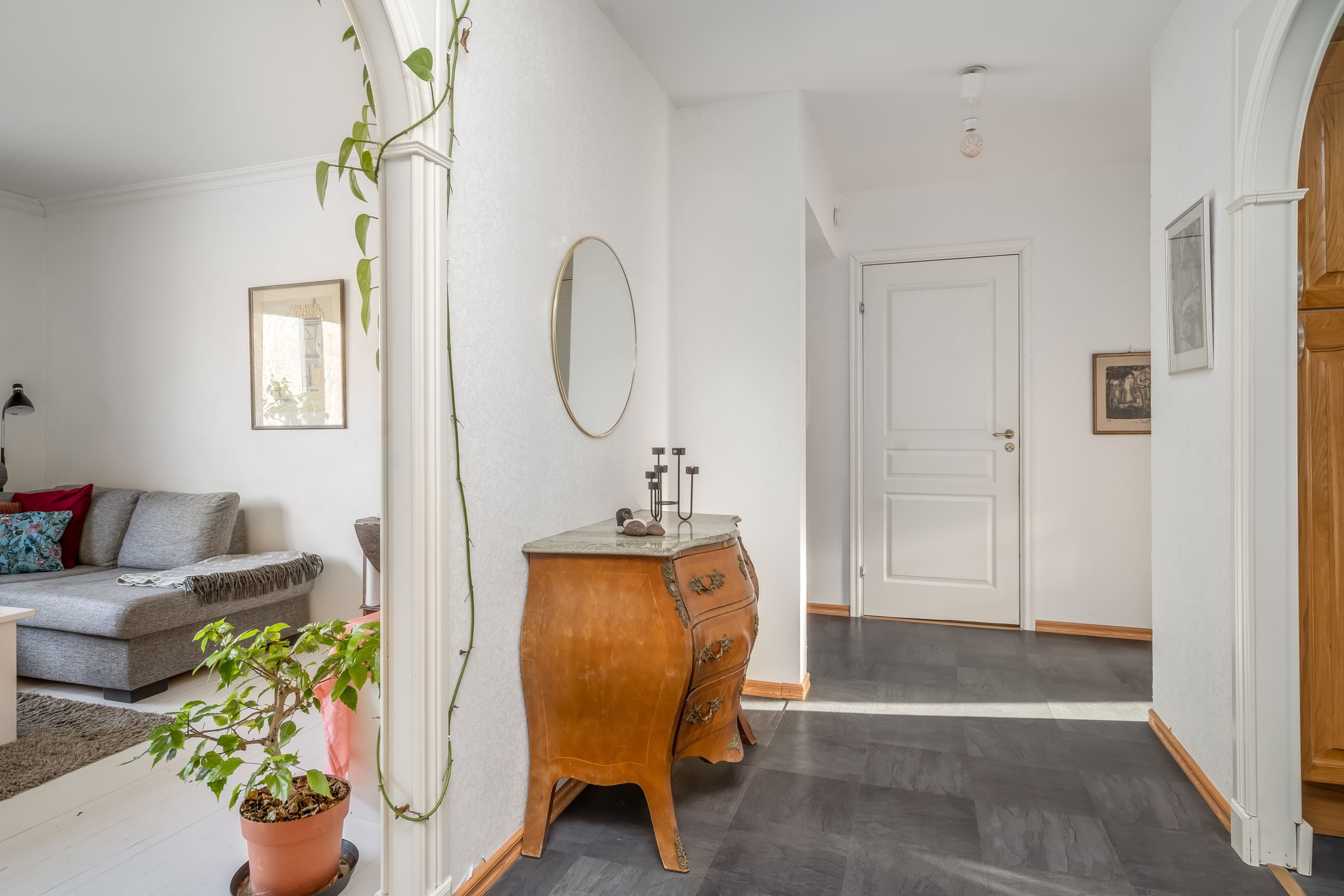 På tredje våningen ligger denna välplanerade gavellägenhet med fönster i flera väderstreck – söder, norr och öster – vilket ger ett generöst ljusinsläpp och en luftig känsla genom hela bostaden. Den genomgående planlösningen gör att hemmet upplevs öppet och trivsamt, oavsett tid på dagen.