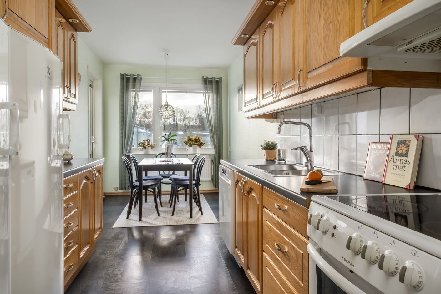 Från köket nås balkongen i soligt söderläge, en naturlig plats för morgonkaffet eller en stund i solen. Köket är rymligt med generösa bänkytor och gott om plats för både vardagsmatlagning och gemenskap.