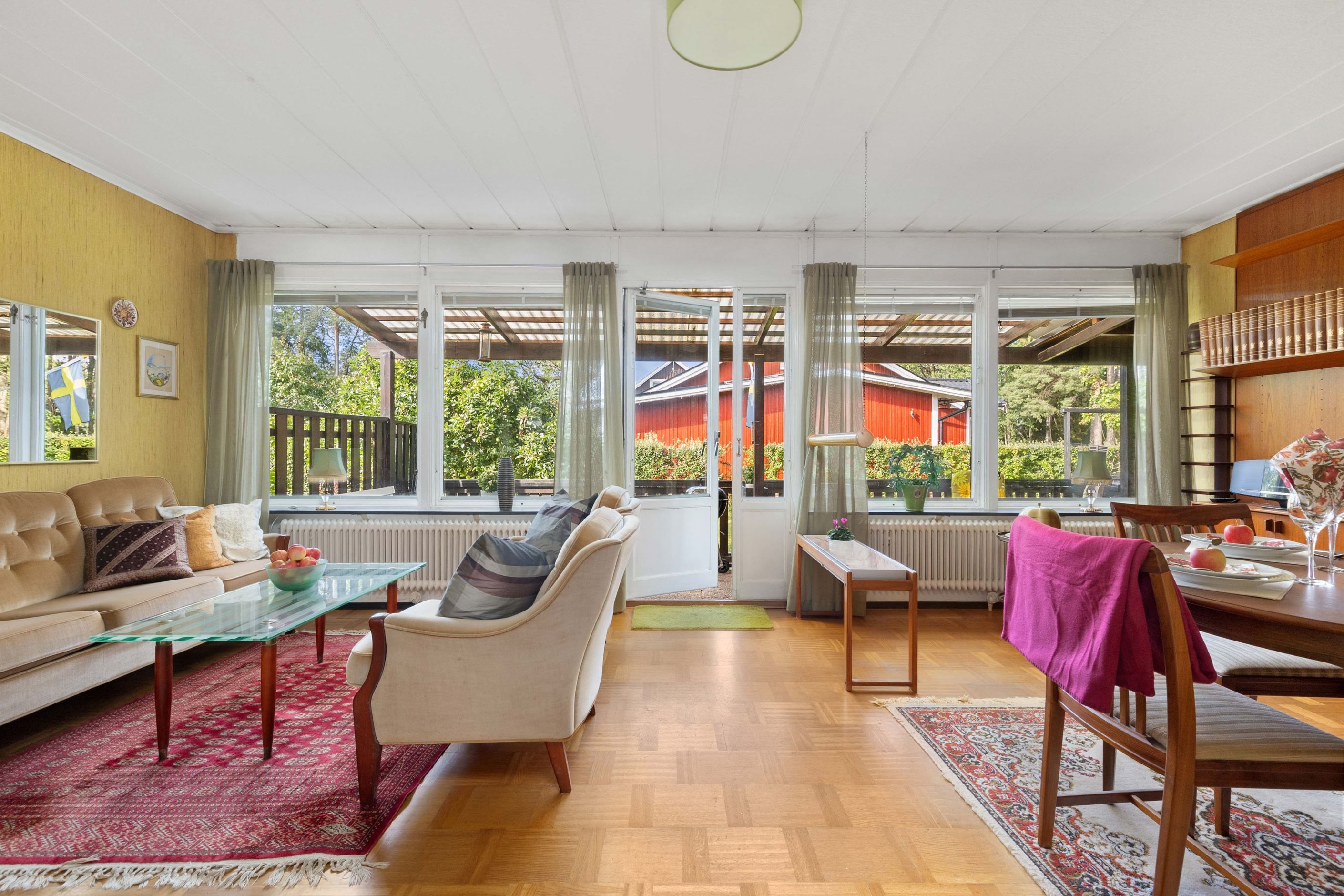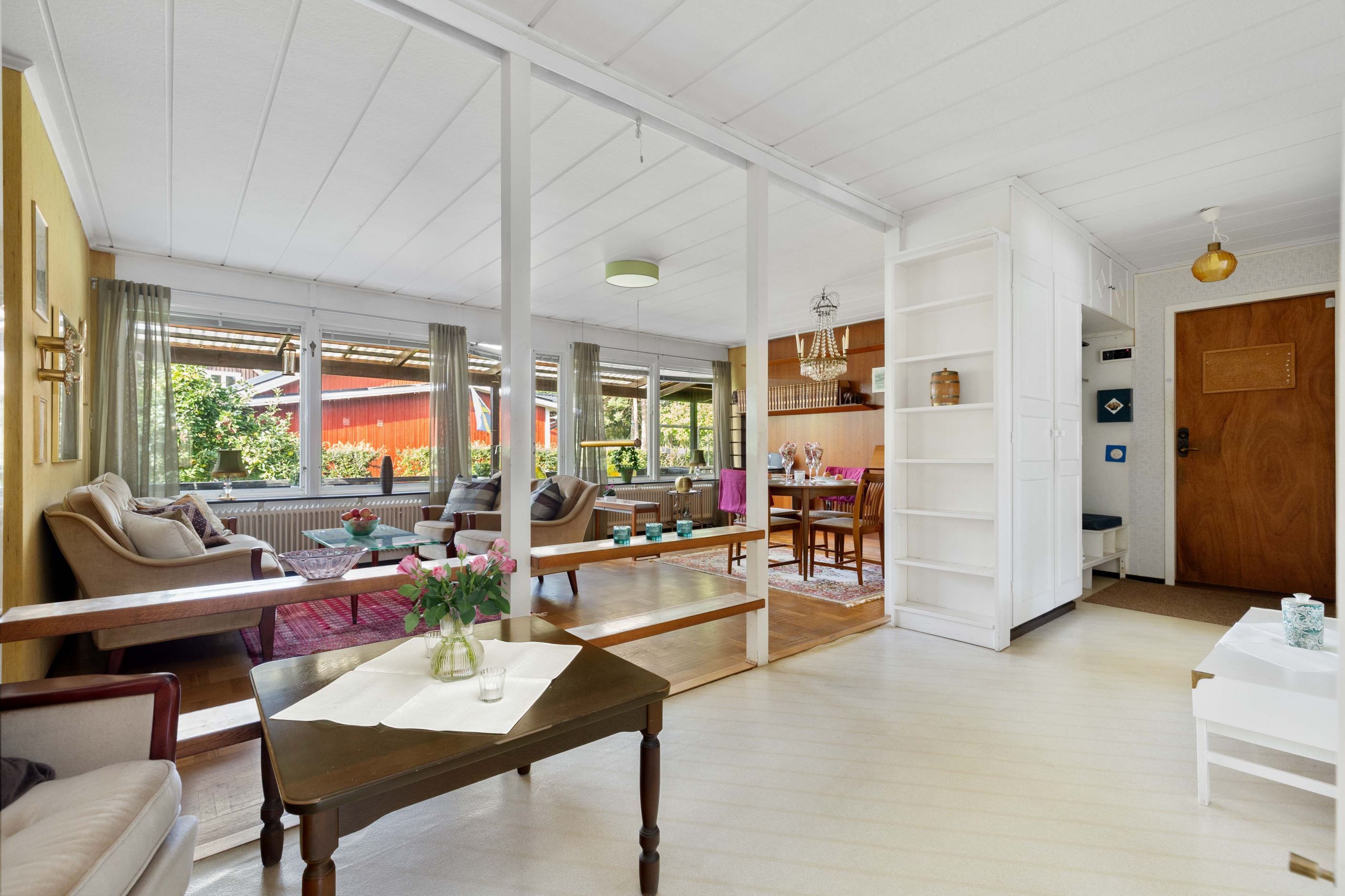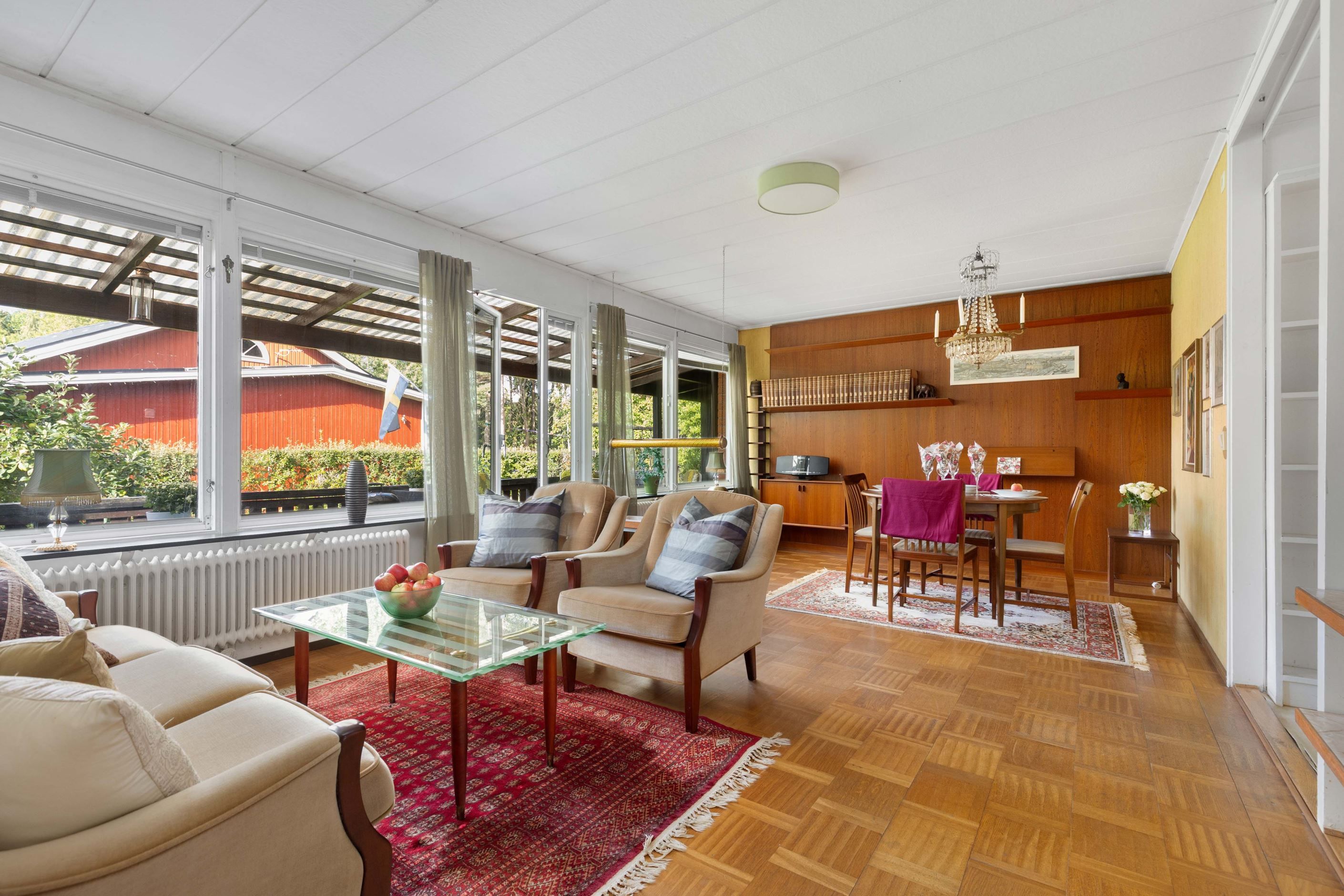 Vardagsrummet är rymligt och präglas av fint ljusinsläpp från stora fönsterpartier. Här finns gott om plats för både soffgrupp och matsalsdel, och från rummet nås uteplatsen och den soliga trädgården.