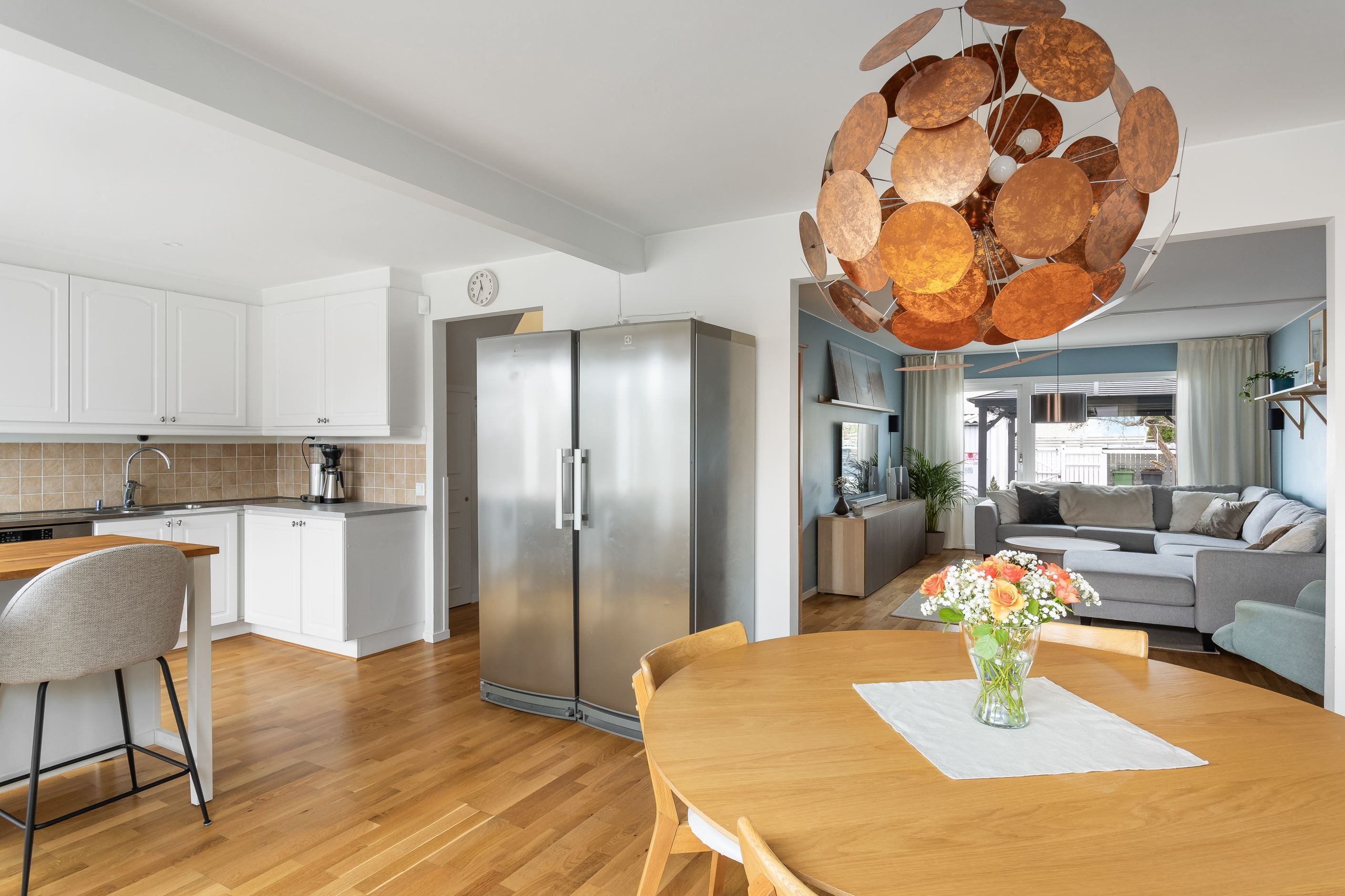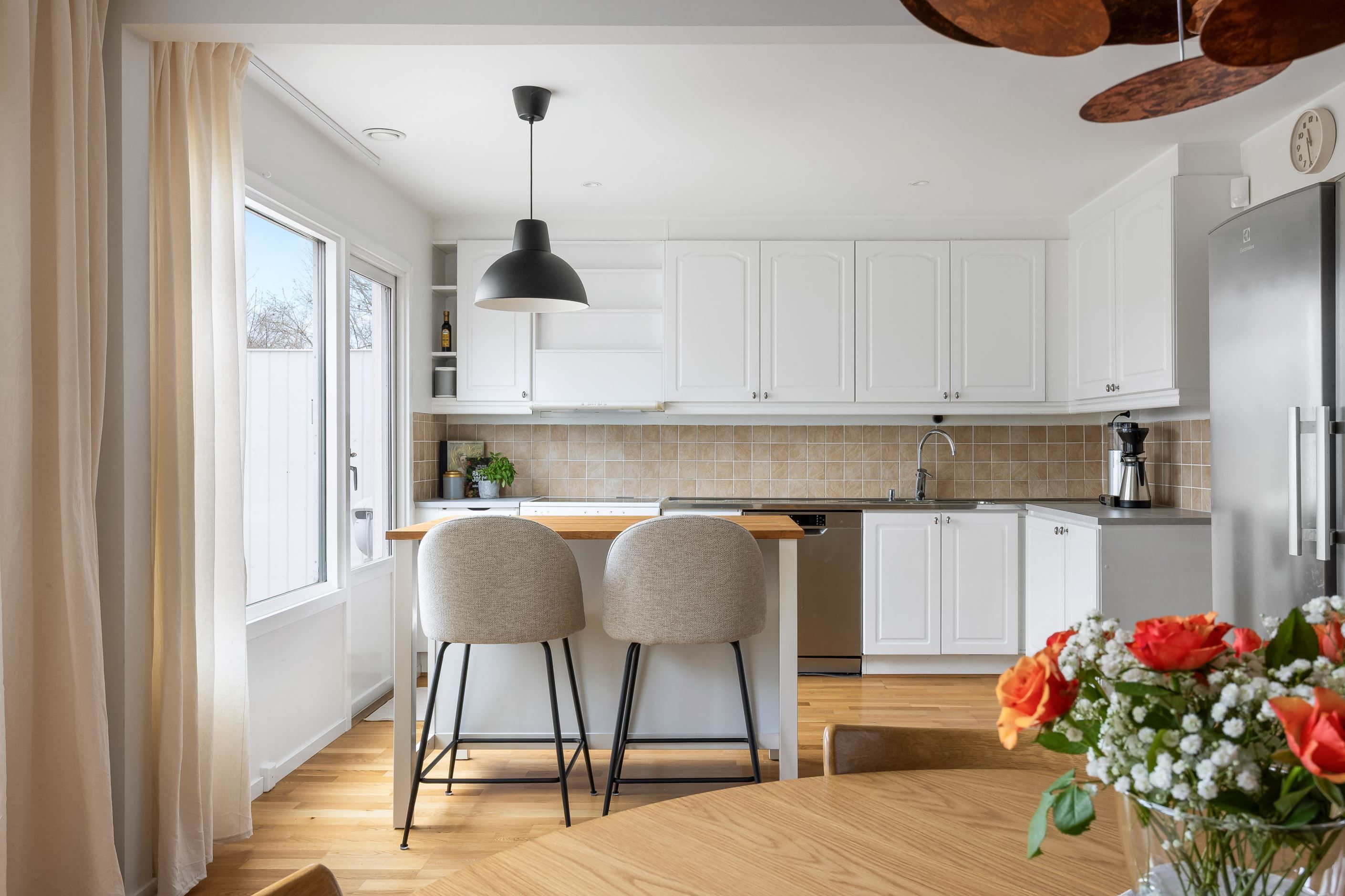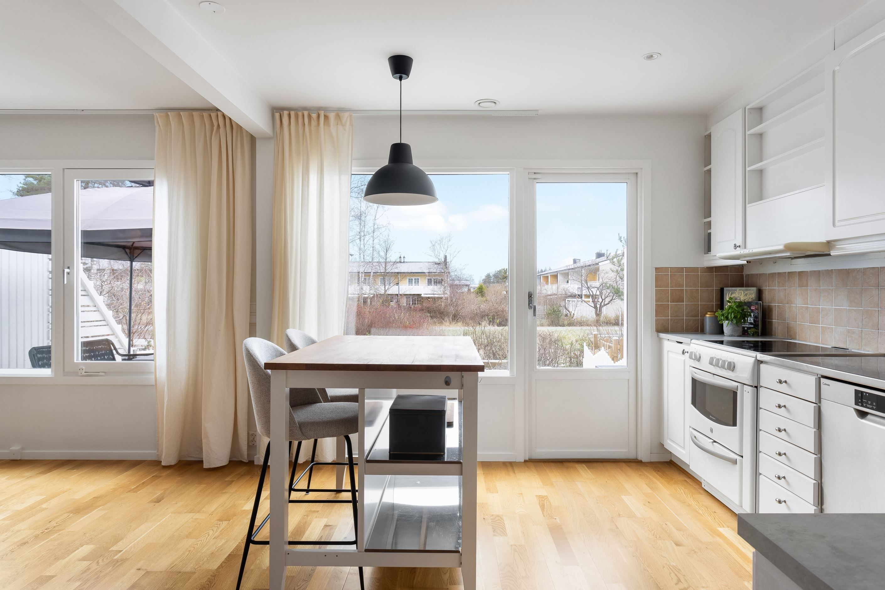 Från köket når du den stora altanen som vetter mot den grönskande baksidan och parken intill. Här finns gott om plats för både loungegrupp, grill och matbord – en skön plats att njuta av morgonkaffet, lata sommardagar och middagar i kvällssol.