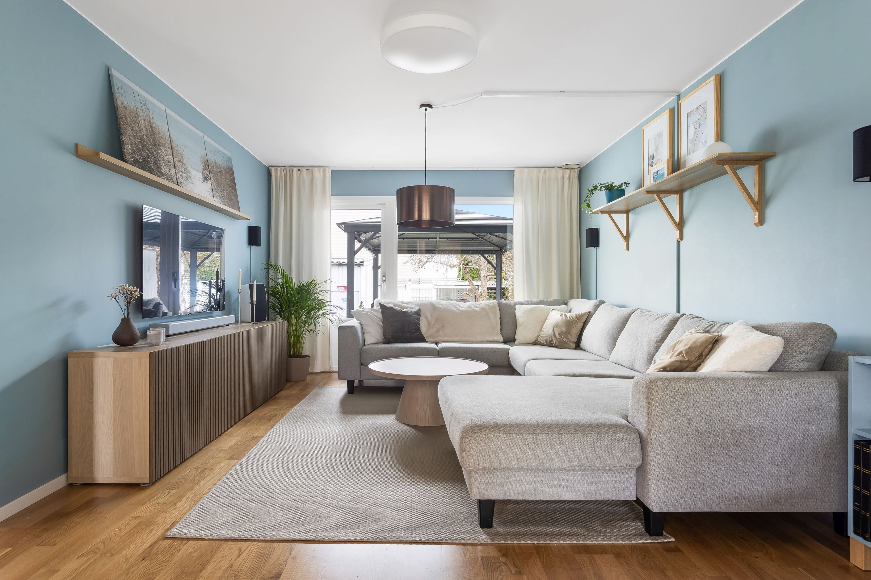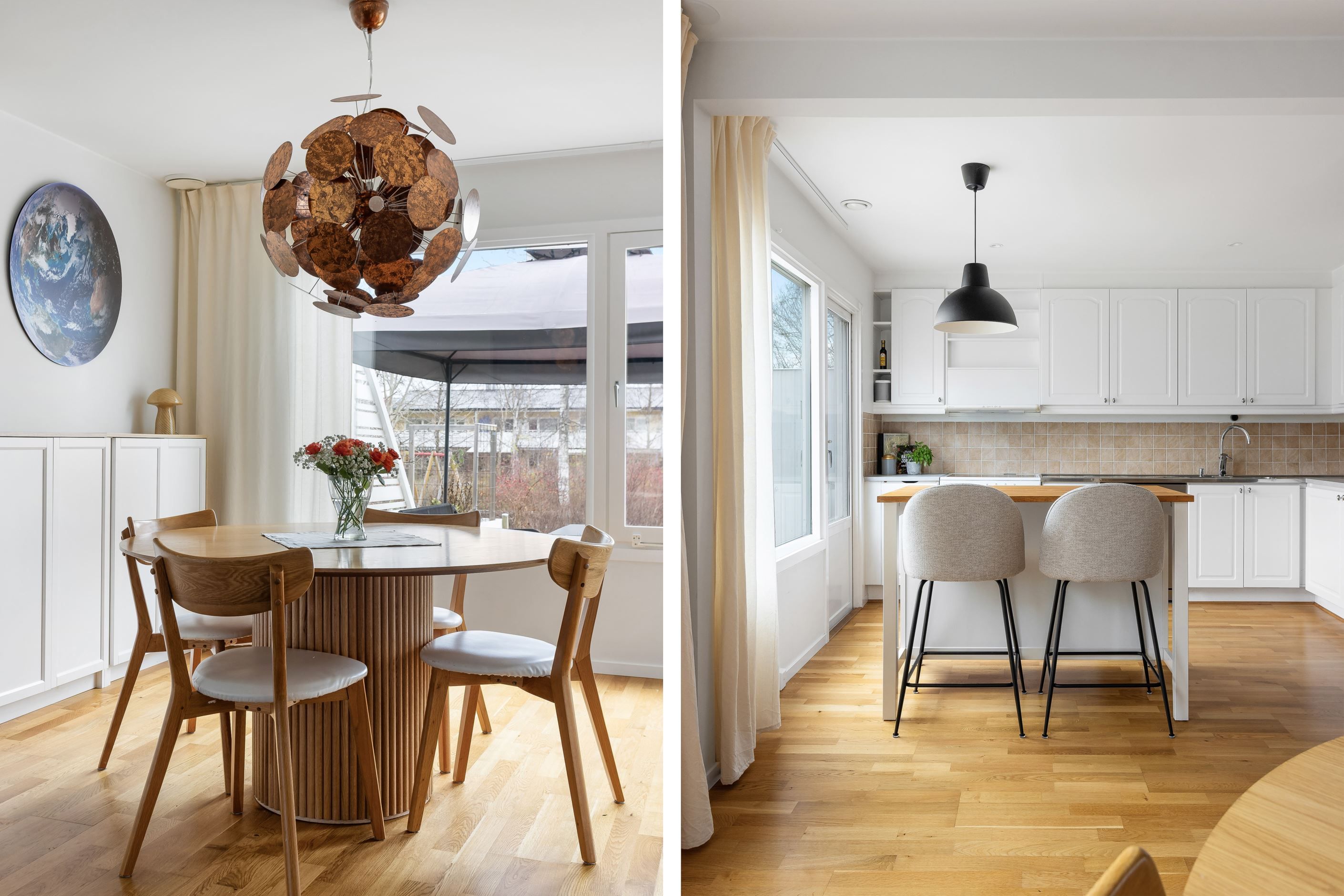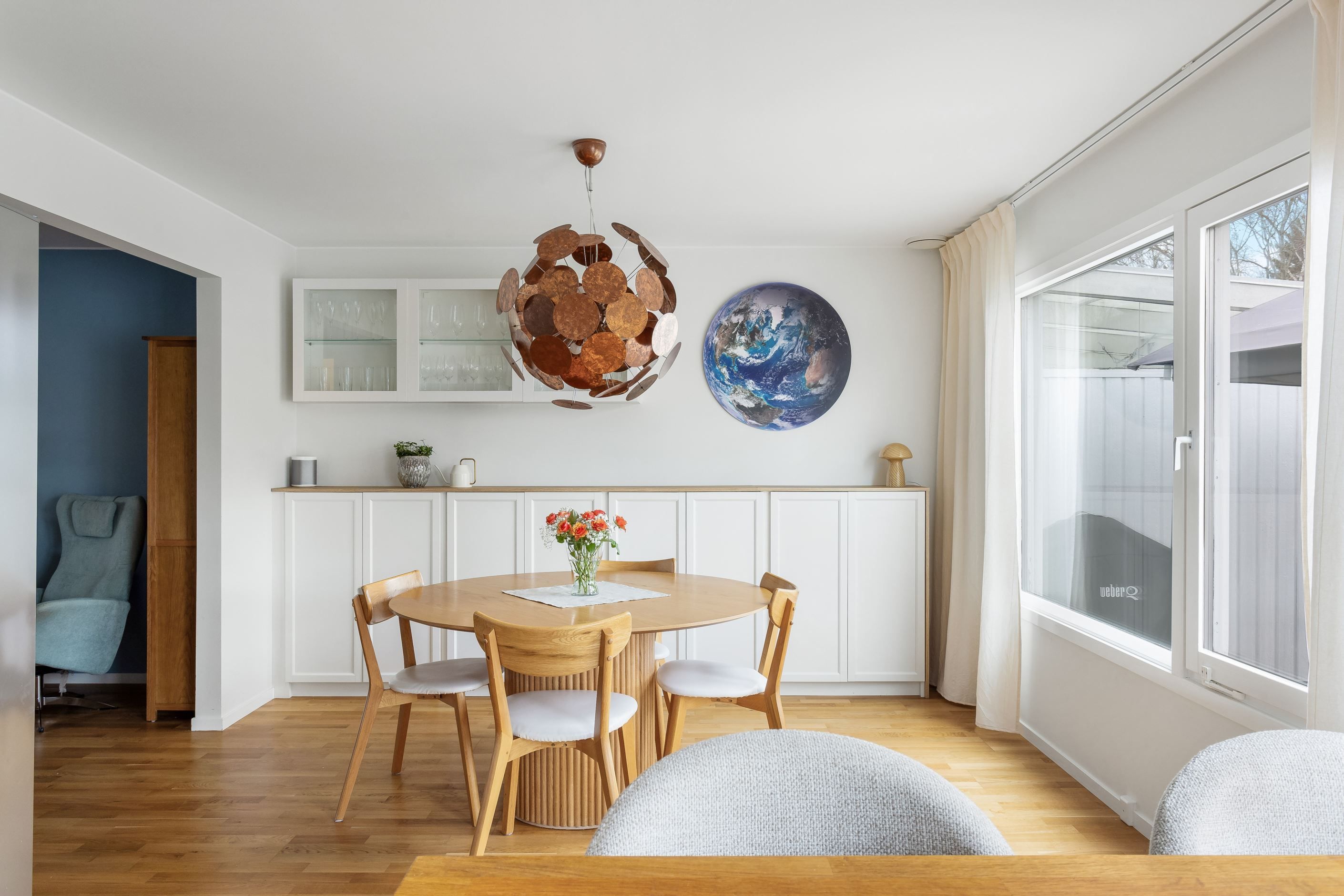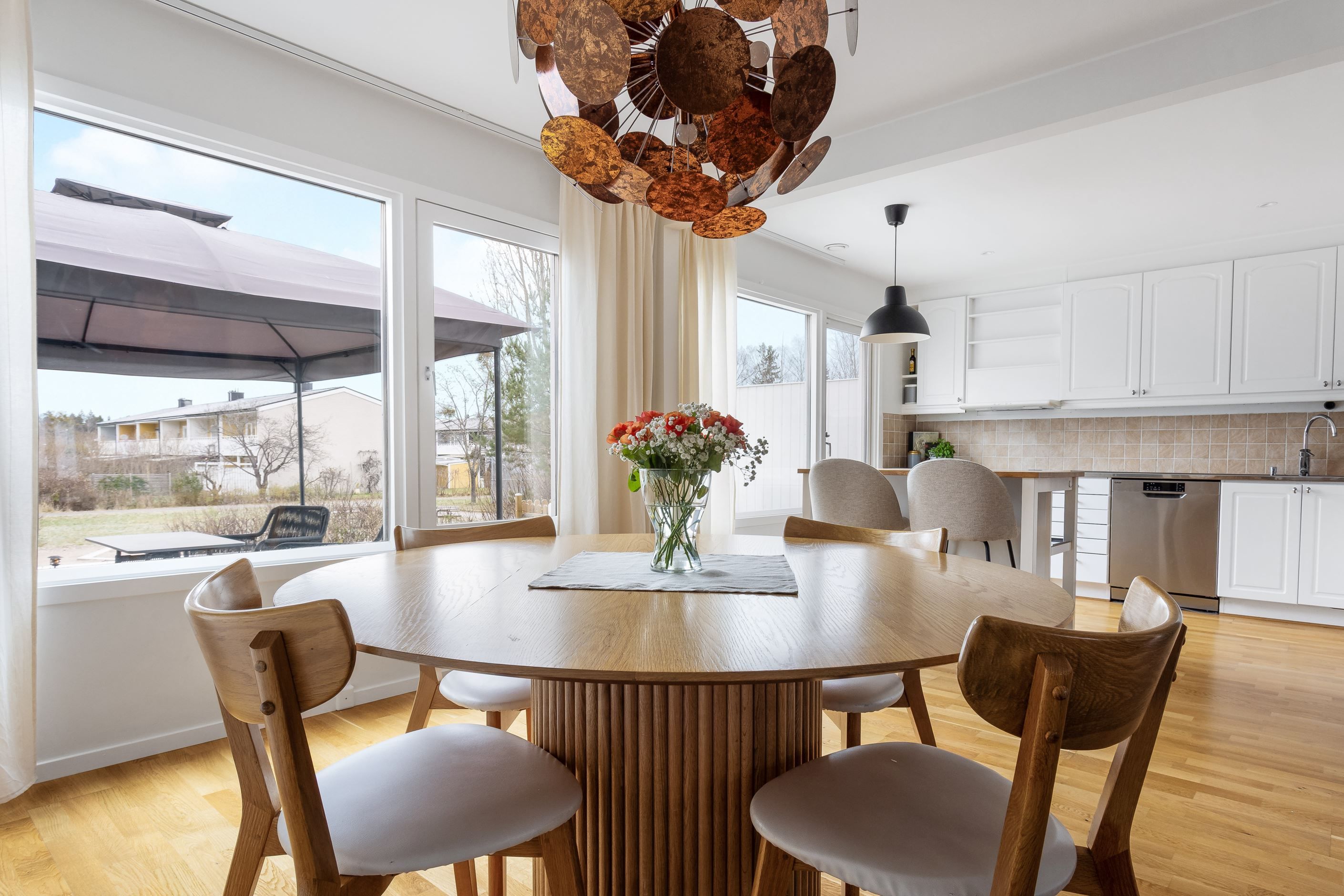 Från köket når du den stora altanen som vetter mot den grönskande baksidan och parken intill. Här finns gott om plats för både loungegrupp, grill och matbord – en skön plats att njuta av morgonkaffet, lata sommardagar och middagar i kvällssol.