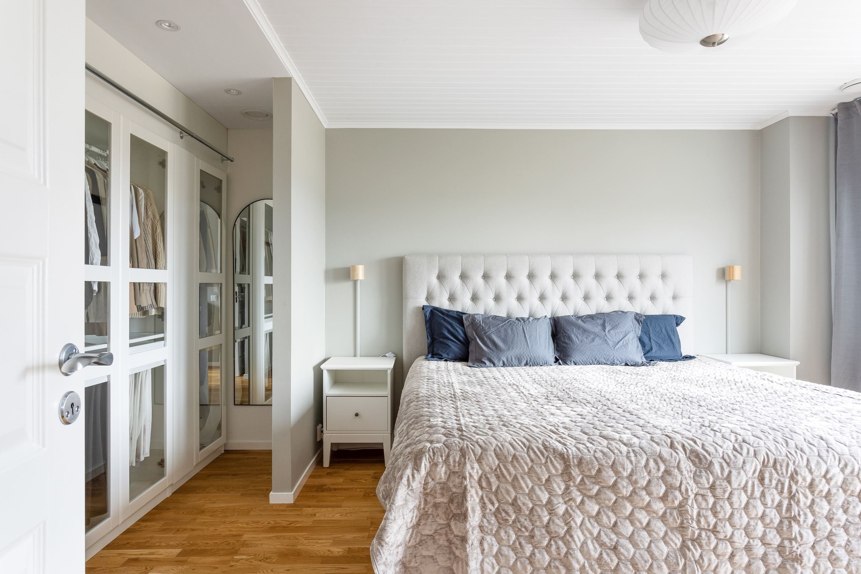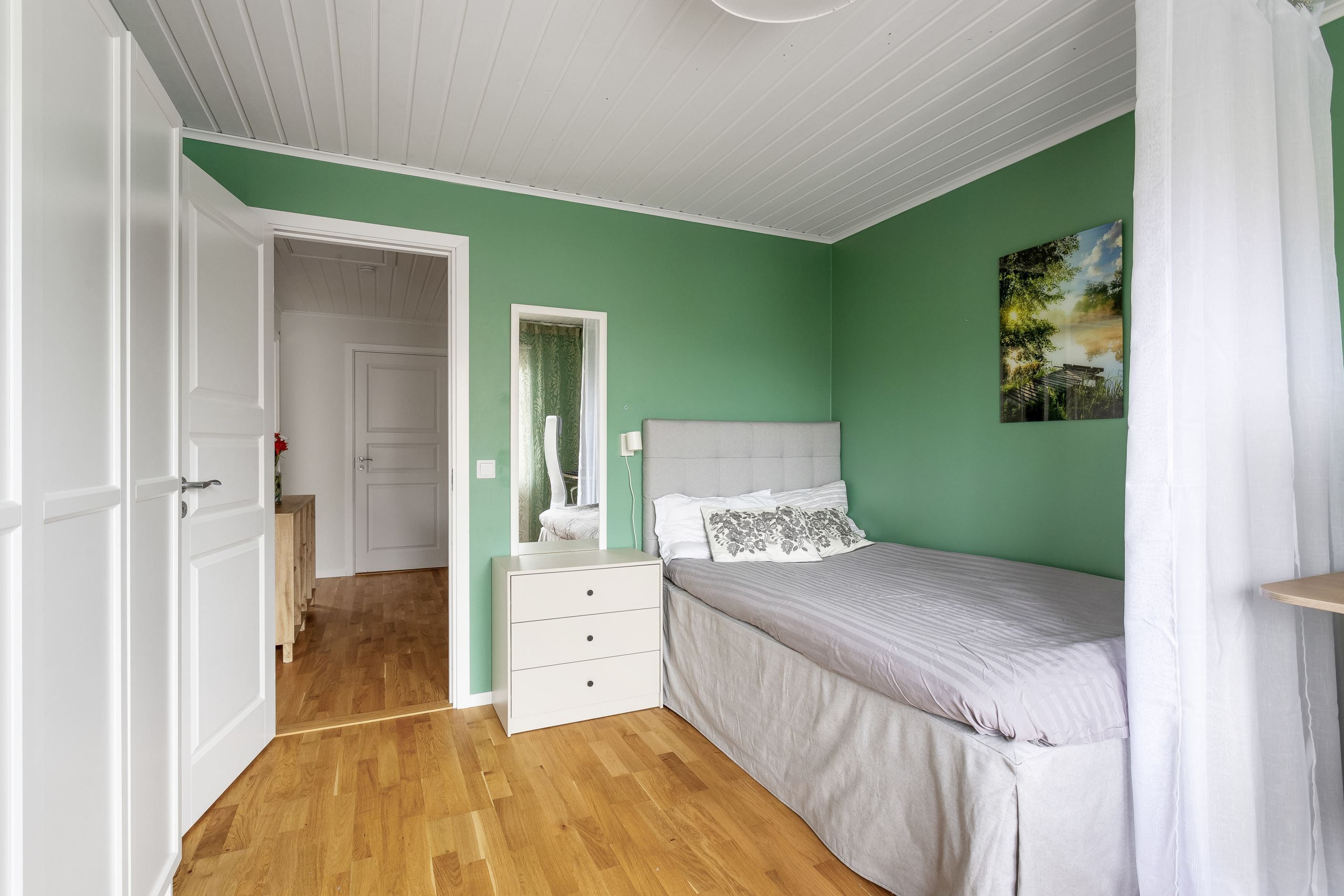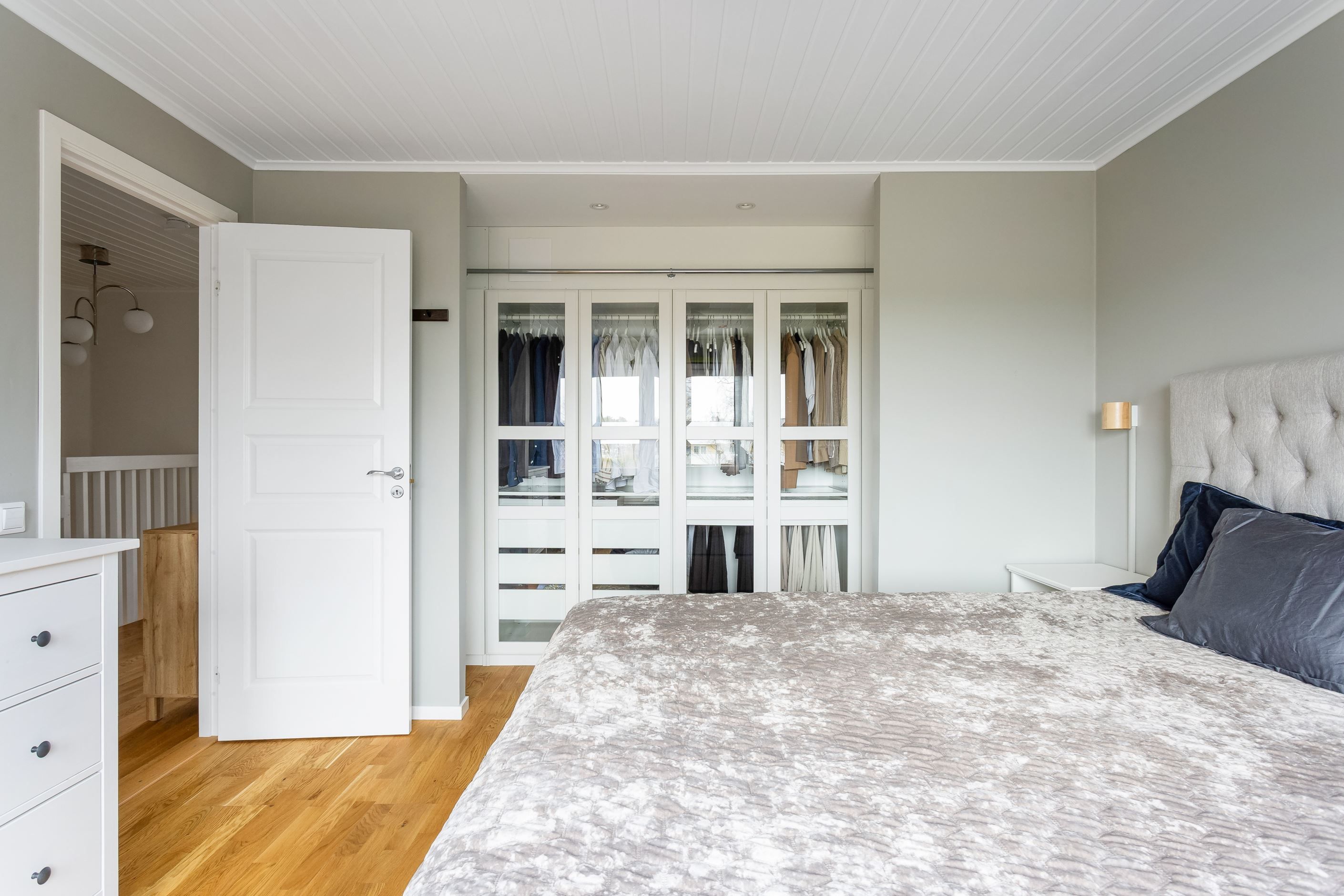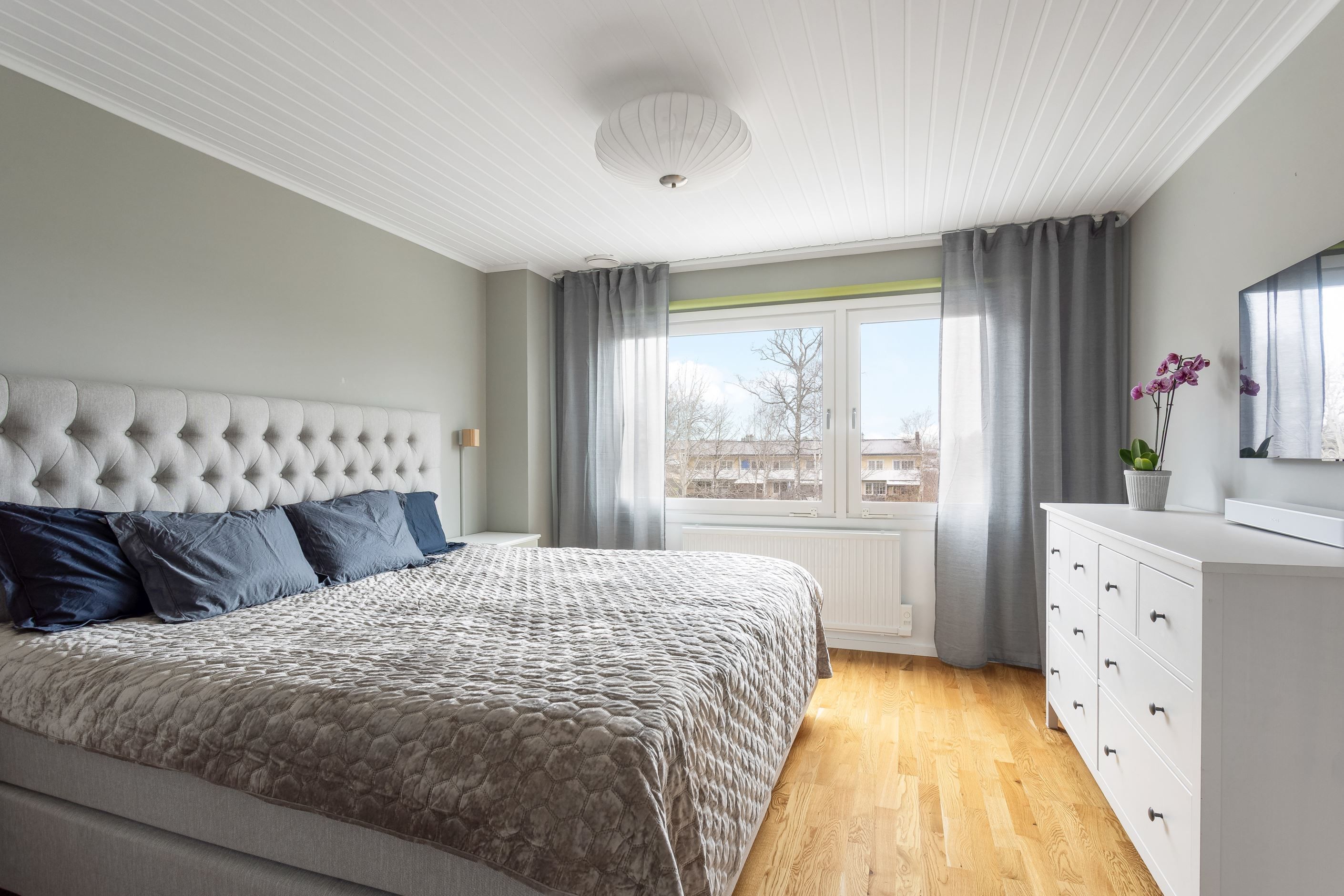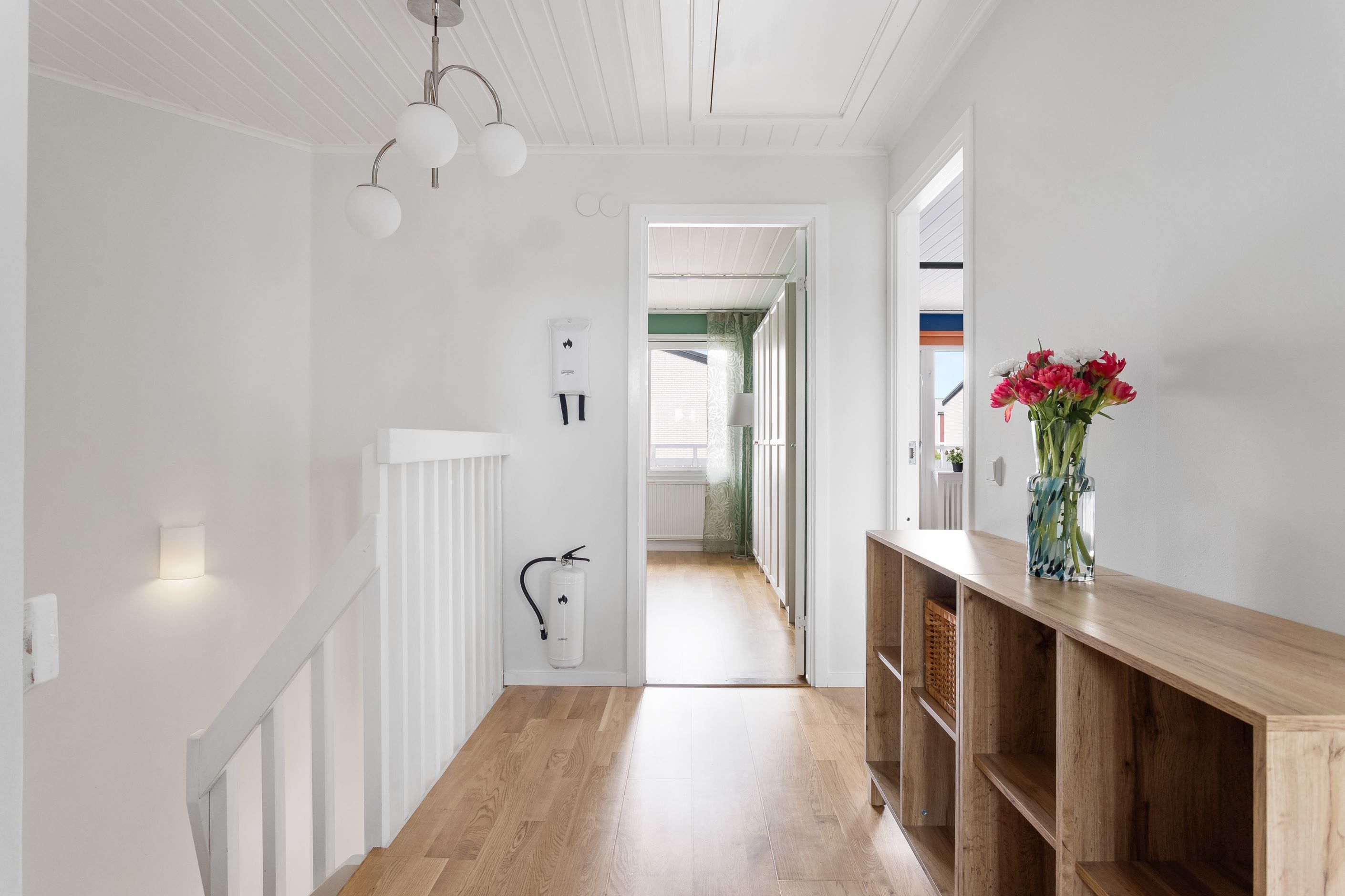 En trappa upp omfamnas du av en hall och tre generösa sovrum med goda förvaringsmöjligheter. Från två av rummen når du balkongen i söderläge med utsikt över framsidan. Här finns också ett stilrent och modernt badrum som andas vardagslyx i hemmamiljö.