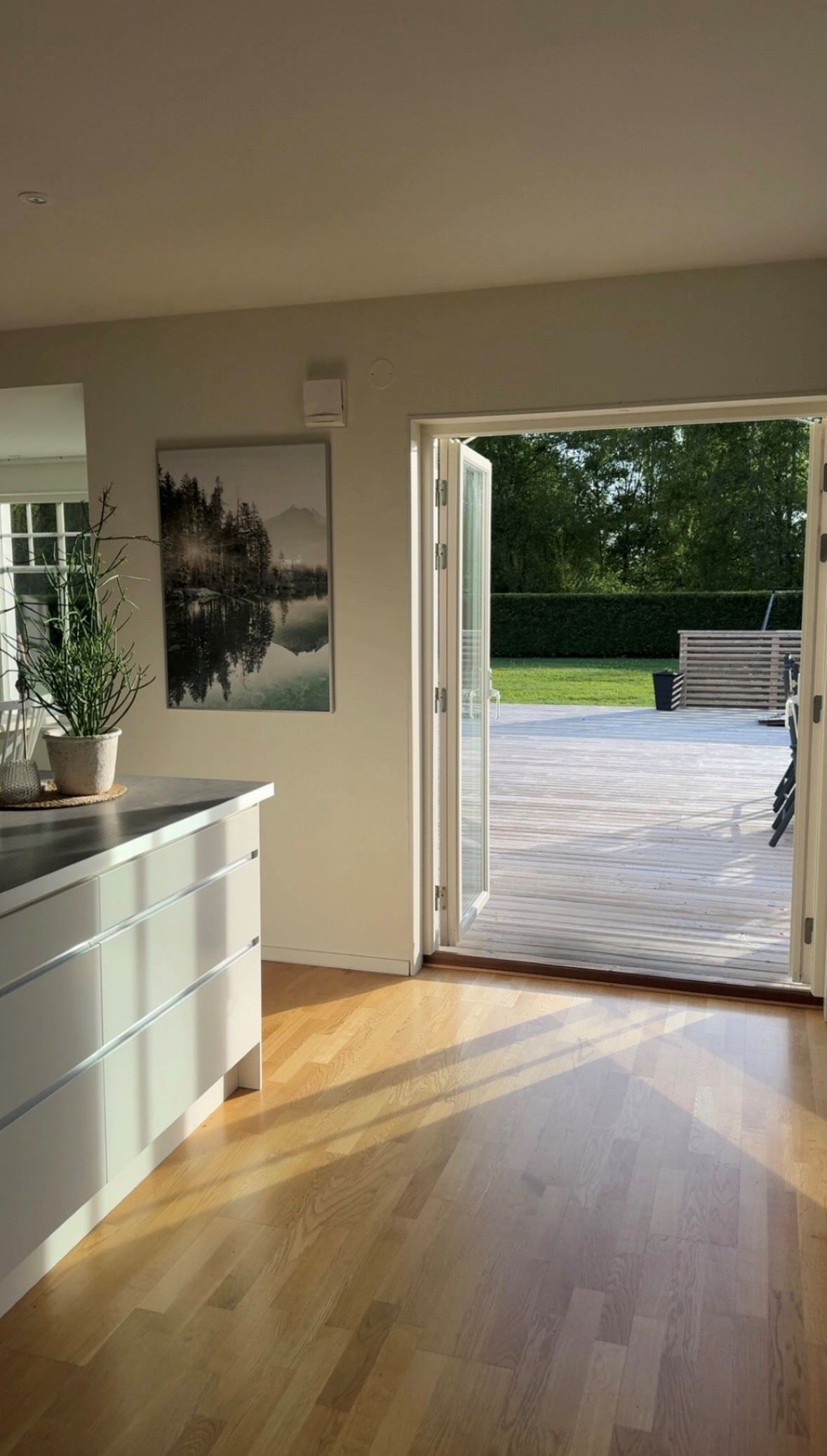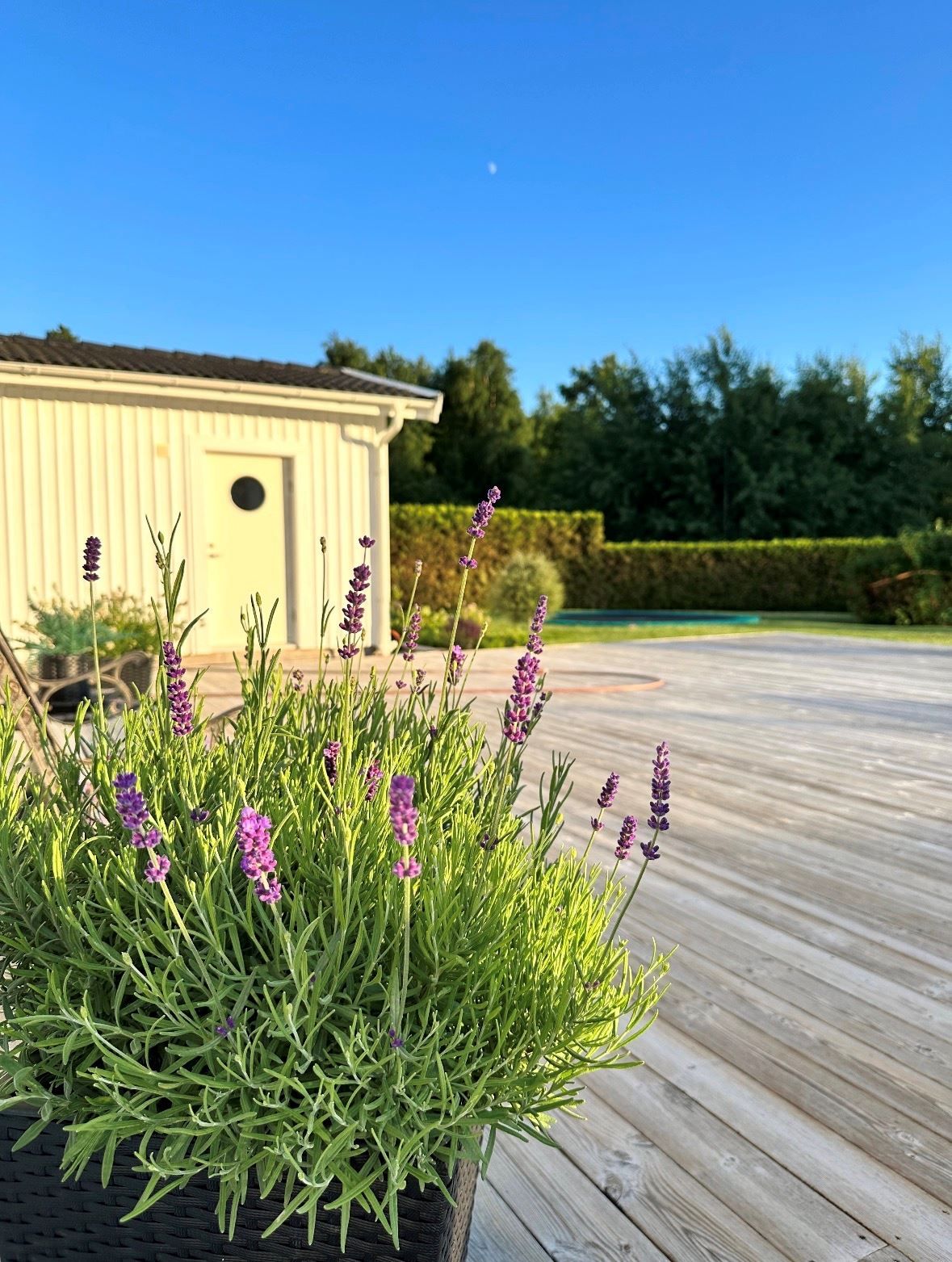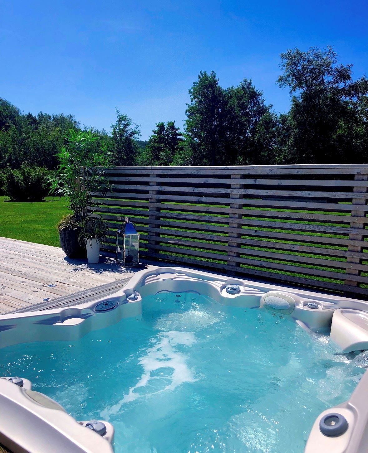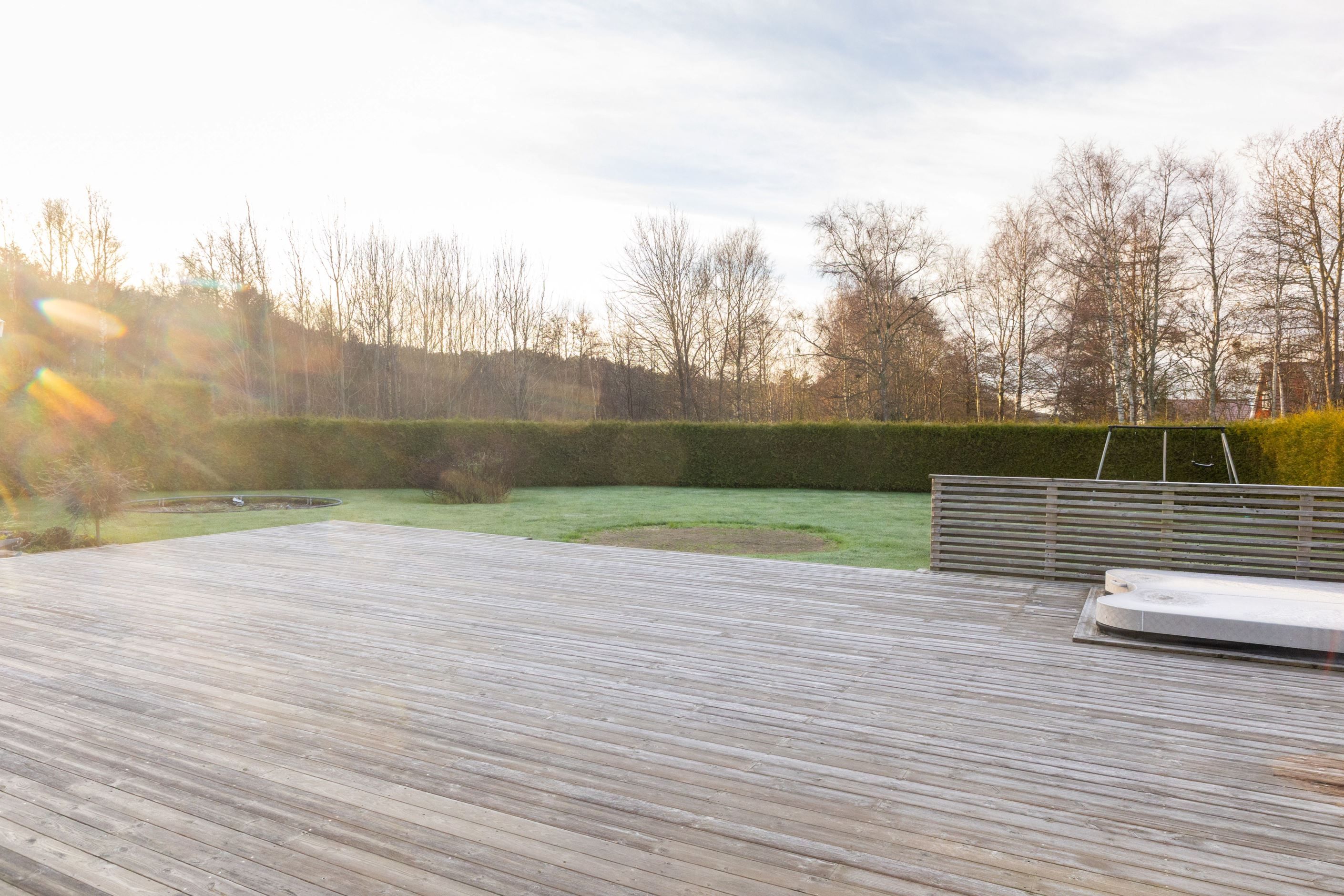 Den plana och lättskötta tomten är insynsskyddad och erbjuder stora gräsytor för lek och avkoppling. Den rymliga altanen med nedsänkt spabad skapar en naturlig förlängning av bostaden och blir en självklar samlingsplats under årets varmare månader. Till huset hör ett fristående garage och uppfart med plats för båt och flera bilar.