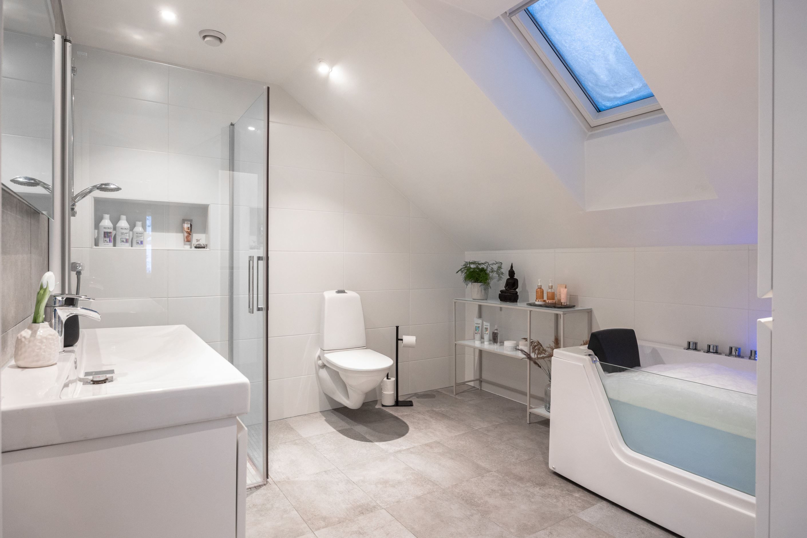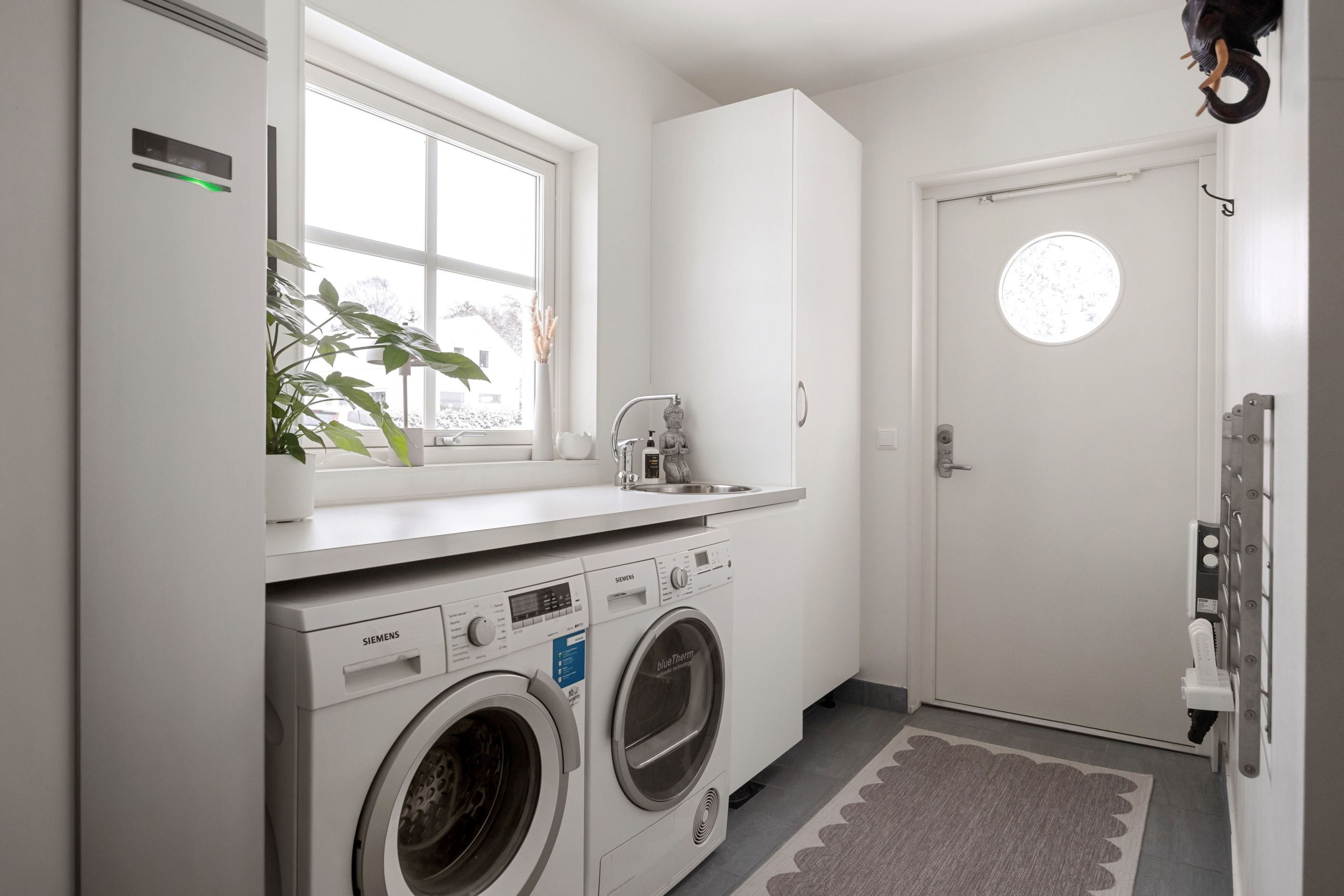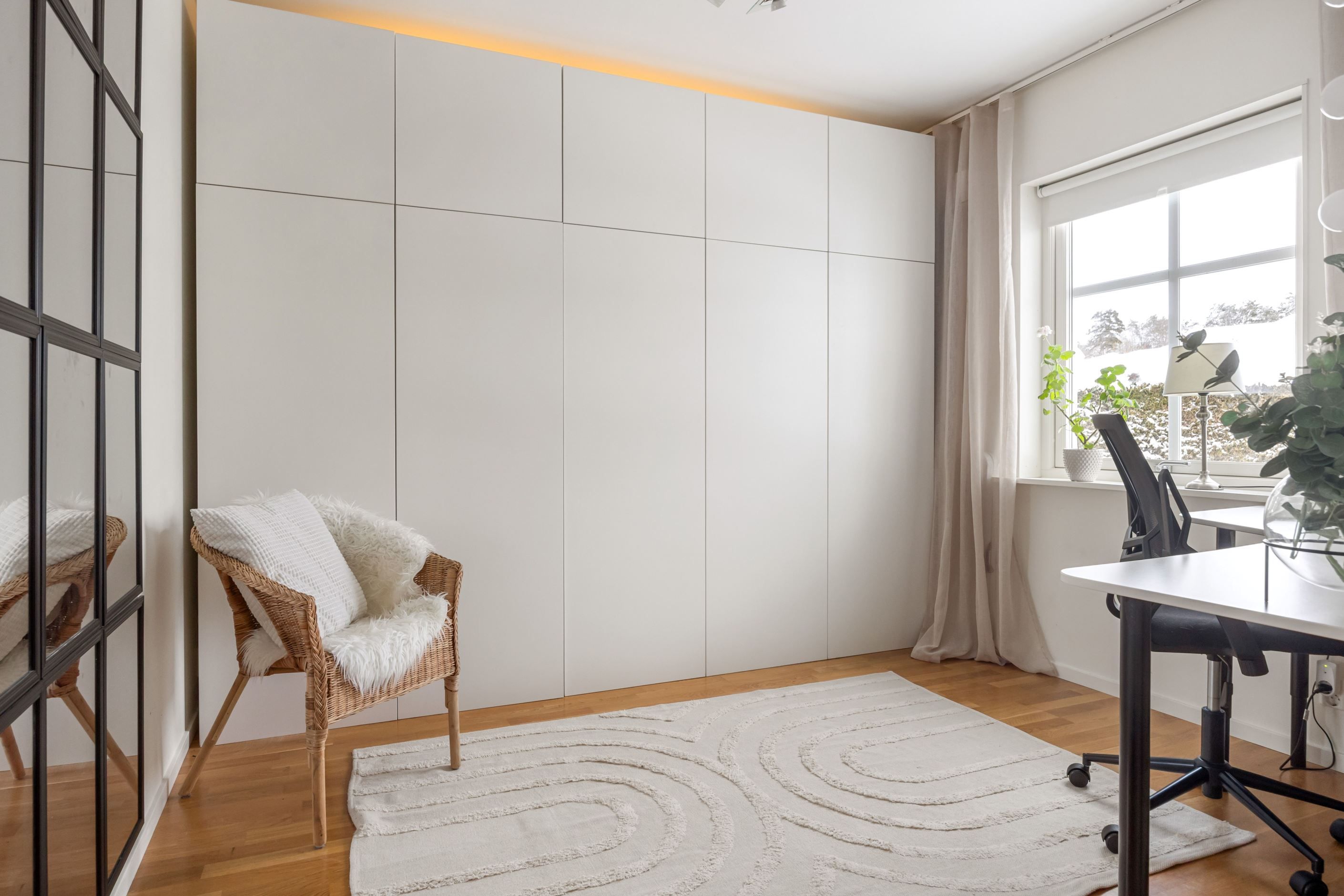 På entréplanet finns även ett sovrum/kontor som lämpar sig utmärkt som arbetsrum eller gästrum. Här finns dessutom ett helkaklat badrum samt en praktisk tvättstuga med egen groventré, god förvaring och arbetsbänk.