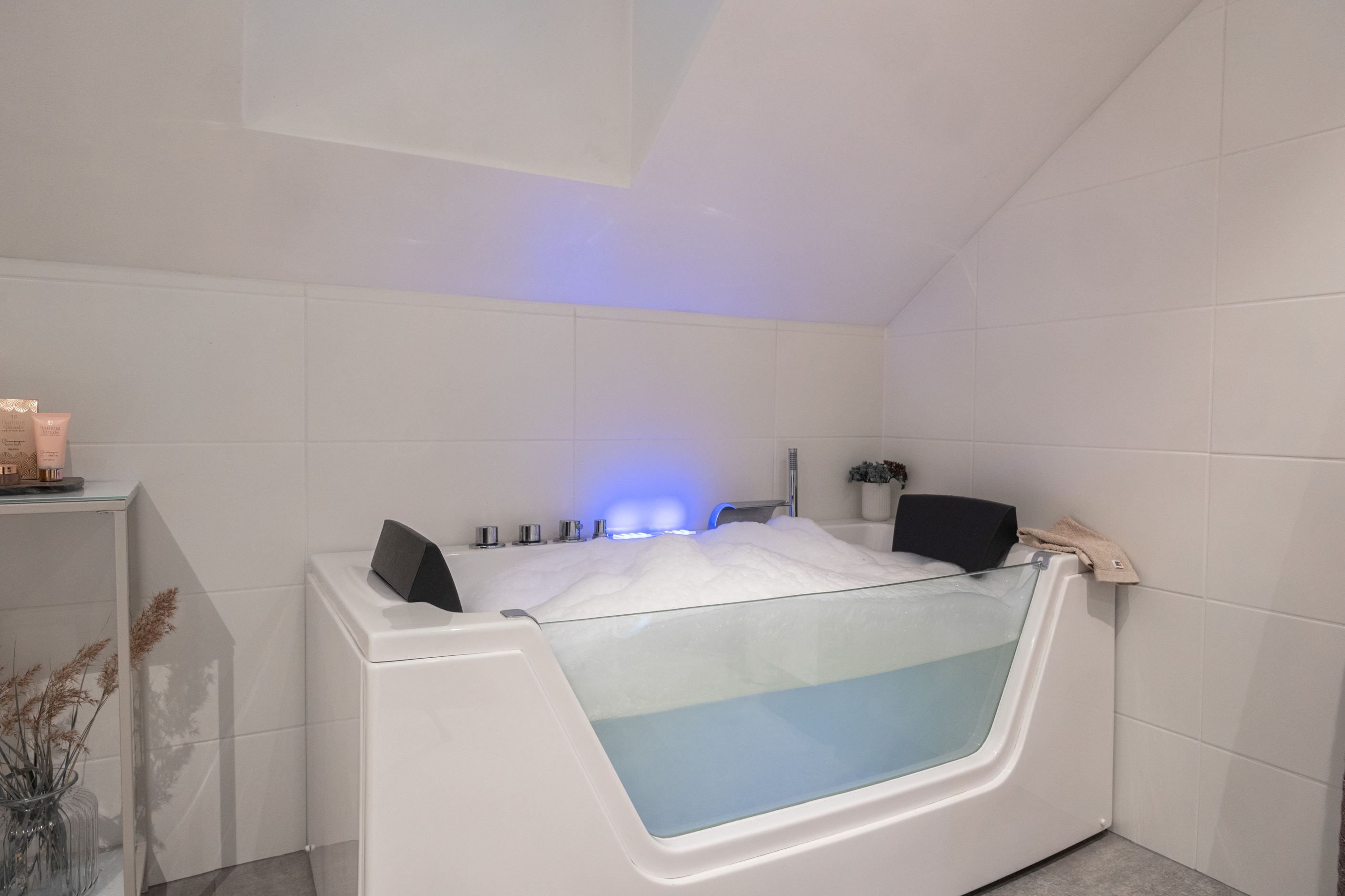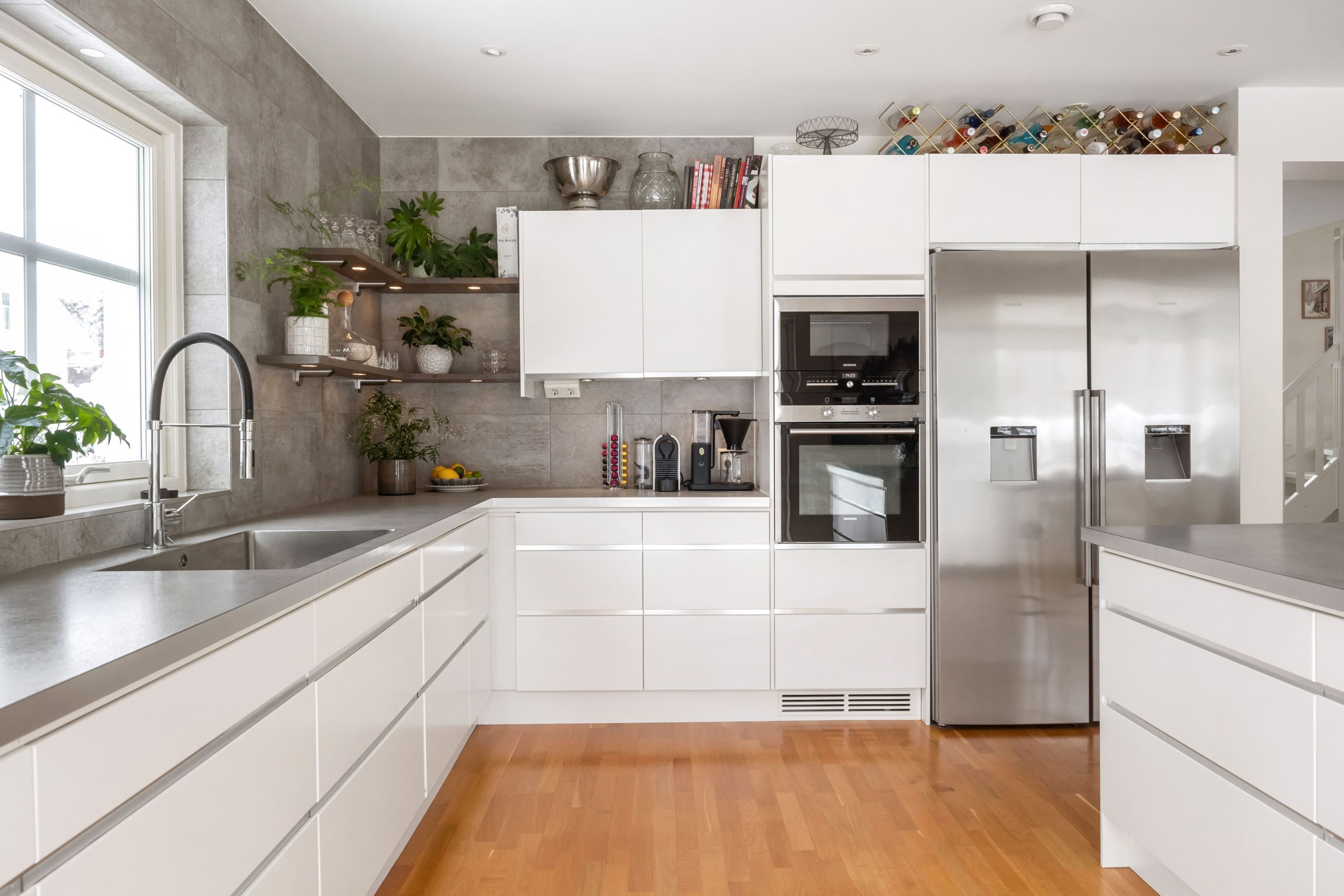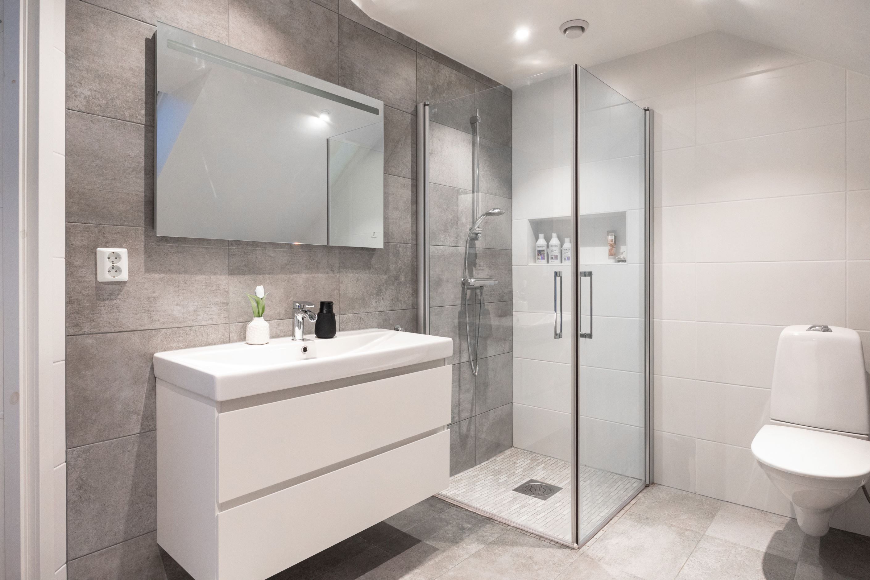 På entréplanet finns även ett sovrum/kontor som lämpar sig utmärkt som arbetsrum eller gästrum. Här finns dessutom ett helkaklat badrum samt en praktisk tvättstuga med egen groventré, god förvaring och arbetsbänk.