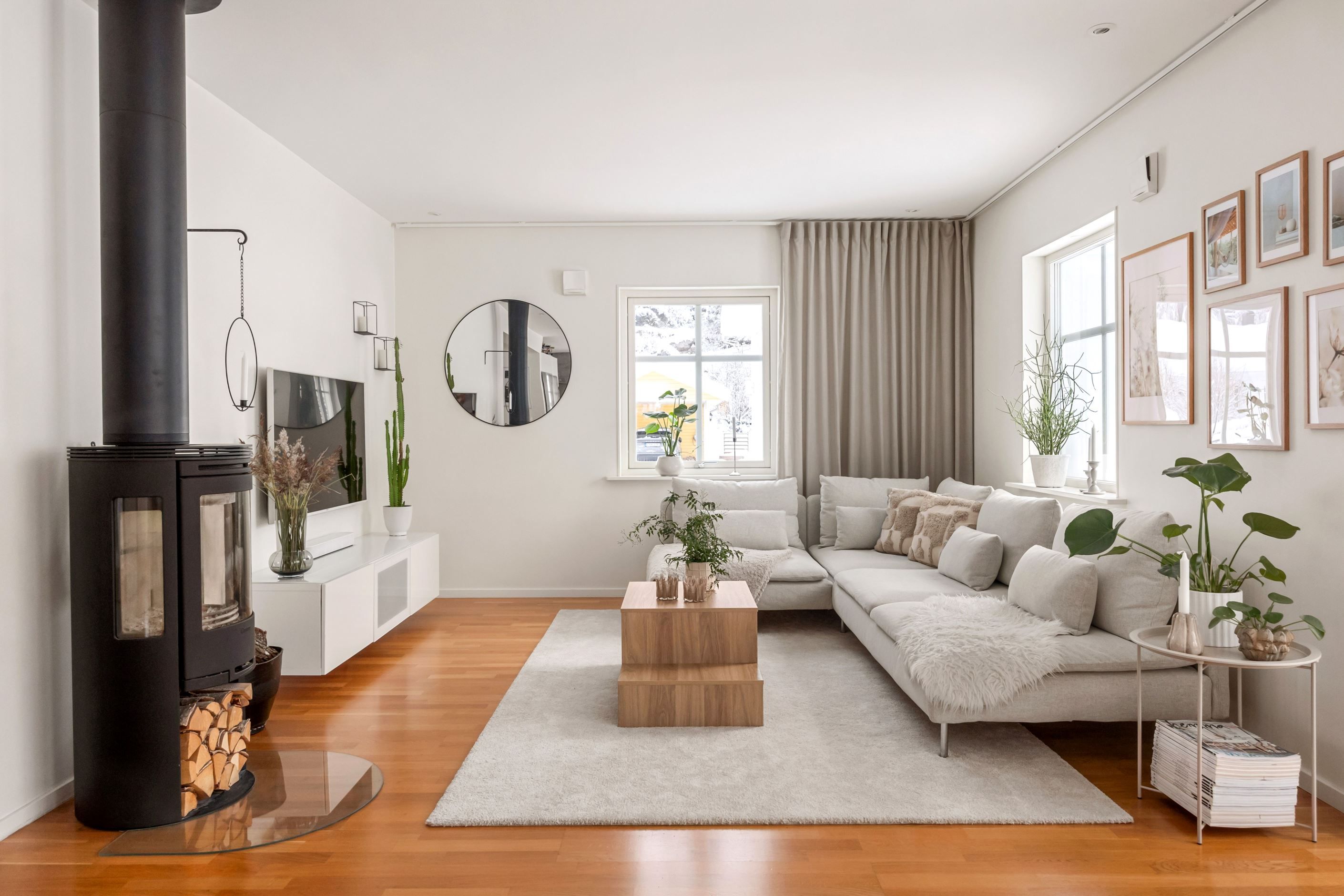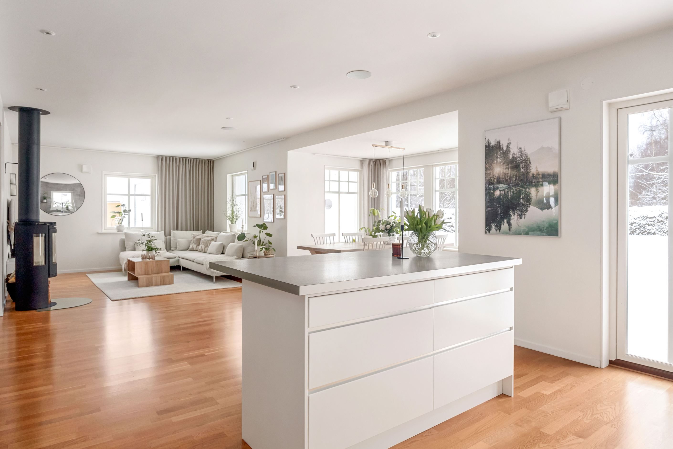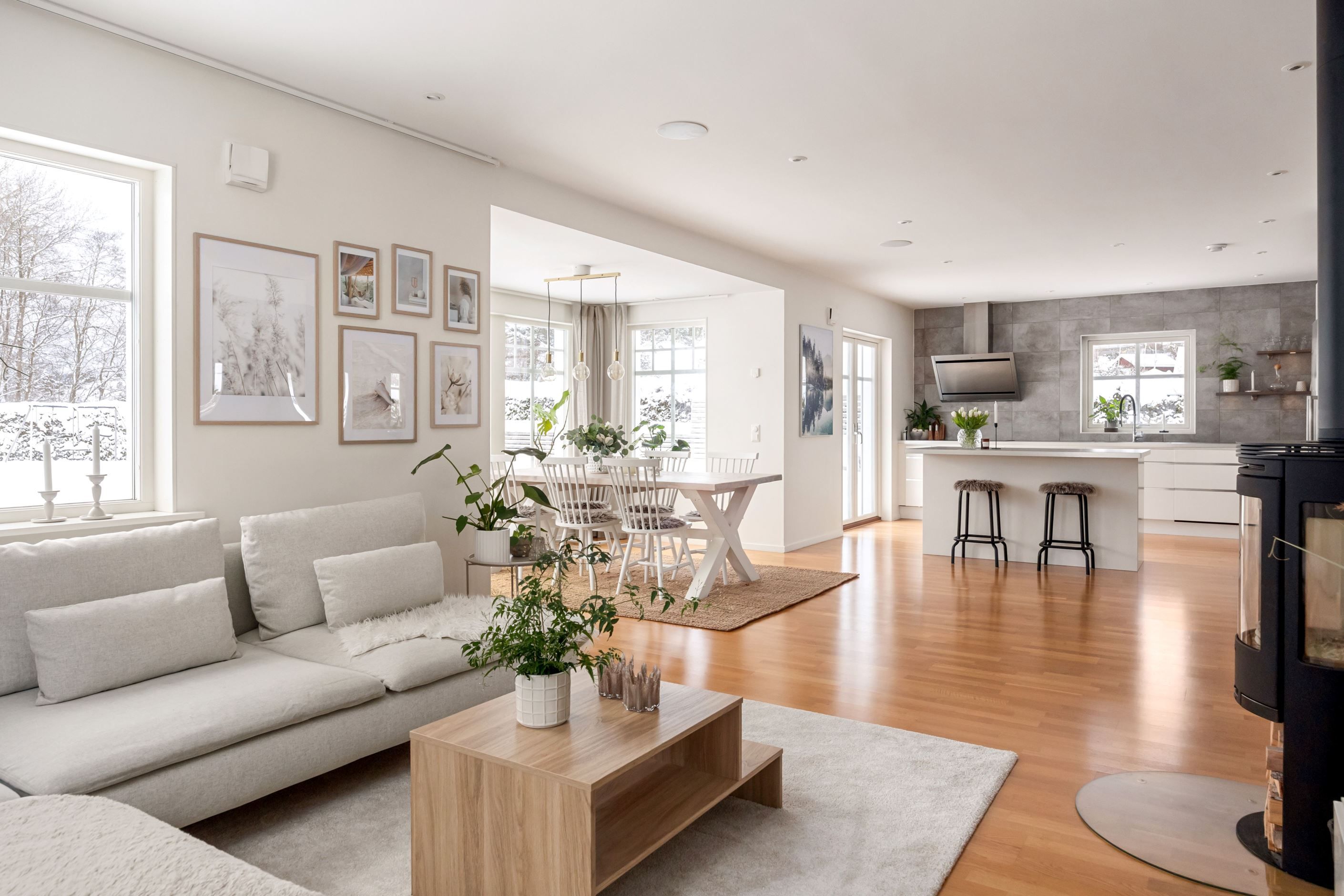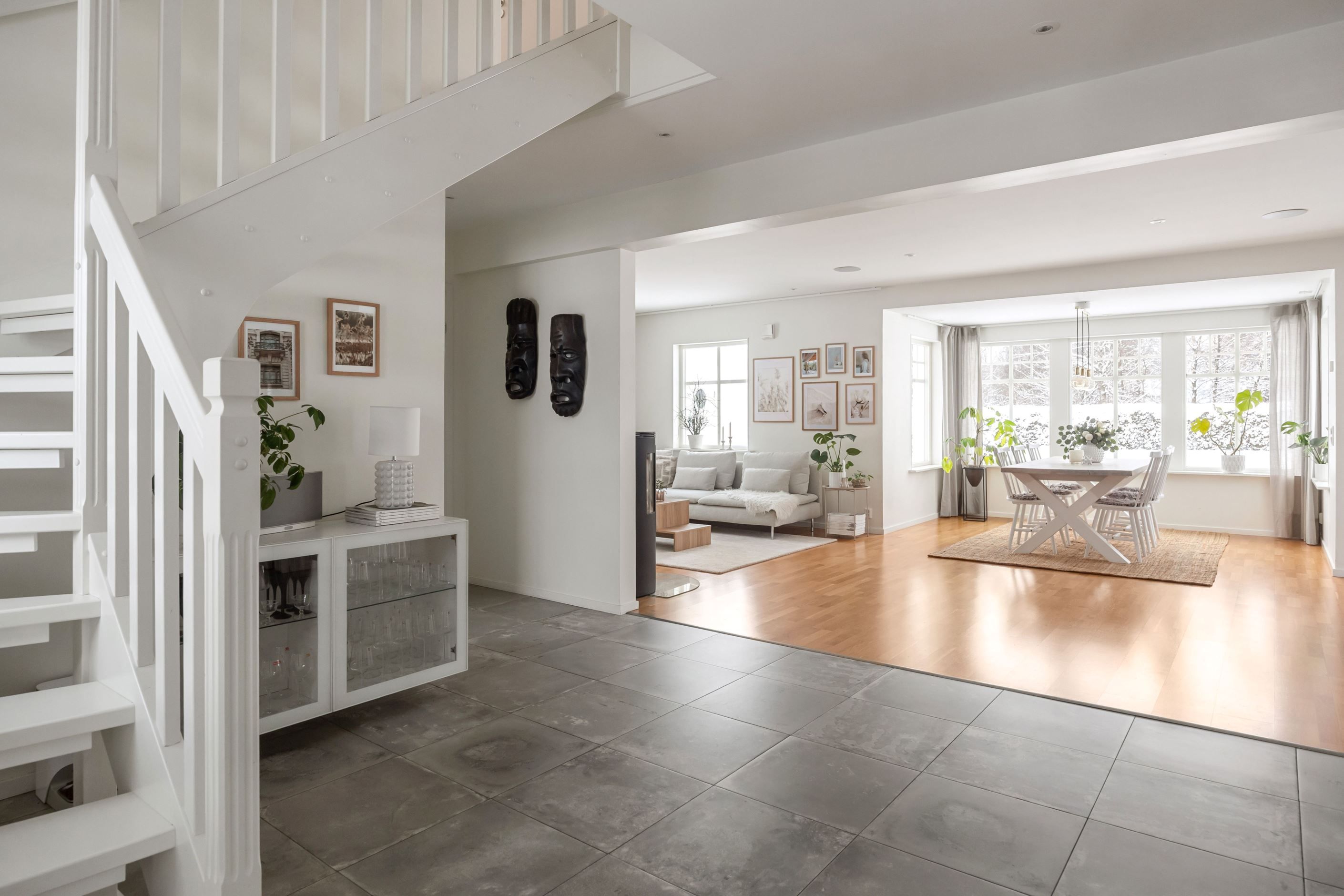Entréplanet präglas av öppna och ljusa ytor där kök, matplats och vardagsrum smälter samman på ett naturligt sätt. Det stilrena köket har goda arbetsytor, köksö och har direkt access till altan och trädgård. Intill finns matplats med stora fönsterpartier som släpper in rikligt med ljus. Vardagsrummet är generöst tilltaget och rymmer med lätthet en större soffgrupp. Här finns en stilren braskamin som ger både behaglig värme och en inbjudande atmosfär. Kaminen fungerar som en naturlig samlingspunkt och bidrar till hög mysfaktor samt energieffektiv uppvärmning under årets kallare månader.