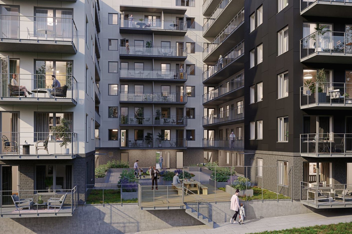 Mellan de båda flyglarna ligger den gemensamma entrégården med utsikt mot vattnet. Här finns lekytor för de minsta, uteplats, möjlighet till odling samt grillplats med långbord för gemensamma måltider. Från entrégården når man de två trapphusen som i flyglarna övergår till entré-loftgångar. Med generös bredd öppnar de gemensamma entrégångarna upp för socialt umgänge och kan samtidigt upplevas som en extra balkongyta mot gården. Från trapphus och gård når man även källaren med parkeringsgarage för bilar och cyklar.