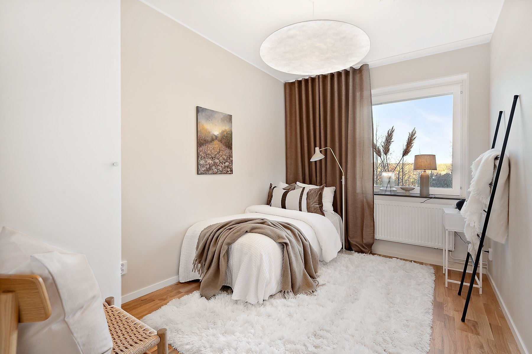 Genomgående ljusa och smakfulla ytskikt samt kakel och klinker i badrum.