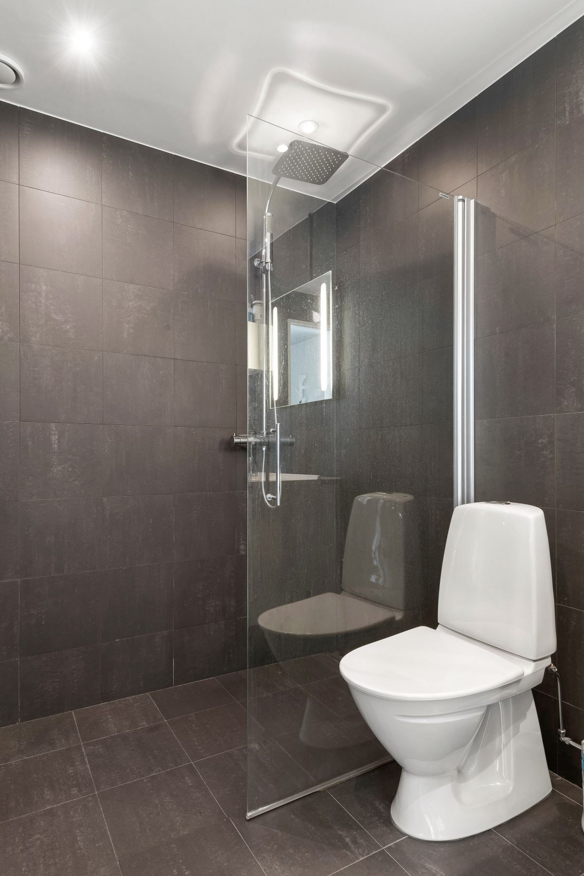 Stort helkaklat badrum med dusch och tvättmaskin. Från hallen når du även en rymlig walk in closet.