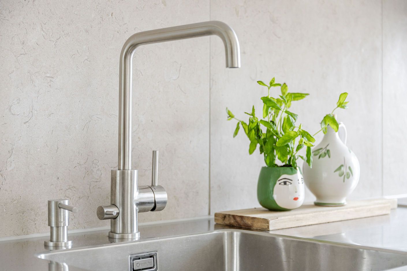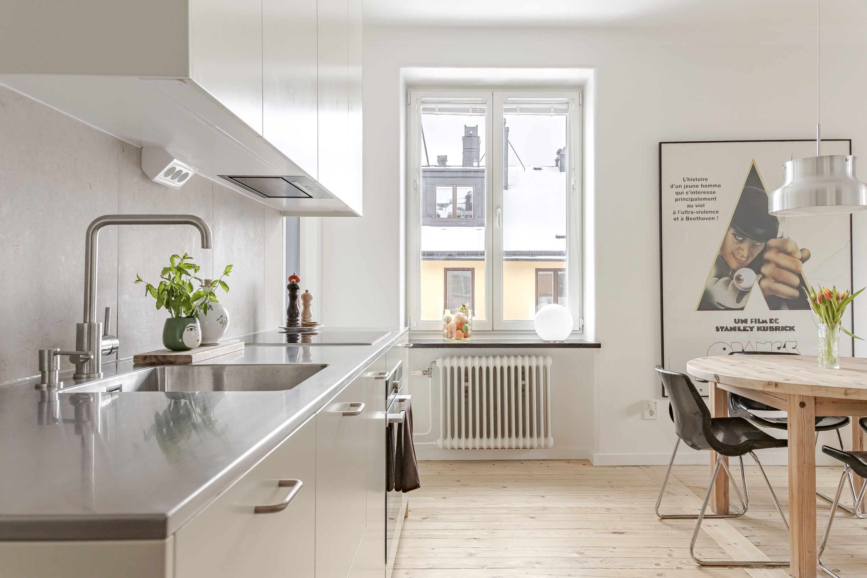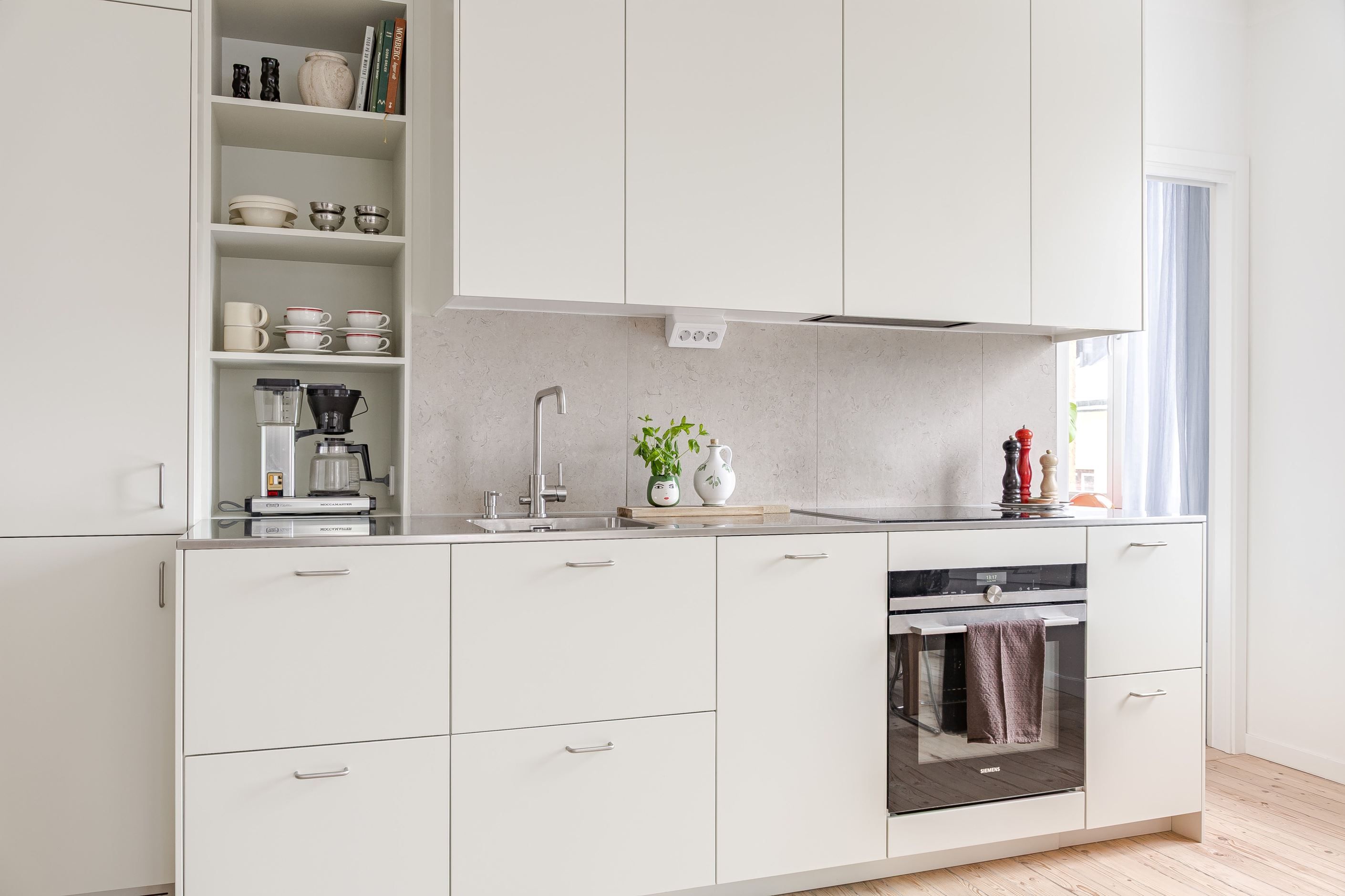 Utöver detta finns en stor och rymlig klädkammare samt ett praktiskt förvaringsutrymme, som dessutom är utrustat med vinkyl. Köket är stilrent och nyligen renoverat 2025, med en rostfri bänkskiva som harmonierar väl med kökets övriga materialval. Här finns gott om arbetsyta och förvaring samt full maskinpark inklusive diskmaskin. Från köket kan du enkelt umgås med gästerna du bjudit över, njuta av ett gott glas och samtidigt ta del av ett fantastiskt ljusinsläpp.