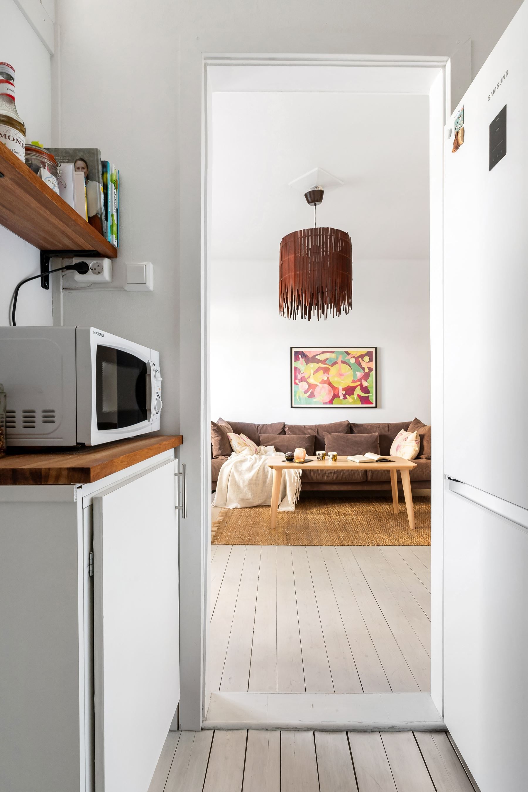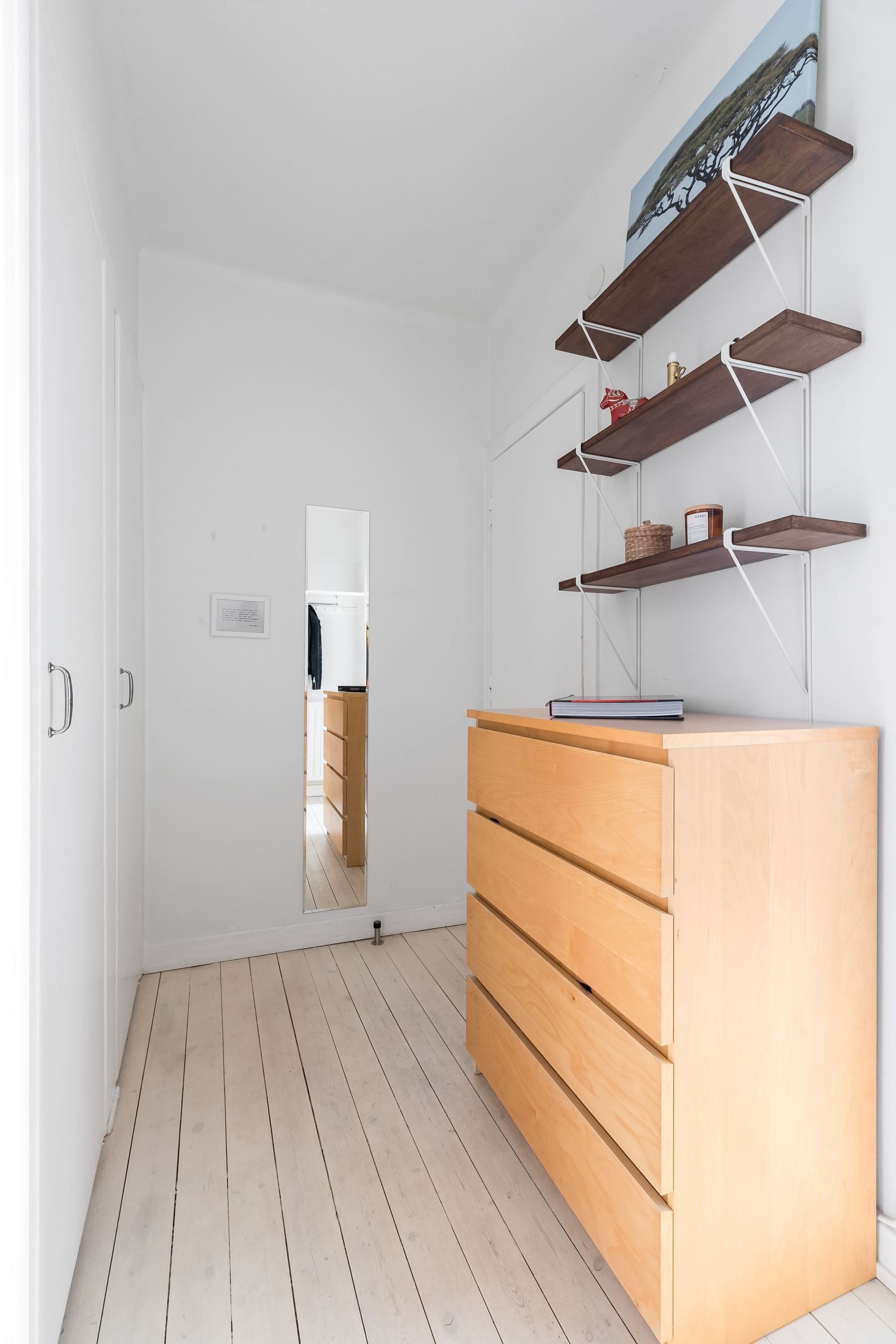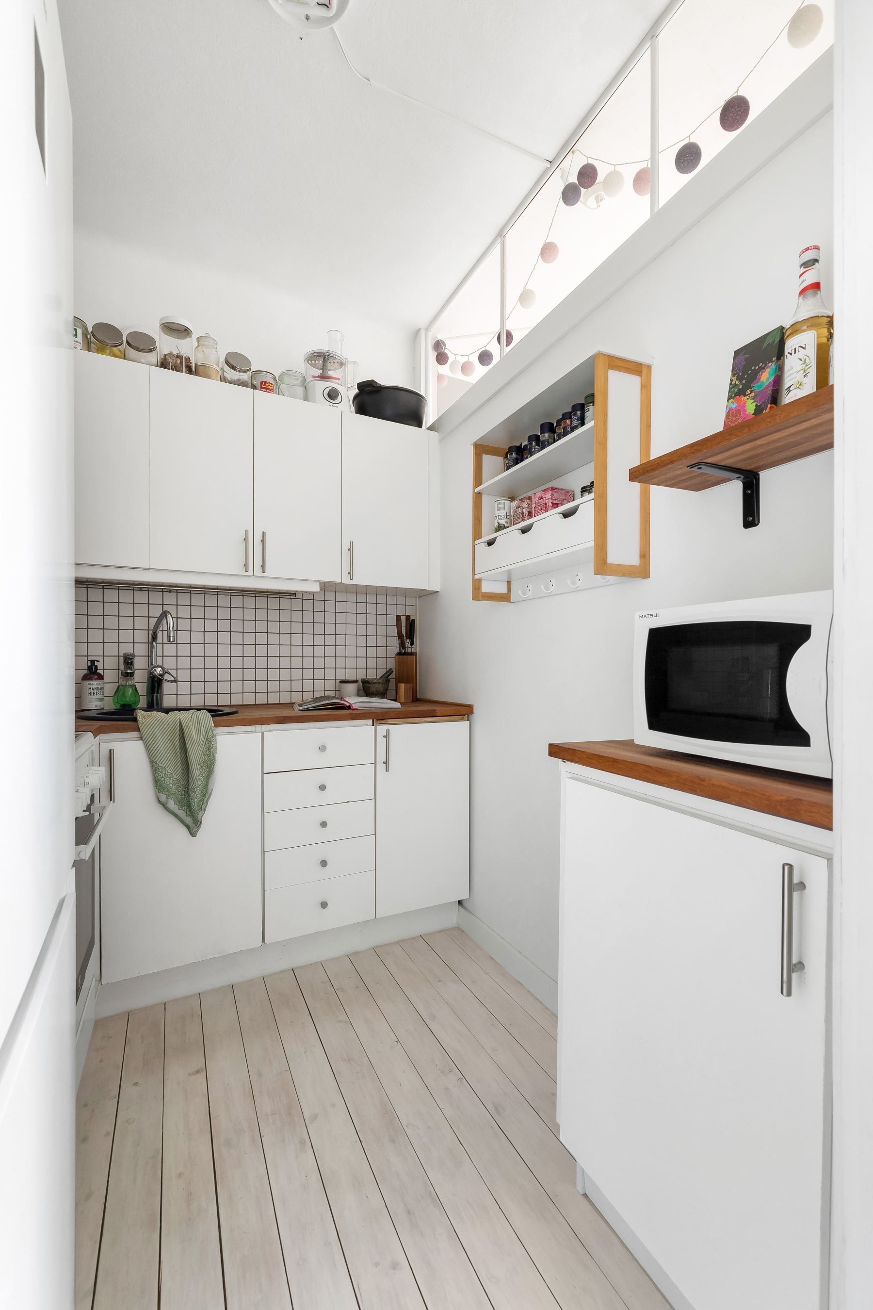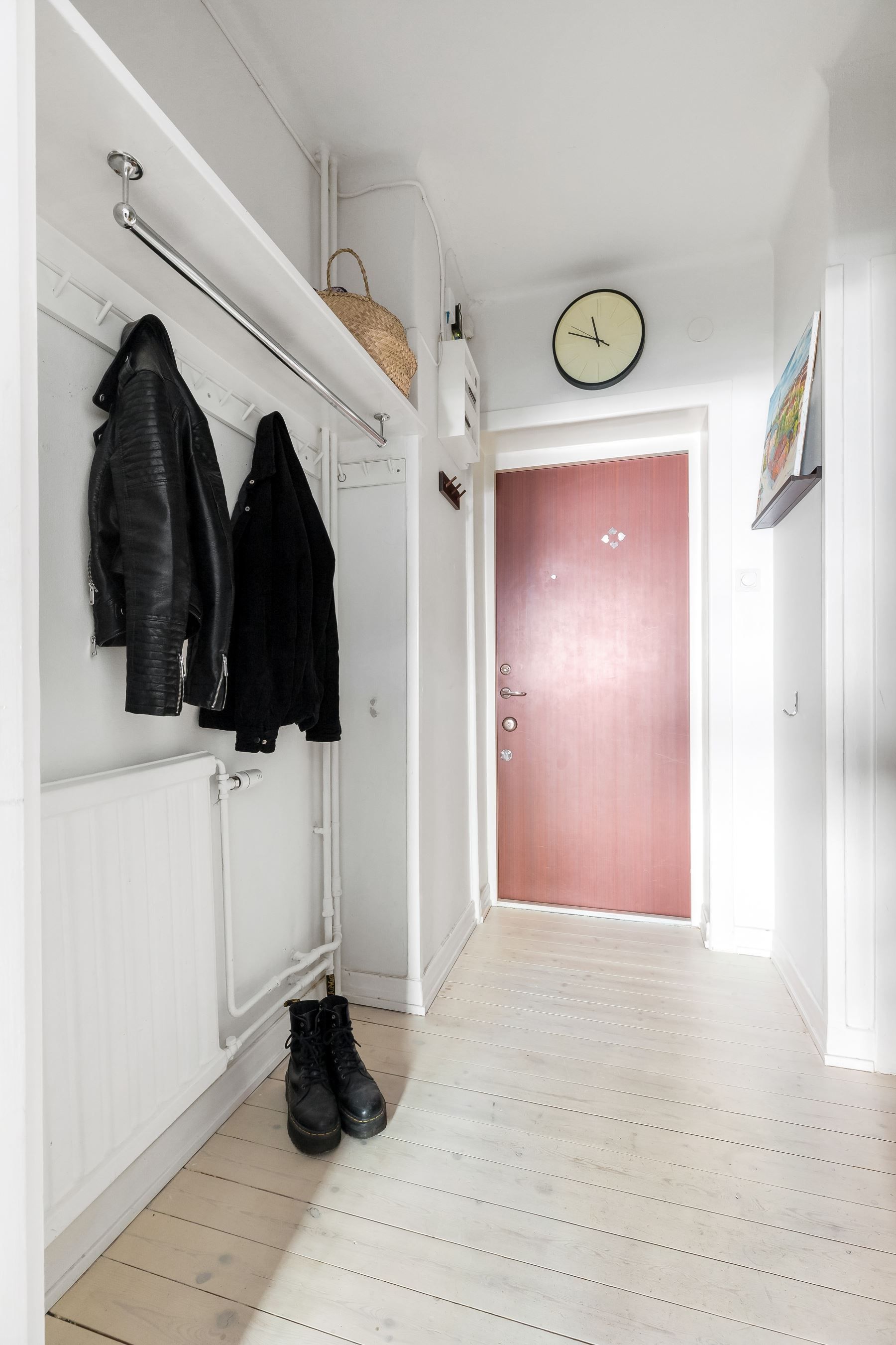 Gå in genom den stora träporten till föreningens härliga innergård som totalrenoverades under 2023. En trappa upp når du denna mysiga bostad.