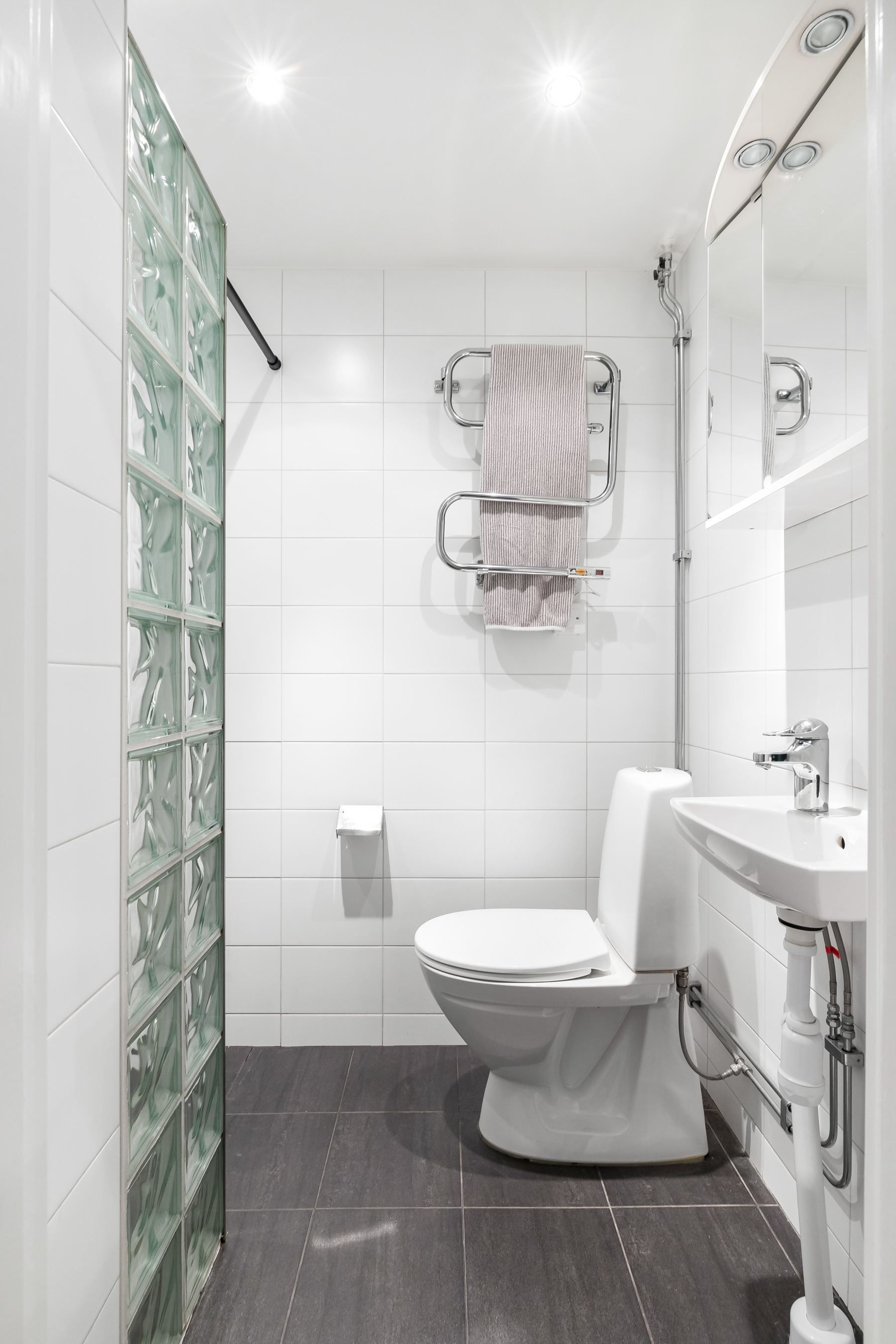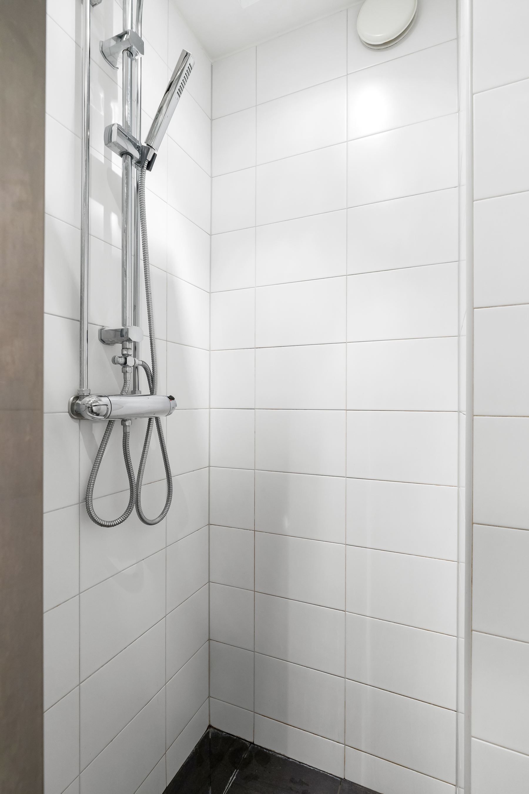 Rymlig hall med plats för skor och ytterkläder samt 2 garderober. Helkaklat badrum (stambytt 2015) med dusch, wc och handfat samt spegelskåp.