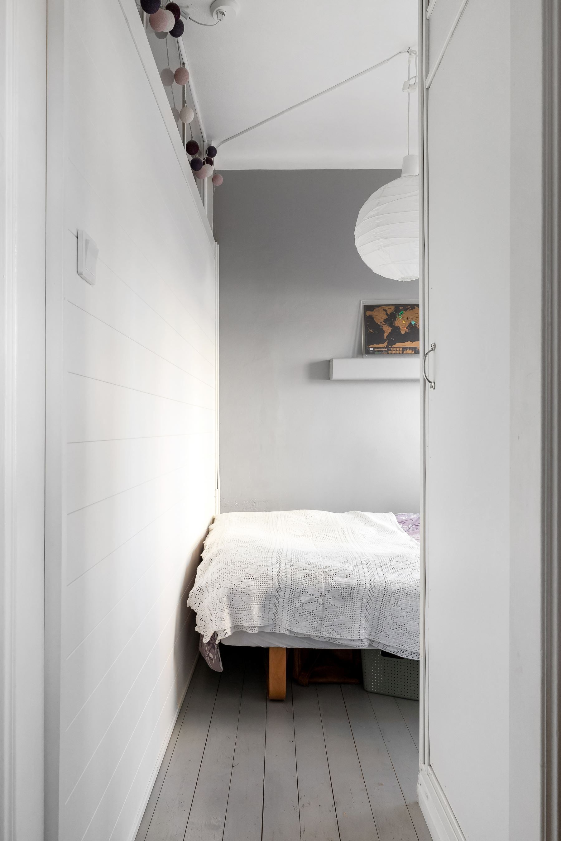 Två stora fönster släpper in ljus i bostaden och det är högt i tak! Från vardagsrummet når du sovrummet med plats för dubbelsäng. Här finns även en platsbyggd garderob.
