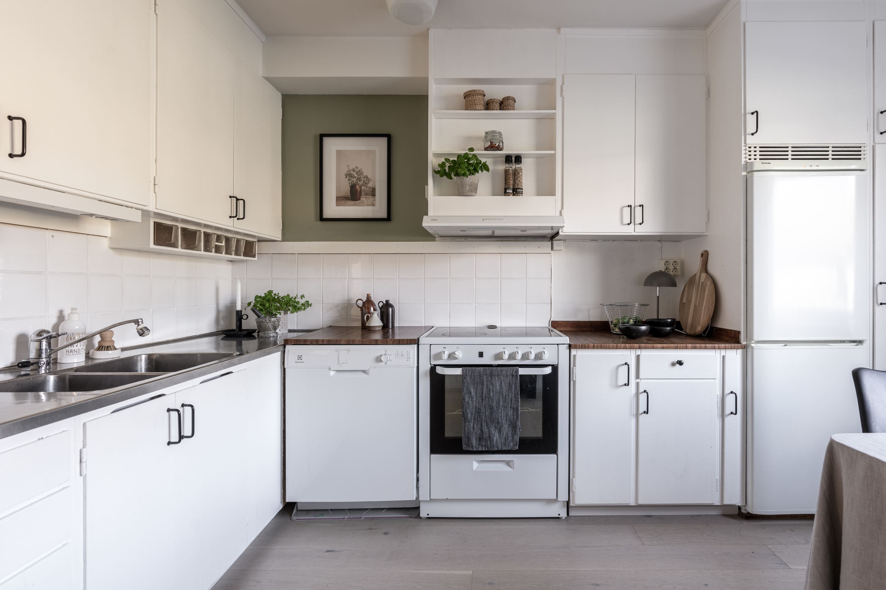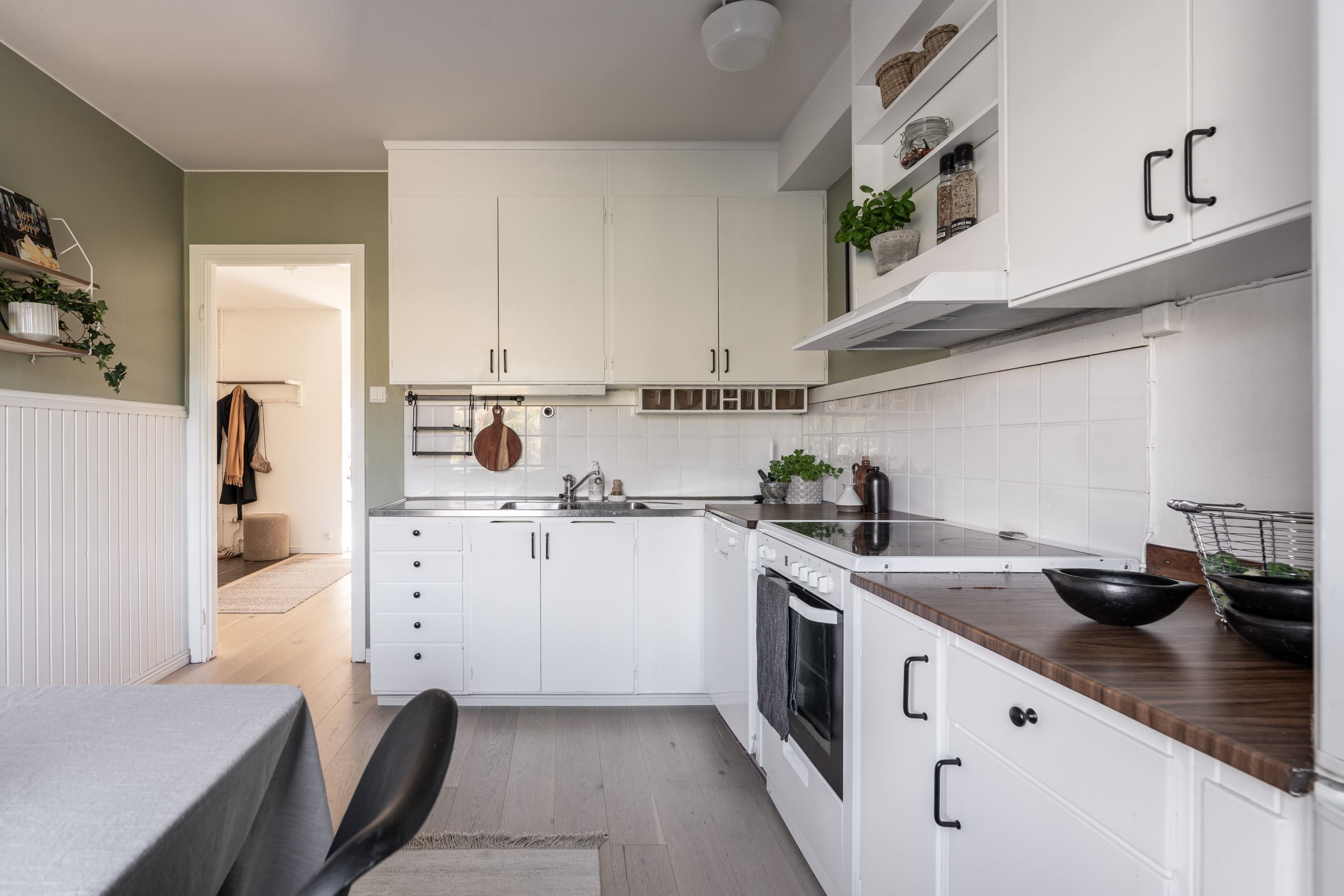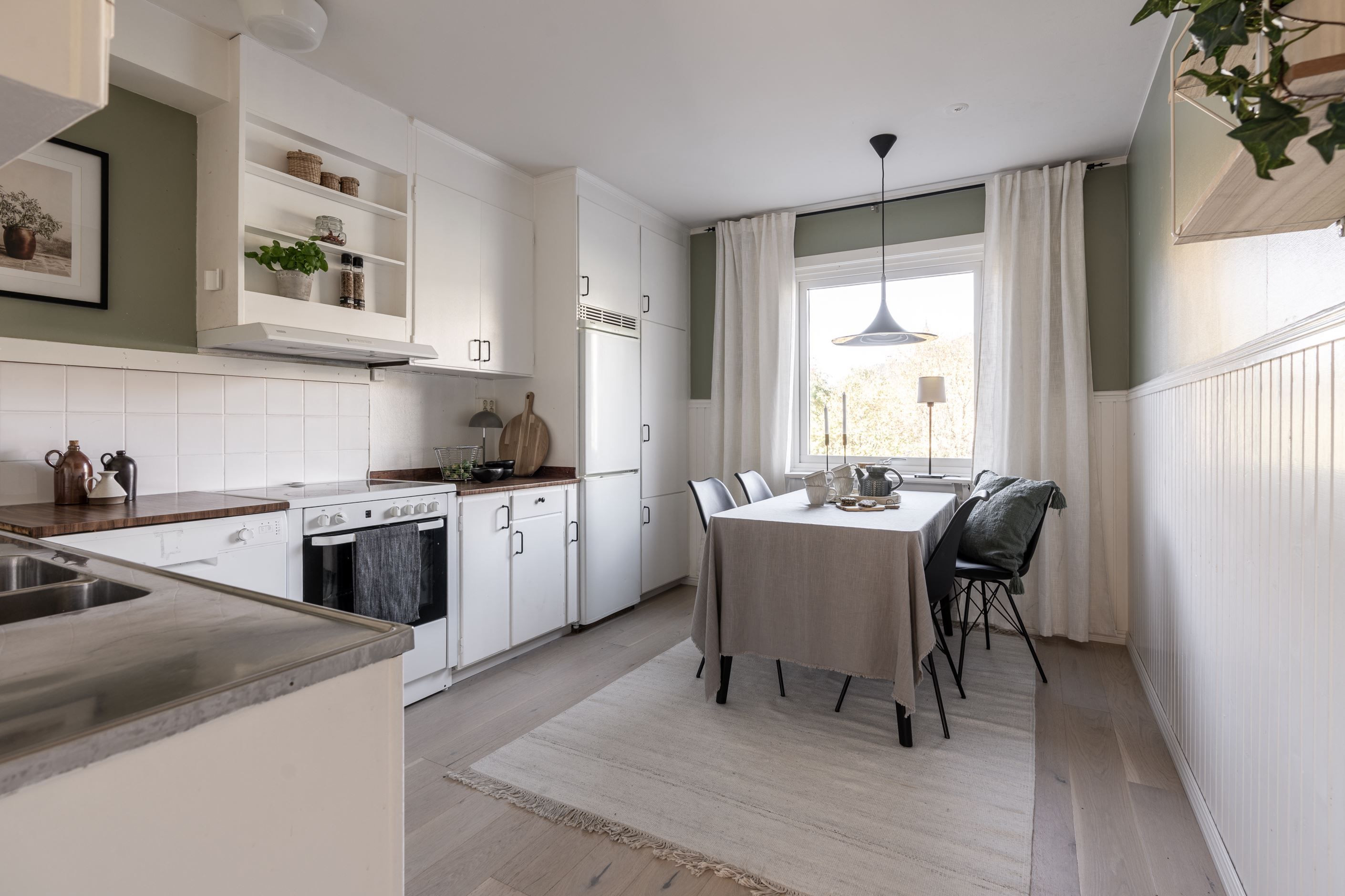Det stilrena köket är fullt utrustat med modern maskinpark, redo för allt från vardagsmiddagar till helgens festmåltider. Badrummet är fräscht och praktiskt med egen tvättmaskin som gör vardagen lite smidigare.