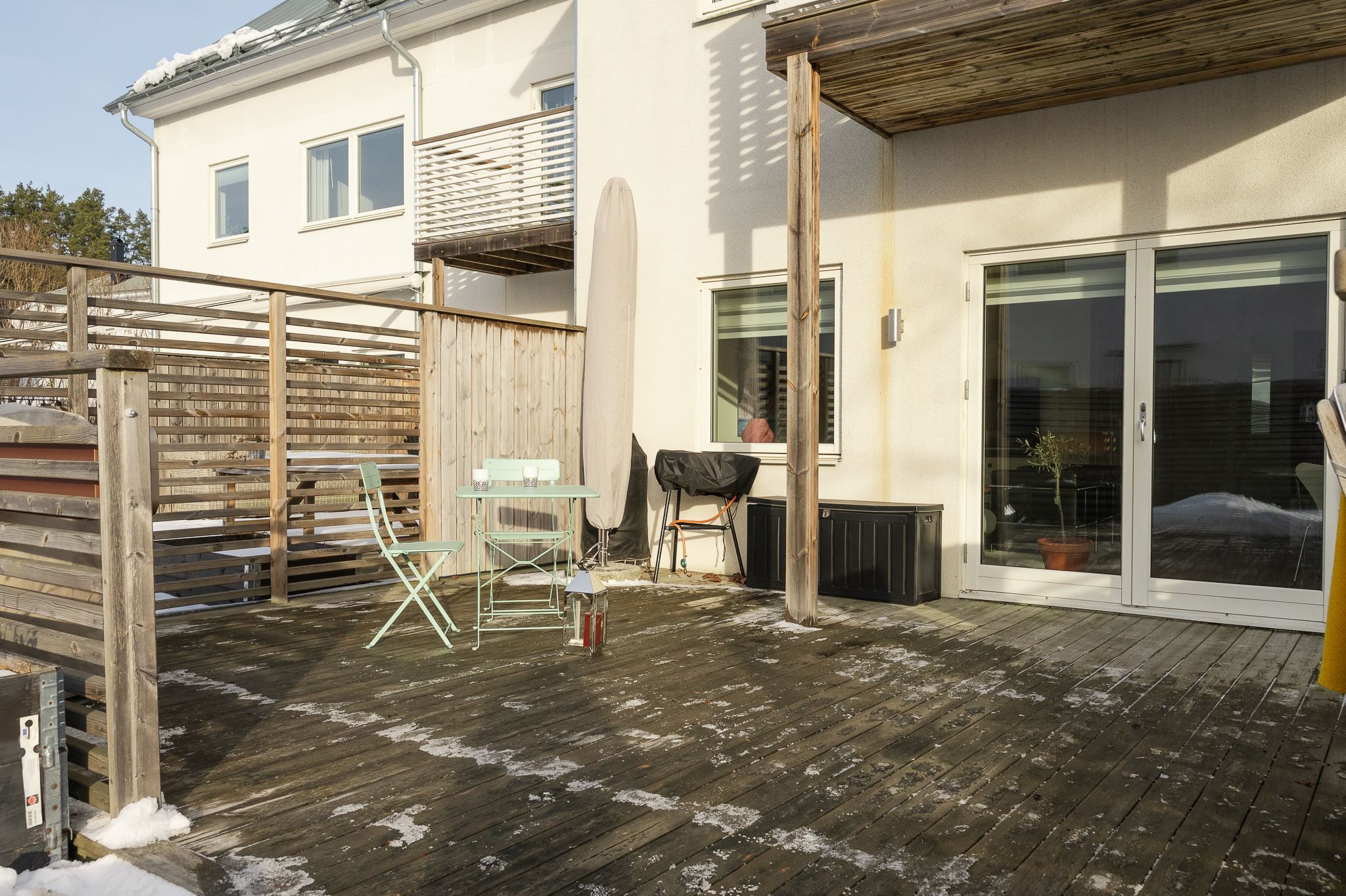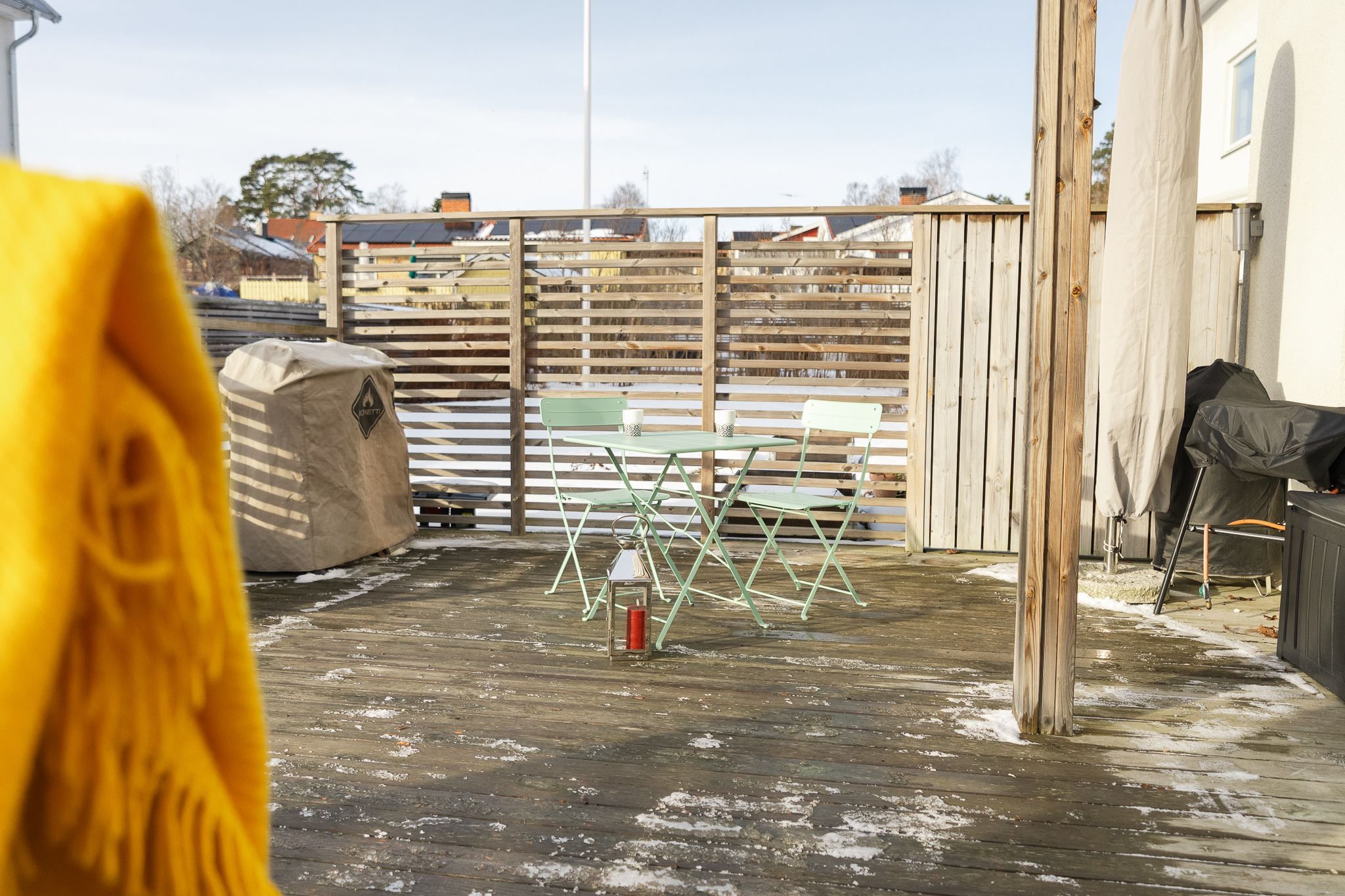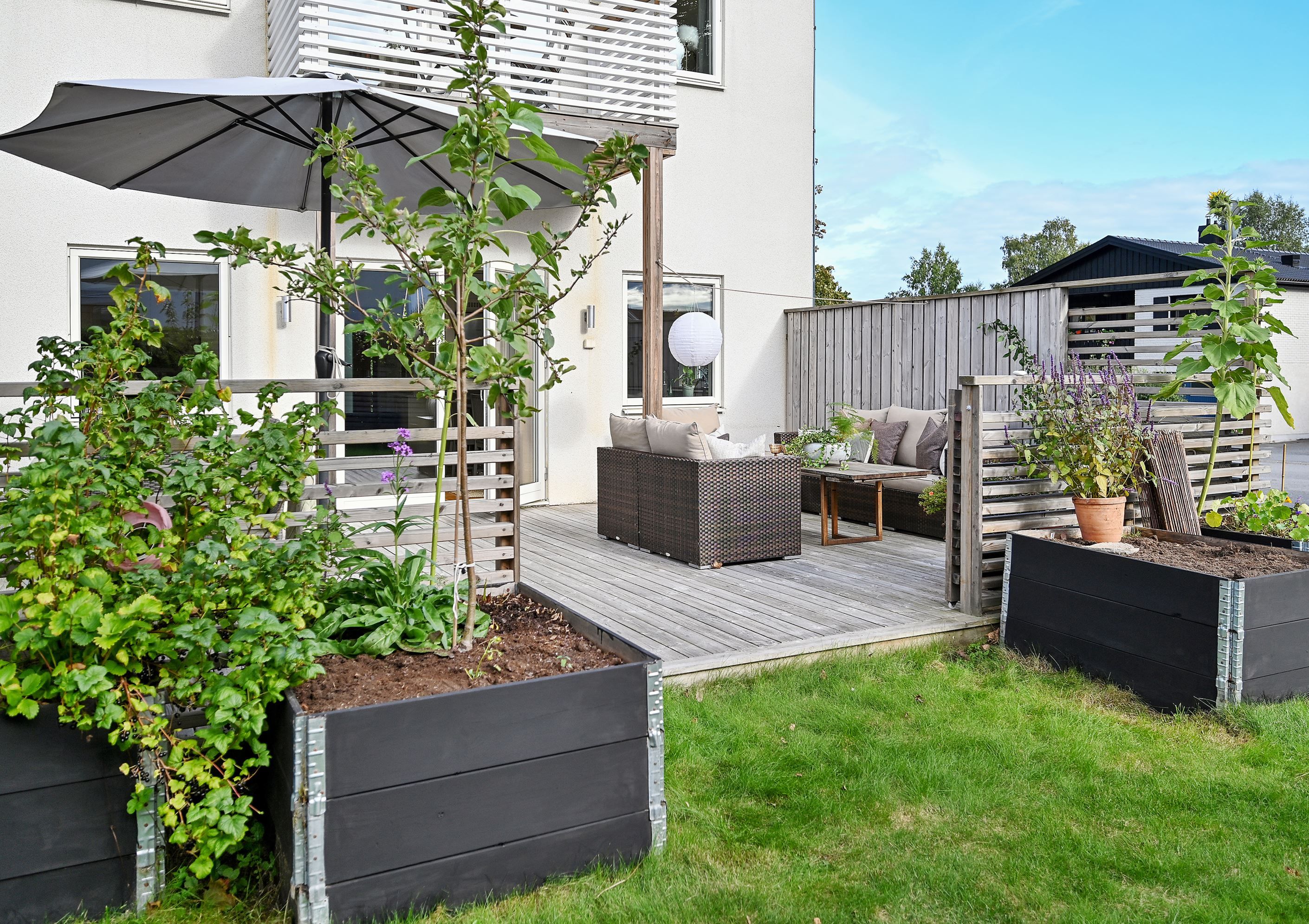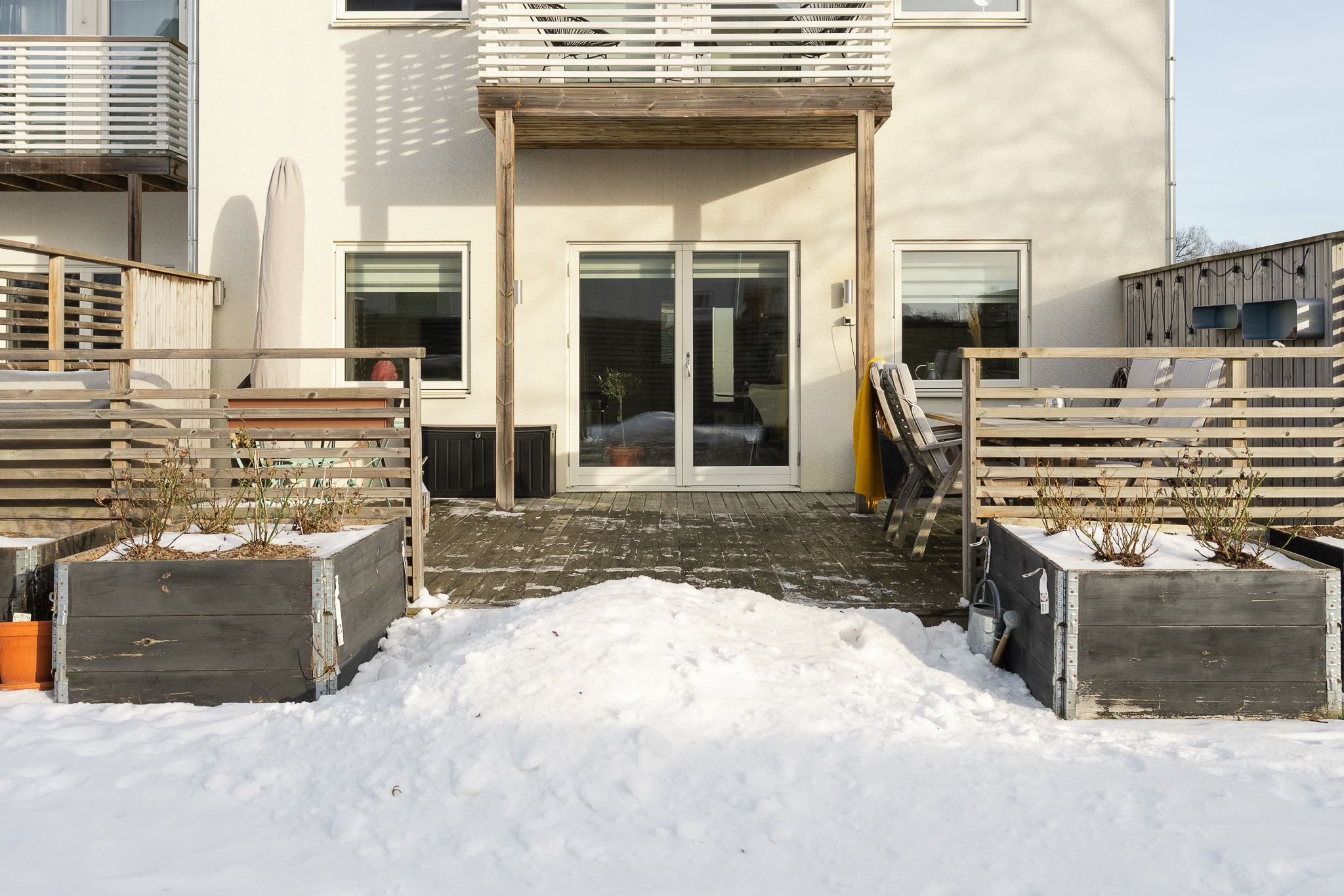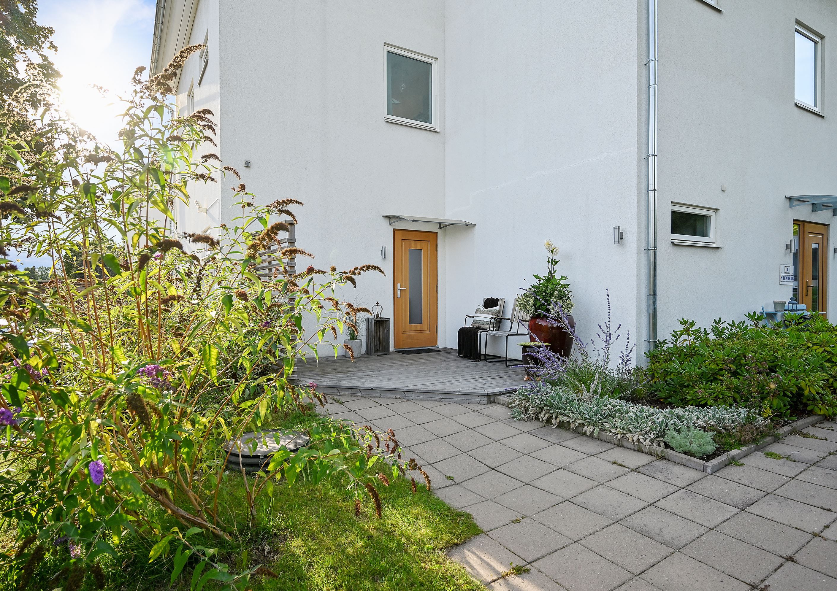 Entréplanet erbjuder en social och inbjudande planlösning med öppen yta mellan kök och vardagsrum – perfekt för både vardag och umgänge. Härifrån når du den soldränkta altanen och gräsmattan, en härlig förlängning av bostaden under årets varmare månader. Dessutom finns fyra odlingslådor för dig med "gröna fingrar". På framsidan finns en mindre altan där morgonsolen sätter guldkant på dagens första kaffekopp. På baksidans altan skiner solen från förmiddag till solnedgång och stora glasdörrar suddar på sommaren ut gränsen mellan inne och ute. Planet rymmer även ett helkaklat badrum med dusch, tvättmaskin och torktumlare. Uppvärmningen sker energieffektivt via frånluftsvärmepump.