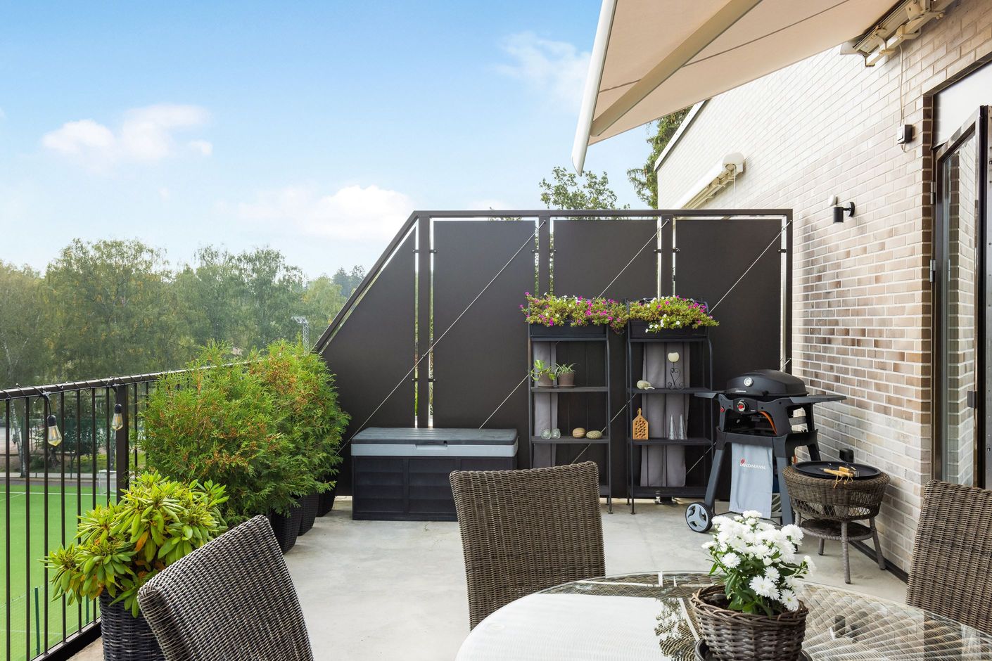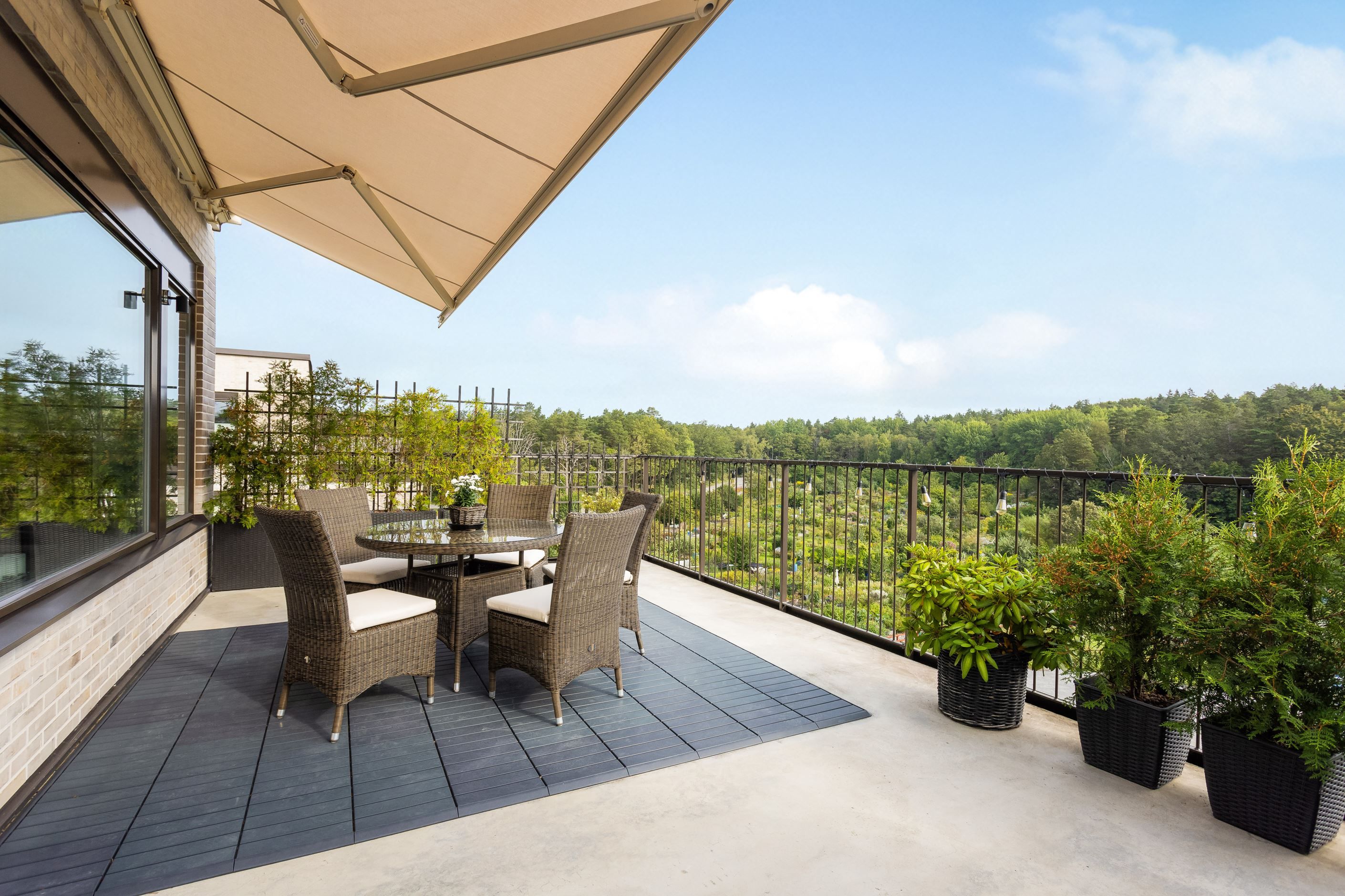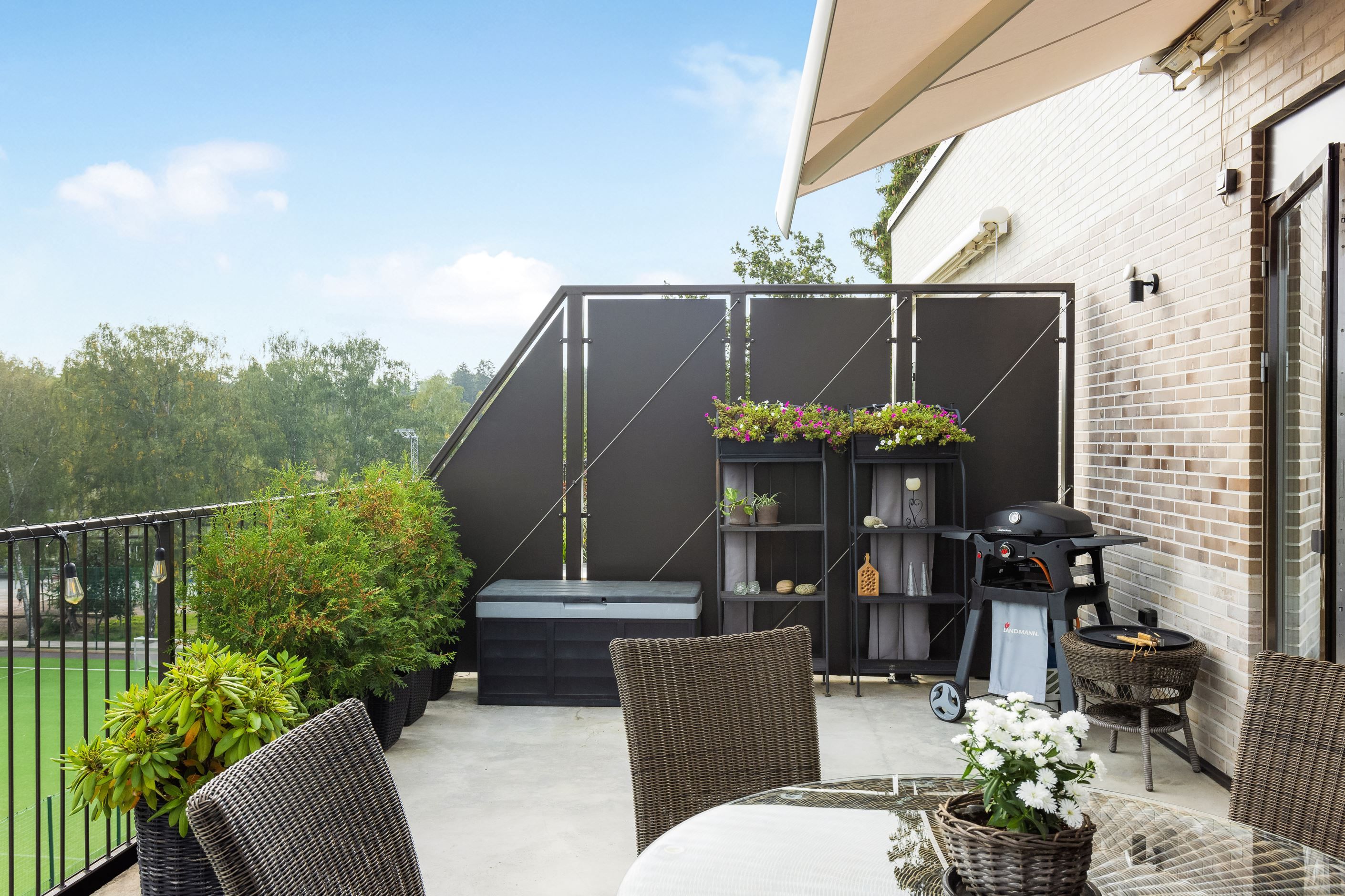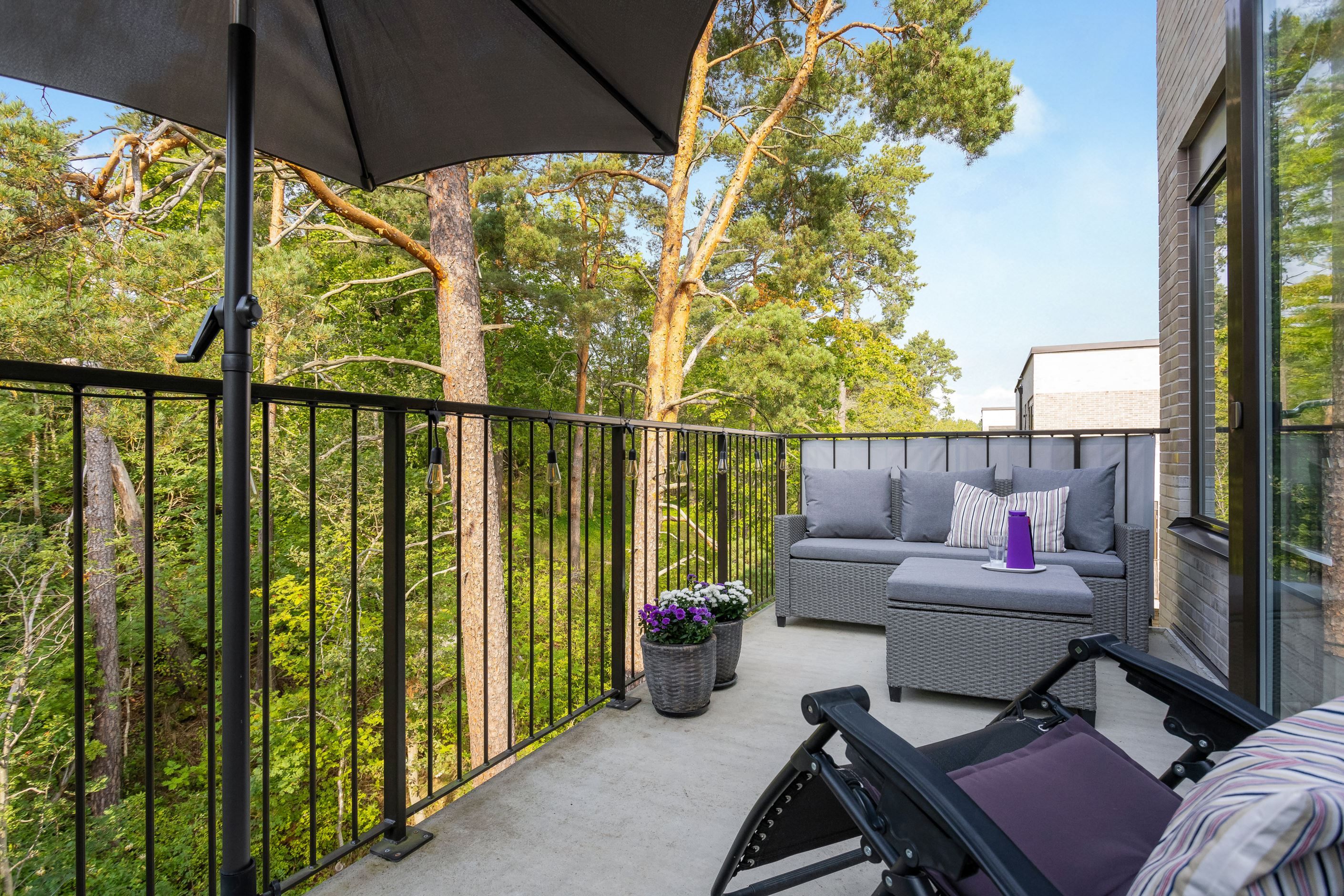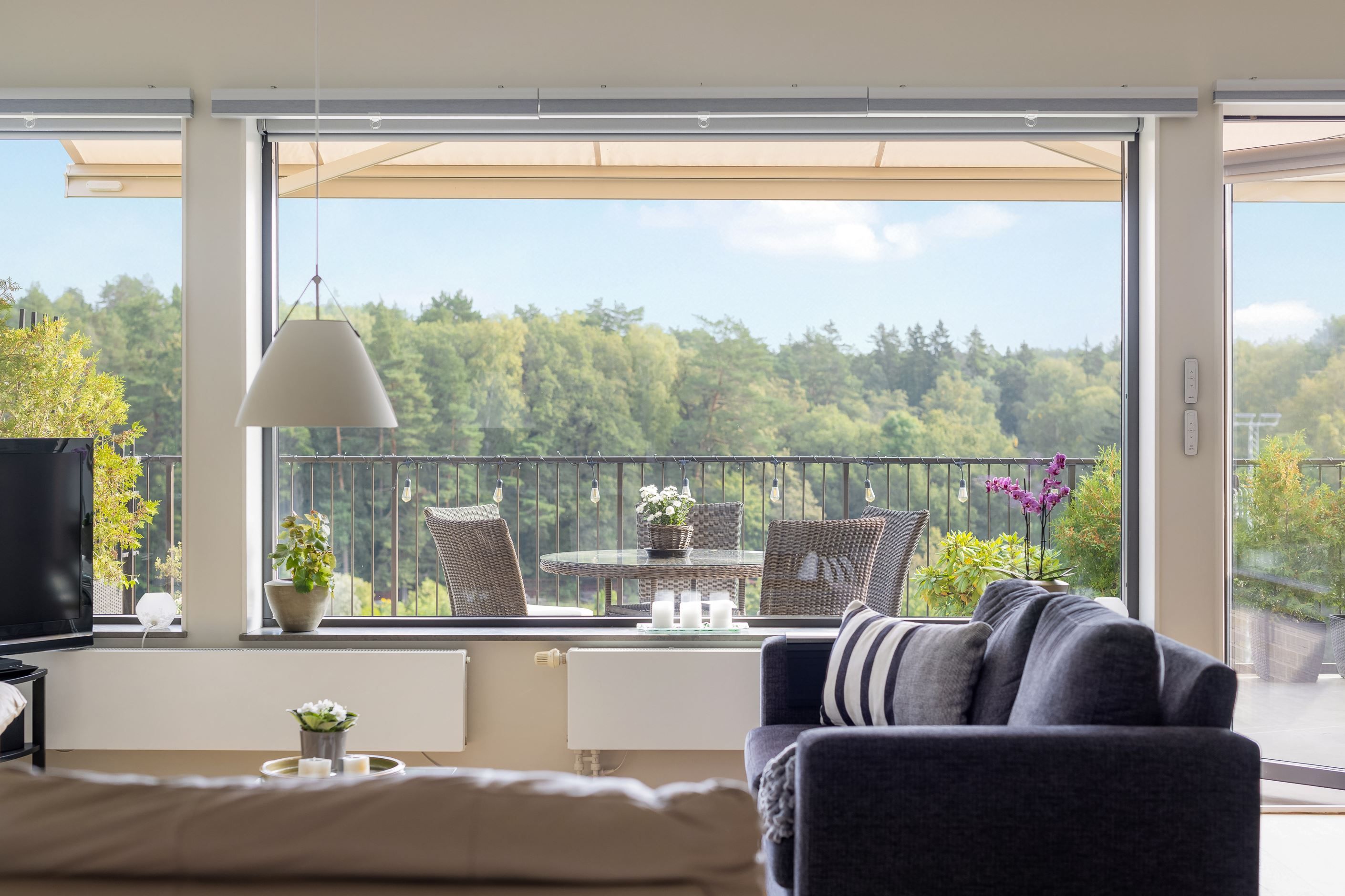 Lägenheten har moderna lösningar såsom elektriskt fjärrstyrda rullgardiner i vardagsrummet samt elektrisk markis mot terrassen. Markisen har en automatisk solsensor och vindskydd som går ut vid sol och drar sig tillbaka vid kraftigare vind automatisk intill finns på terrassen.