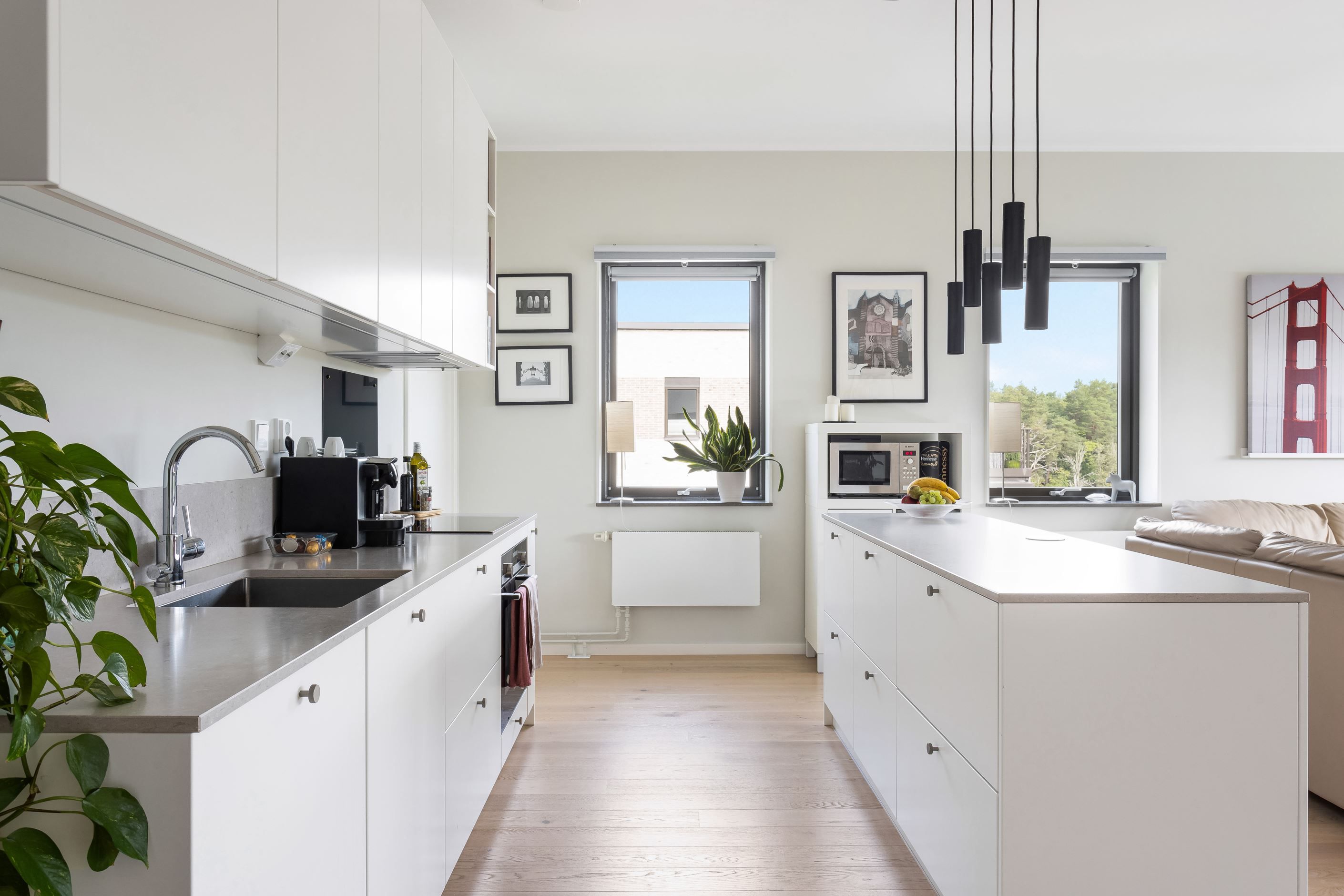 Lägenheten präglas av en genomtänkt planlösning och arkitektonisk finess signerad Dinell Johansson och Aros Bostad – där materialvalen är noga utvalda för att ge både funktion och stil. Två badrum och egen tvättstuga räknar upp vardaglig bekvämlighet, medan balkonger och fönsterpartier integrerar lägenheten med de omkringliggande grönområdena.