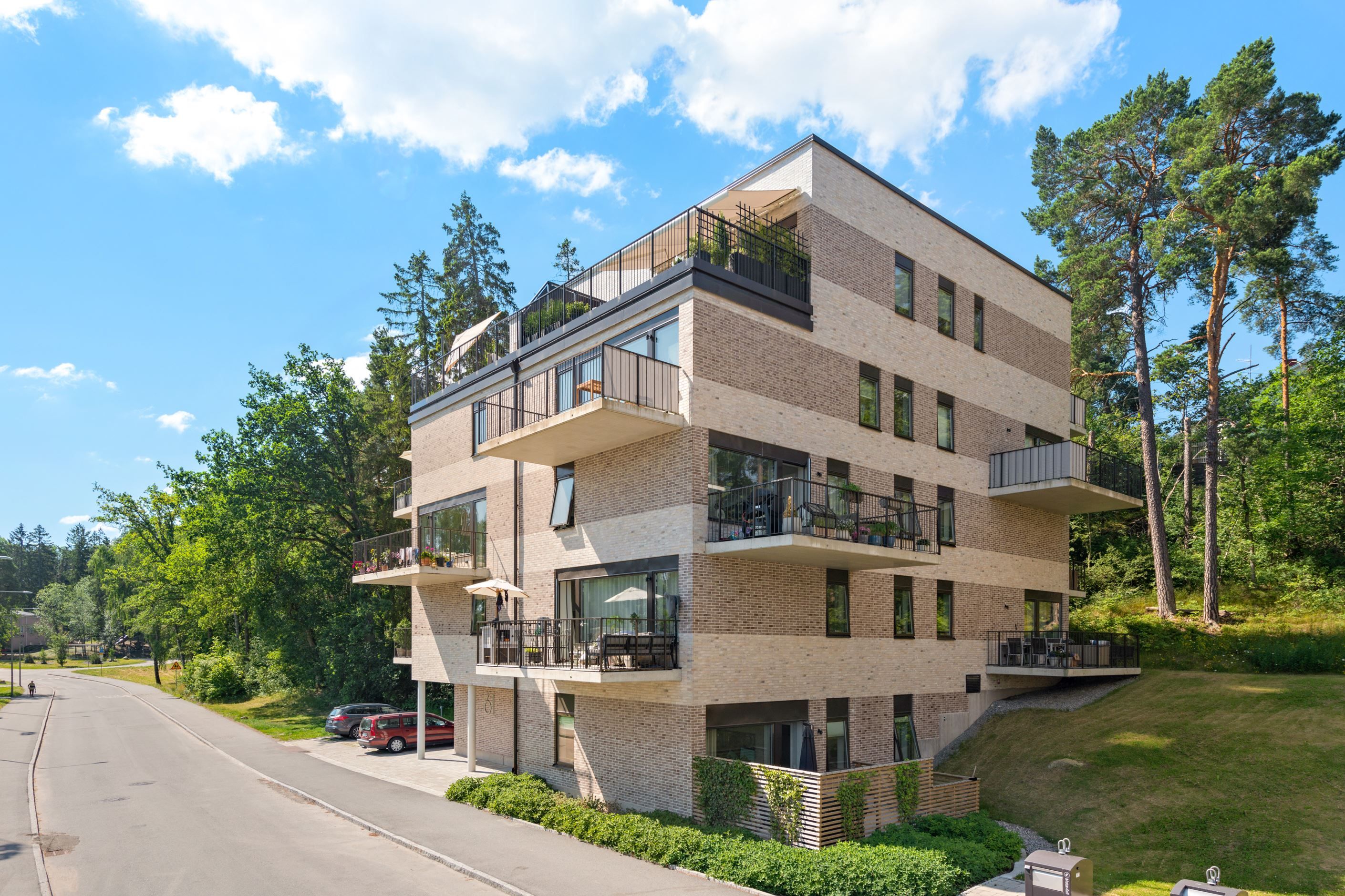 Nockebyhov är ett idylliskt område där träden klättrar upp mot husen och grönskan möter moderna byggnader i stenstruktur liknande tegel – robust, elegant och långlivad. Här finns Judarskogens naturreservat, Mälarens strand och fina promenadvägar alldeles runt hörnet – perfekt för vardagsmotion, jogging, cykling eller bad.