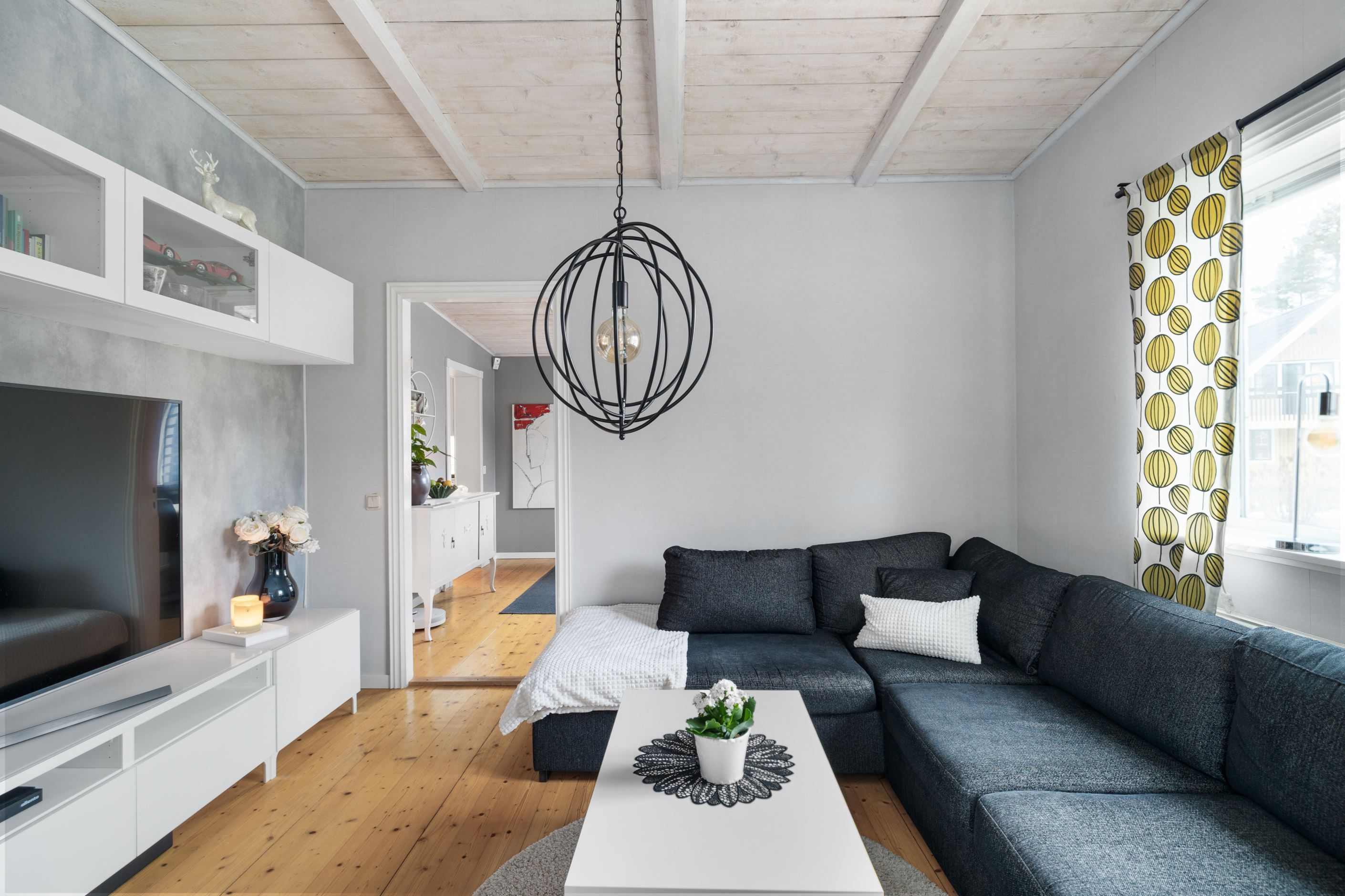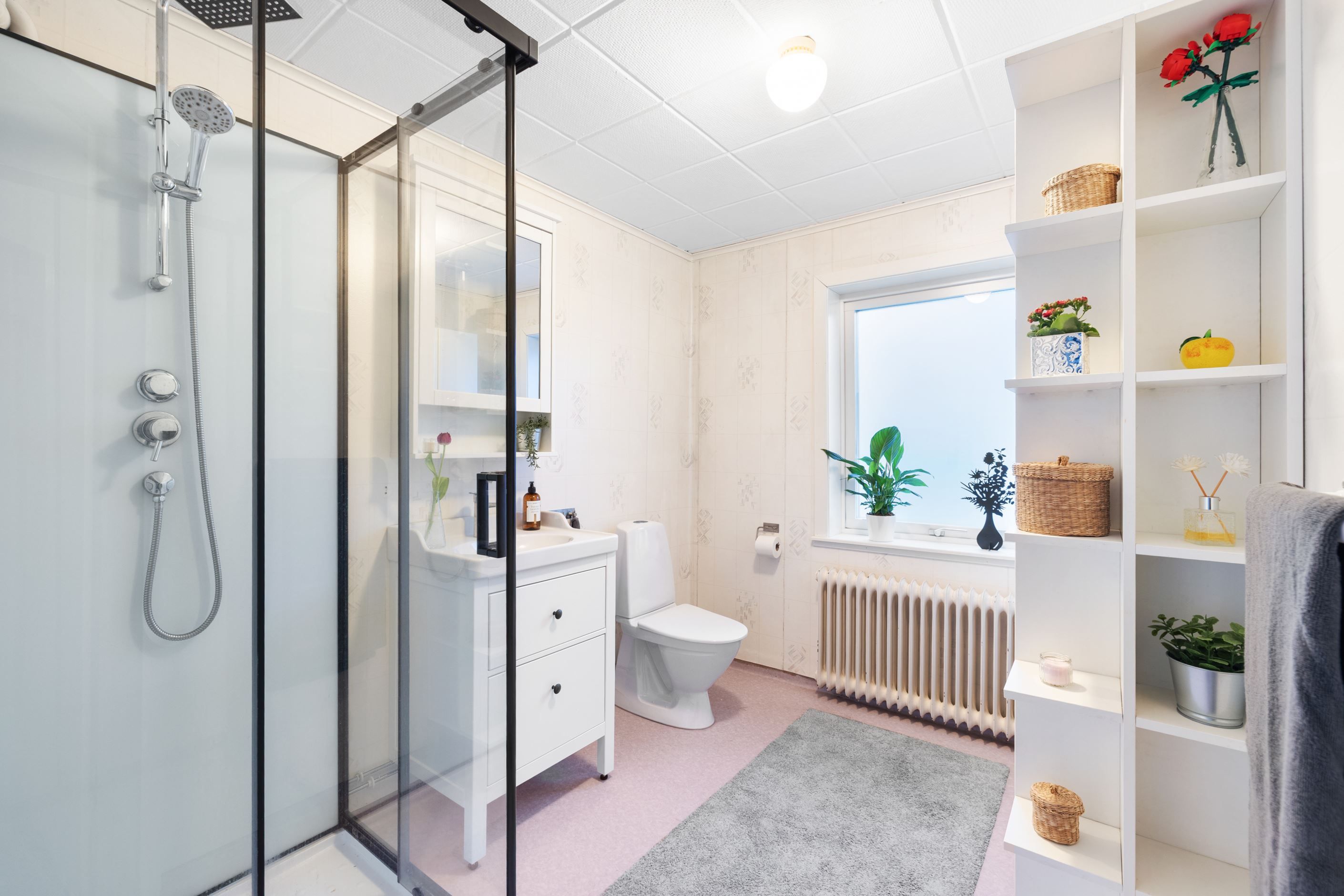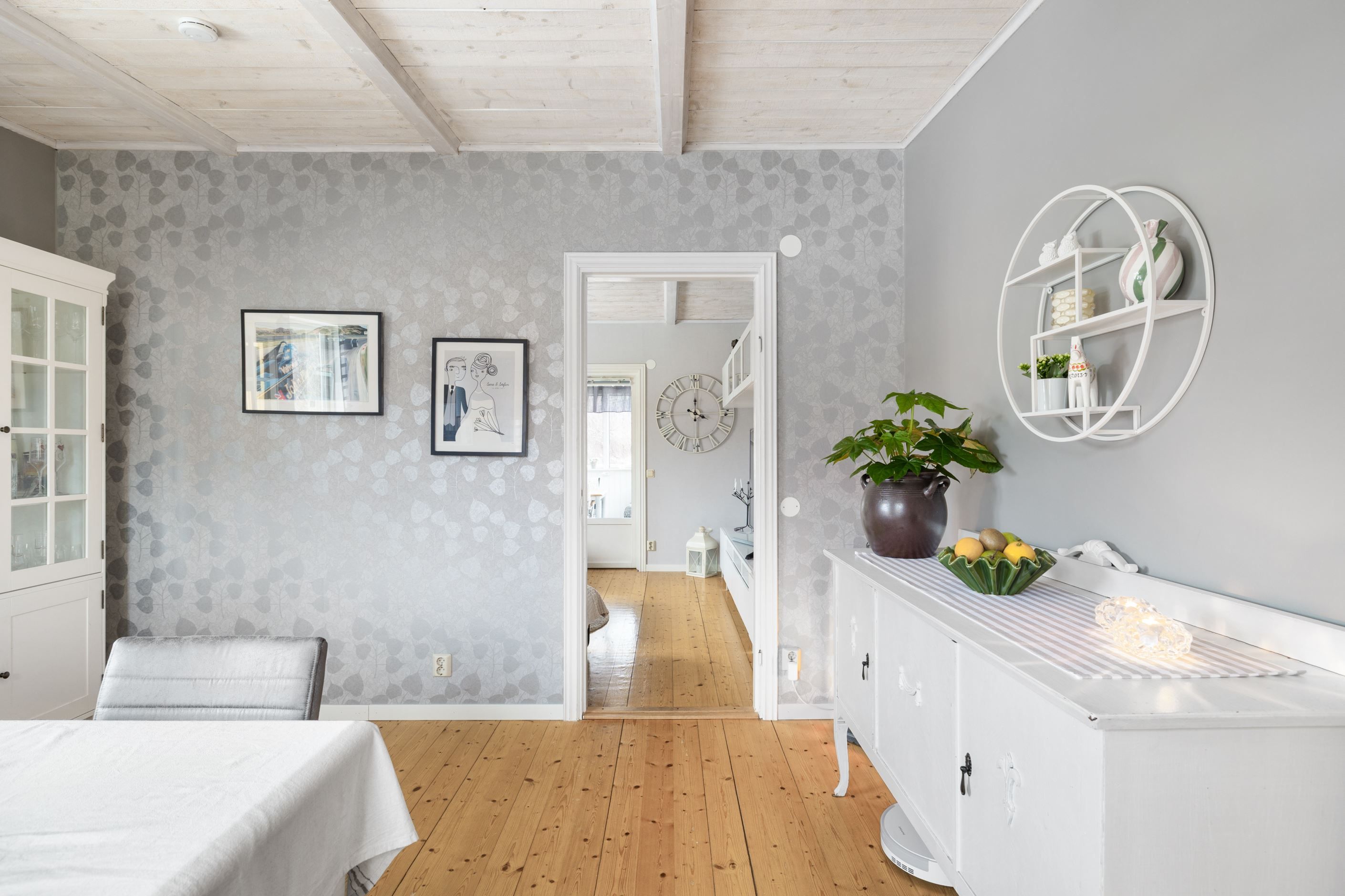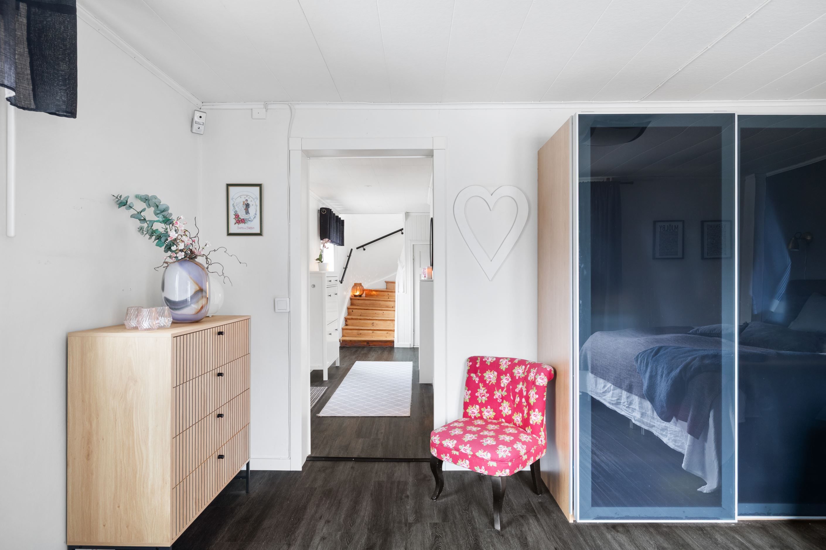 Bostaden erbjuder en välplanerad boarea om 129 kvm samt cirka 40 kvm biyta, fördelat på totalt fyra sovrum, varav ett är beläget på entréplan och tre på ovanvåningen. Ovanvåningen lämpar sig väl som en egen avdelning för barn eller tonåringar. Planlösningen kompletteras av badrum med dusch på entréplan samt wc på ovanvåningen, vilket skapar en funktionell vardag för familjen.