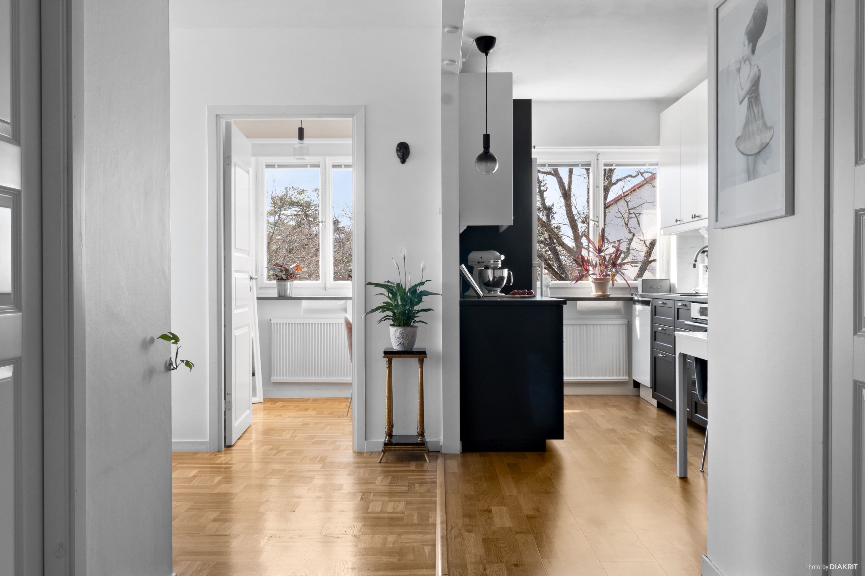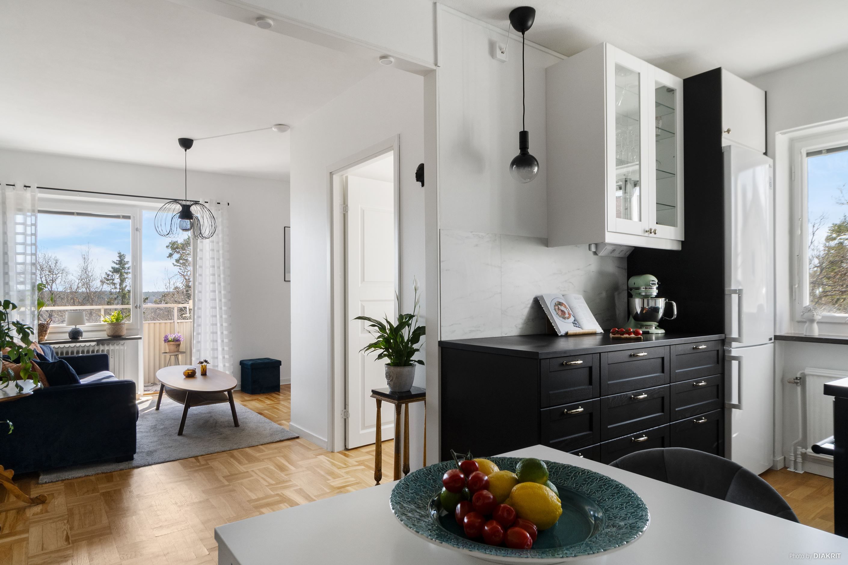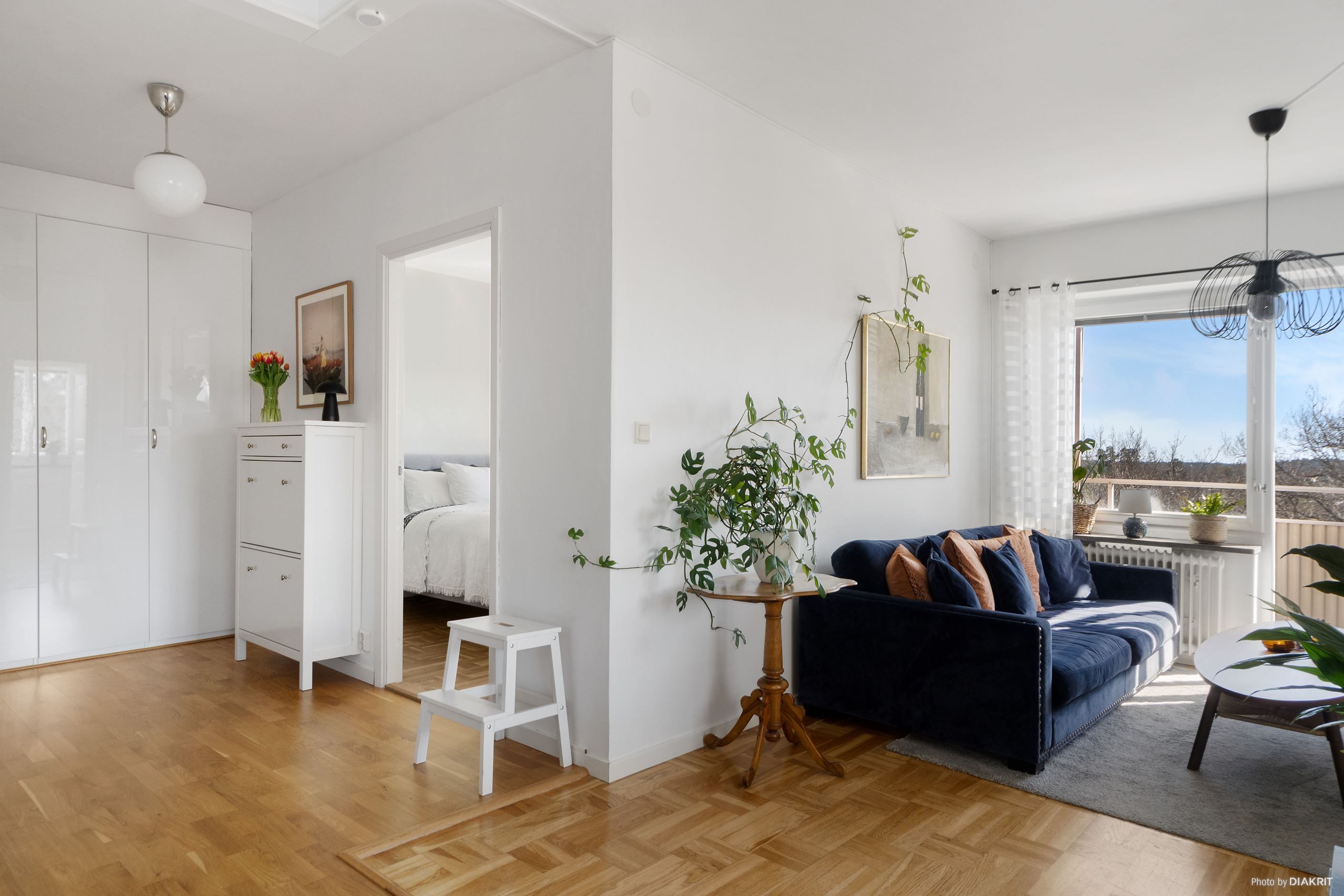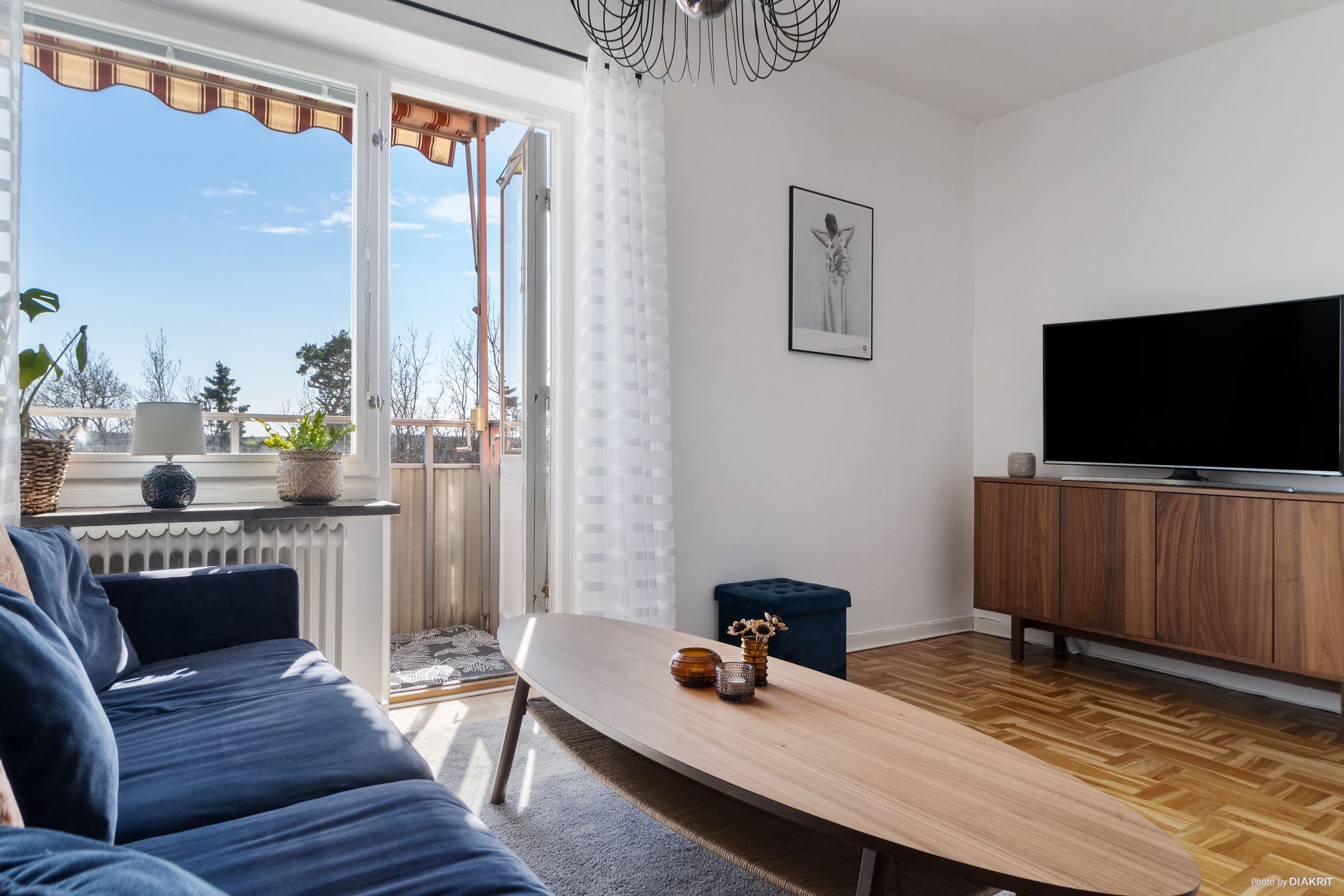 Lägenheten har genomgående fina ytskikt med parkettgolv samt ljust målade väggar och vackra fondtapeter, vilket ger en känsla av stilfullhet och rymd. Vardagsrum med utgång till solig södervänd balkong med härlig utsikt. Vardagsrummet är idag avdelat, vilket ger lägenheten ett litet extrarum. Detta har nuvarande ägare tidigare haft nytta av som en extra sovplats (en 120 cm säng går in) och nu som kontor. Praktiskt kök, renoverat 2019, med snygg inredning i vitt och svart. Rymlig matplats invid köket, där även gäster får plats. Fint sovrum med gott om plats för dubbelsäng samt bra förvaring i garderober. Dusch/wc med kaklade väggar och klinkergolv samt tvättmaskin.