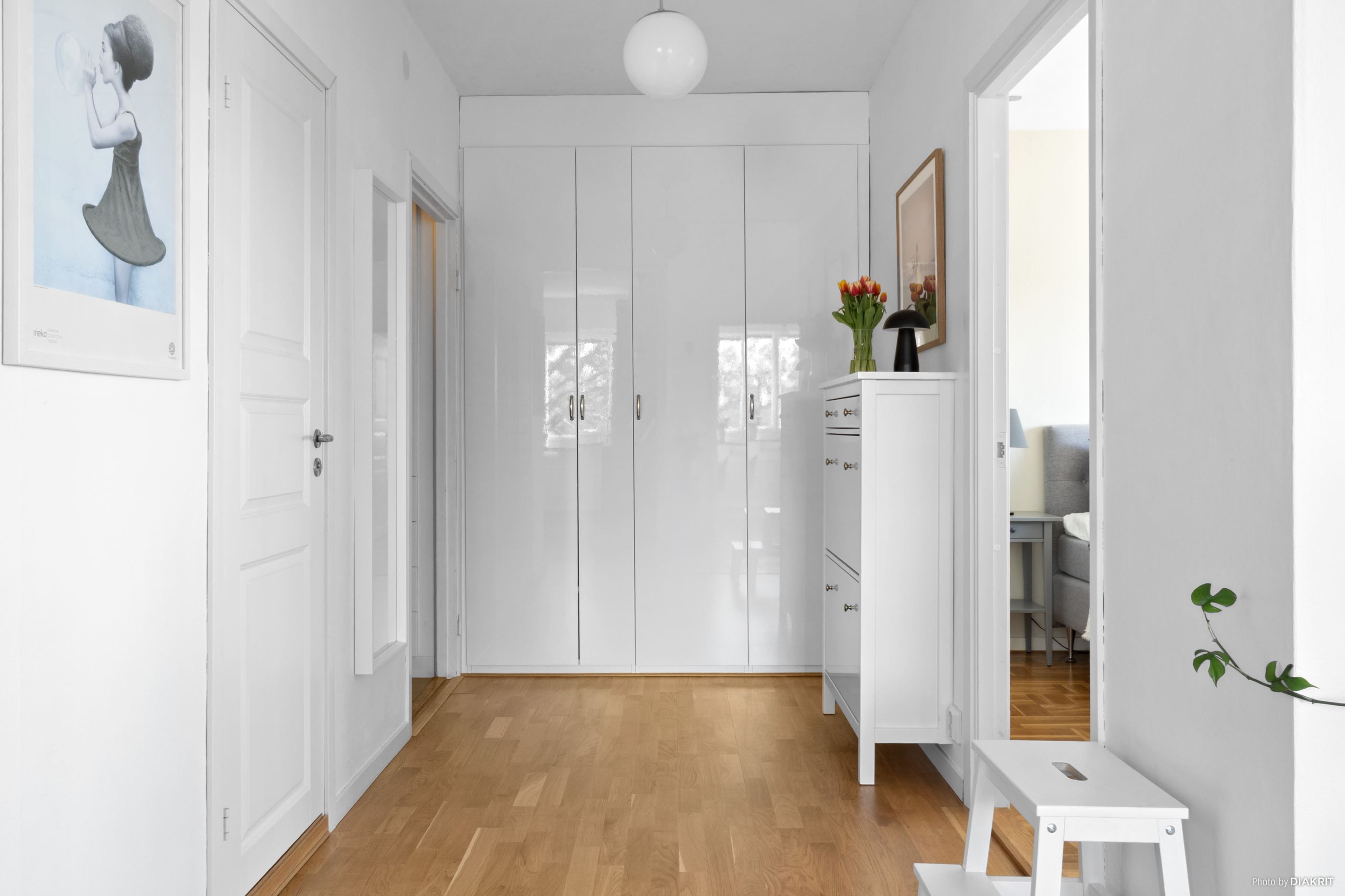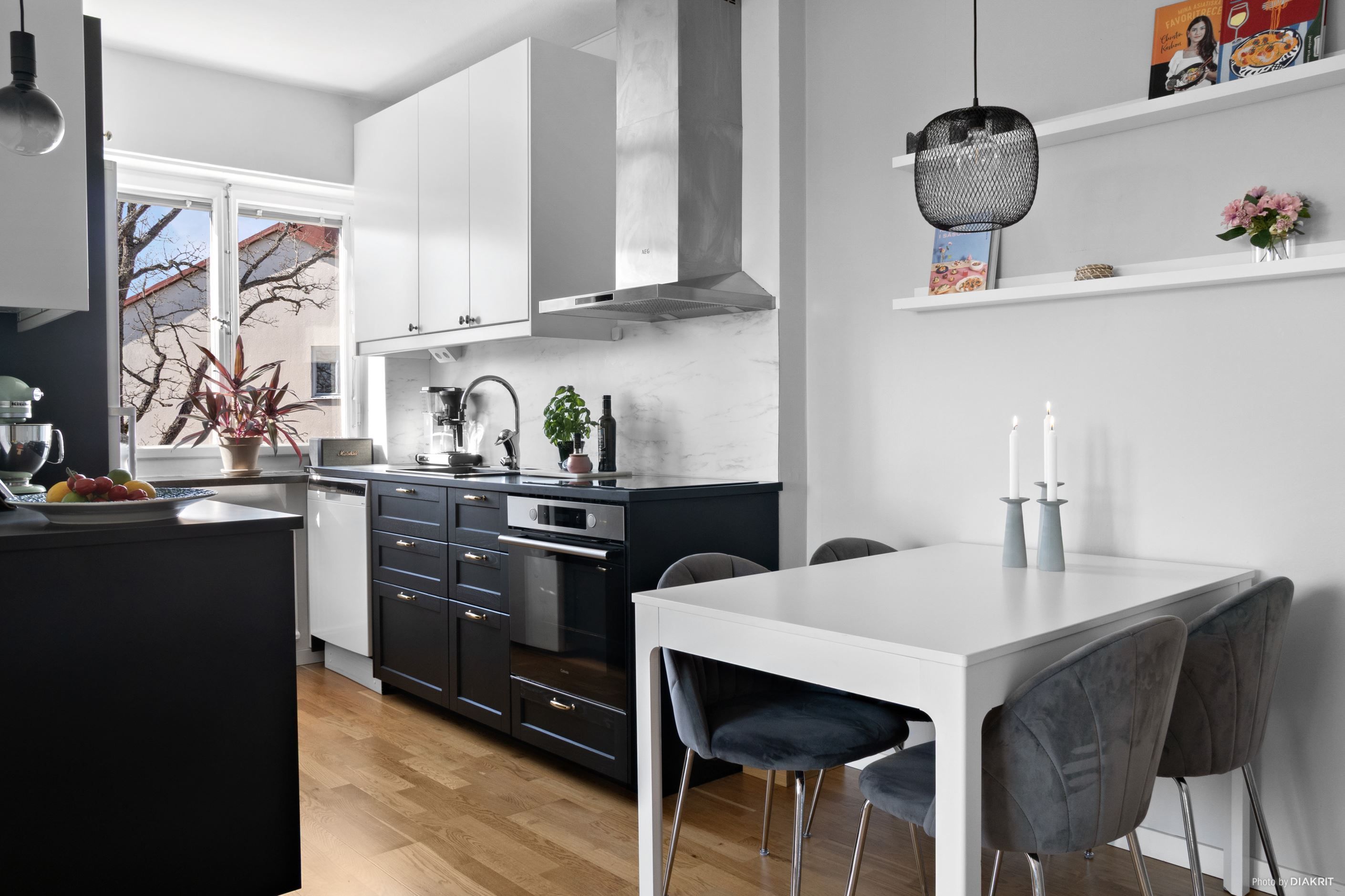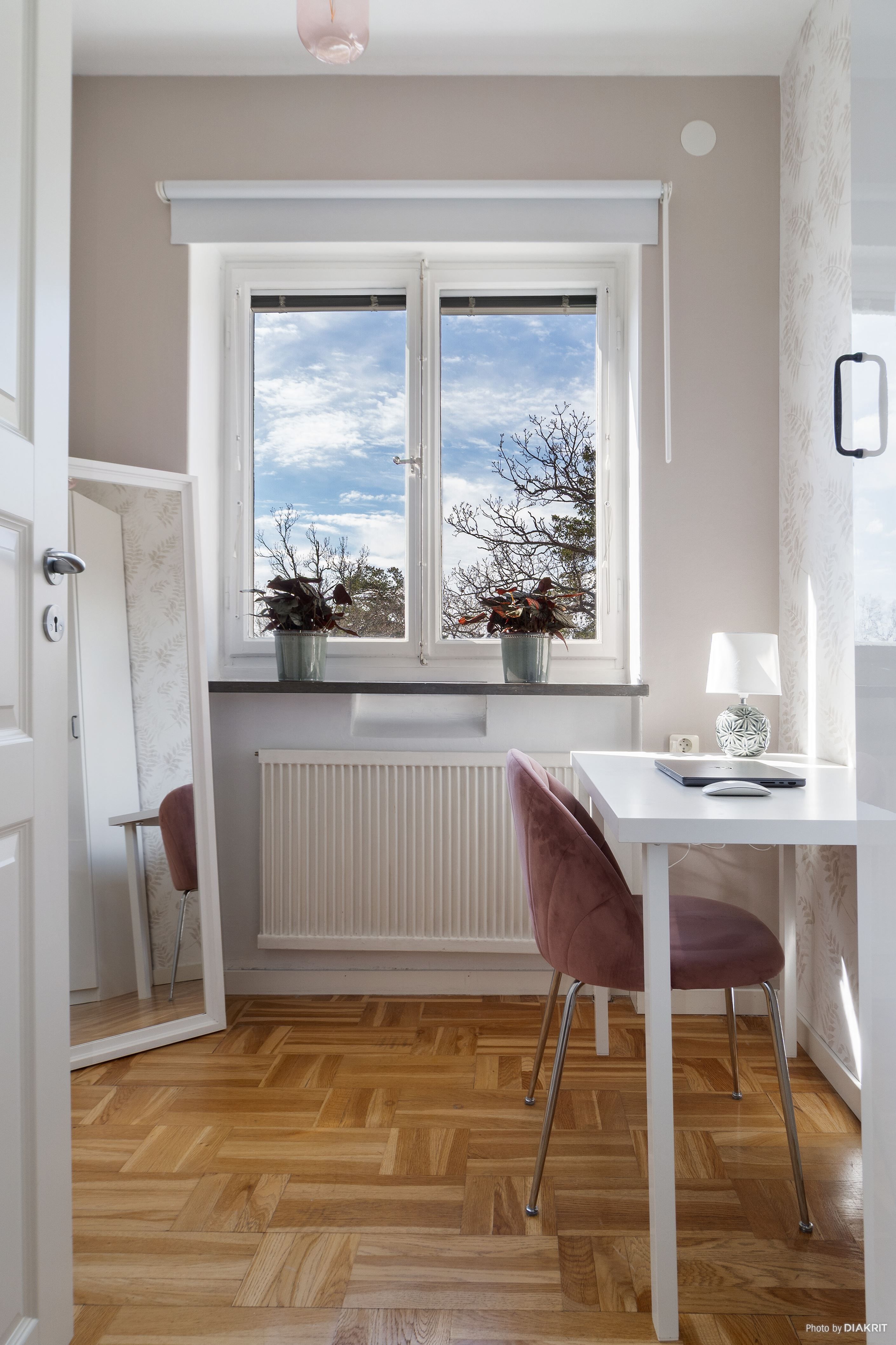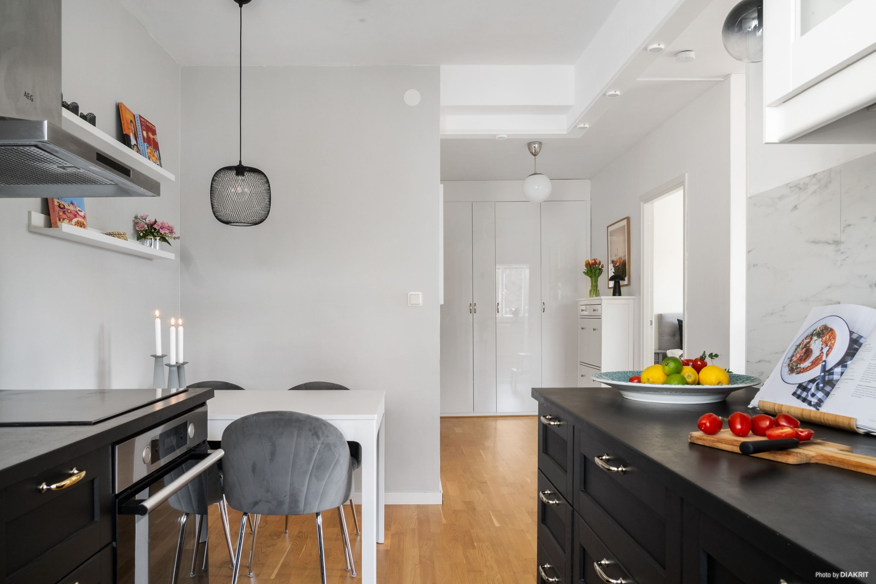 Lägenheten har genomgående fina ytskikt med parkettgolv samt ljust målade väggar och vackra fondtapeter, vilket ger en känsla av stilfullhet och rymd. Vardagsrum med utgång till solig södervänd balkong med härlig utsikt. Vardagsrummet är idag avdelat, vilket ger lägenheten ett litet extrarum. Detta har nuvarande ägare tidigare haft nytta av som en extra sovplats (en 120 cm säng går in) och nu som kontor. Praktiskt kök, renoverat 2019, med snygg inredning i vitt och svart. Rymlig matplats invid köket, där även gäster får plats. Fint sovrum med gott om plats för dubbelsäng samt bra förvaring i garderober. Dusch/wc med kaklade väggar och klinkergolv samt tvättmaskin.