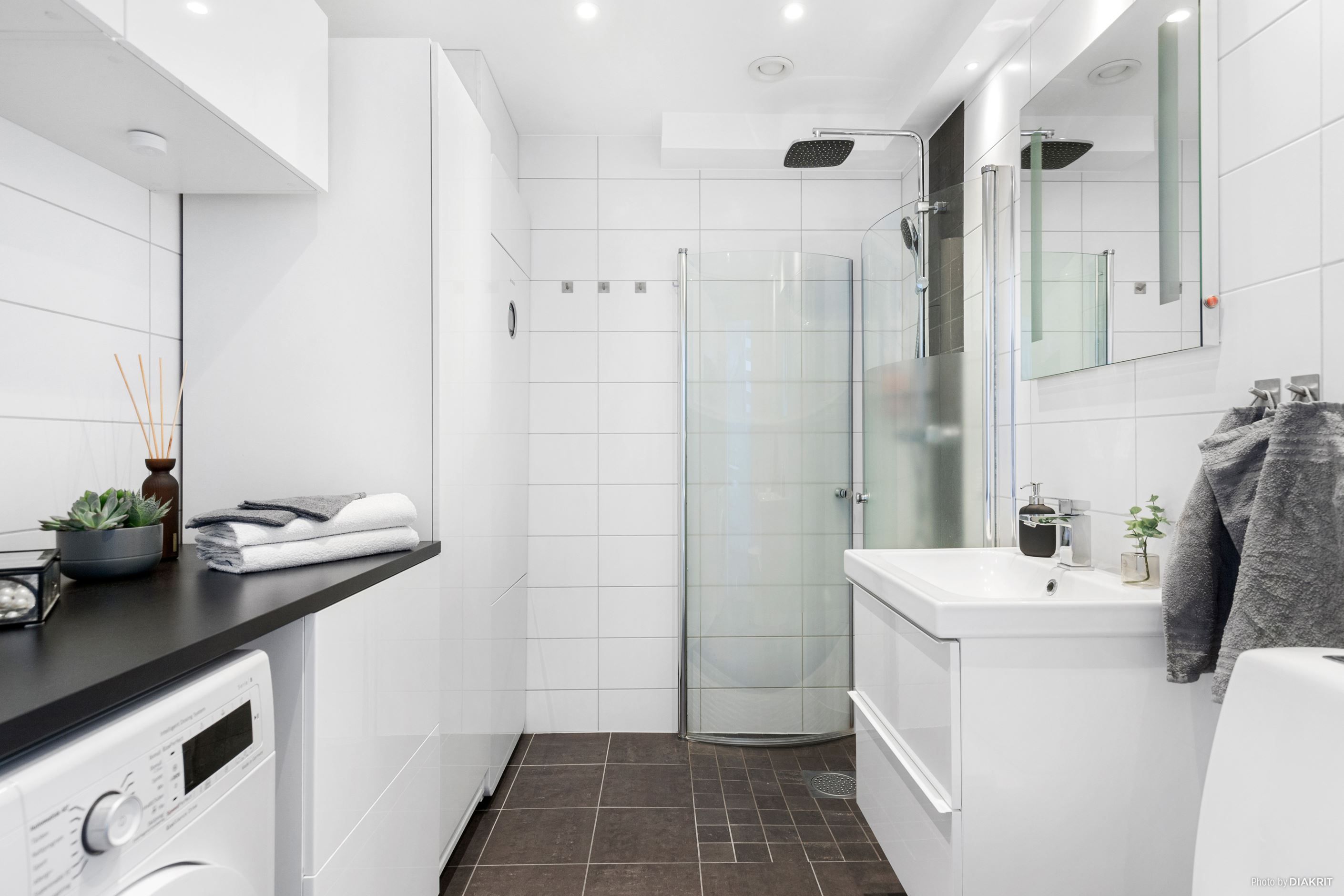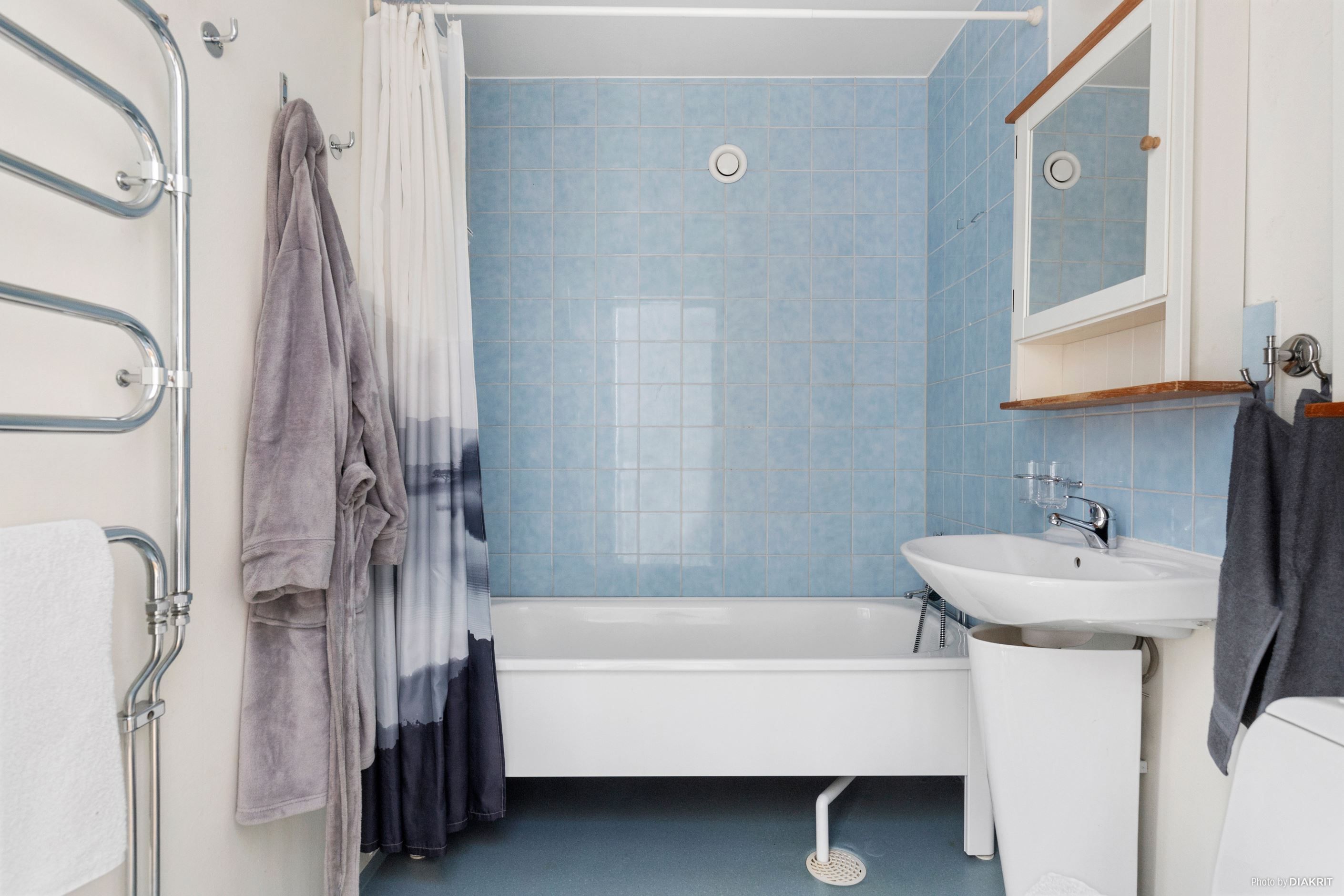Köket renoverades 2010 och erbjuder gott om arbetsytor och förvaring – en naturlig samlingsplats för både vardag och fest. Här finns plats för matbord och trevliga middagar med familj och vänner. Bostaden har två badrum, vilket förenklar vardagen. Badrummet på entréplan är renoverat 2017 med kakel och klinker i stilrena kulörer, här finns WC, handfat med kommod, dusch och tvättmaskin. Badrummet en trappa upp är utrustat med badkar och plastmatta – praktiskt och funktionellt.