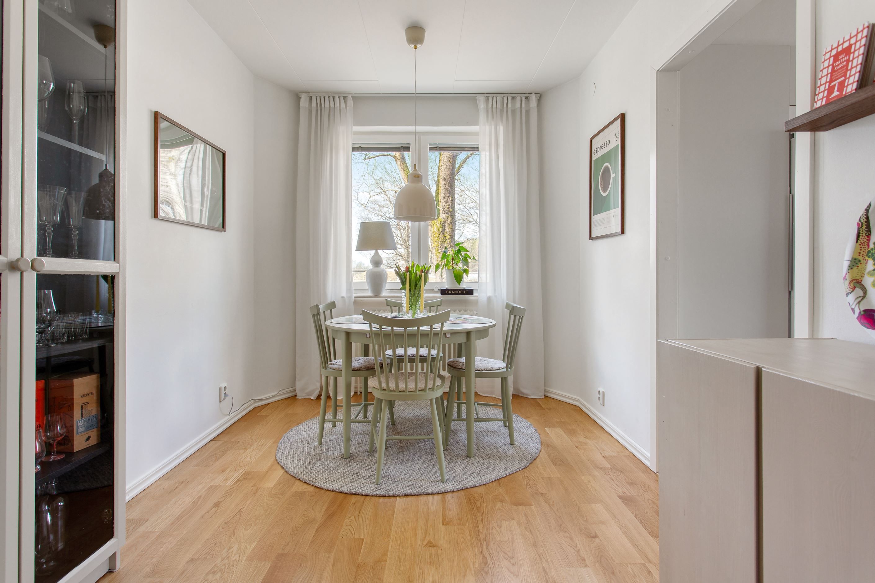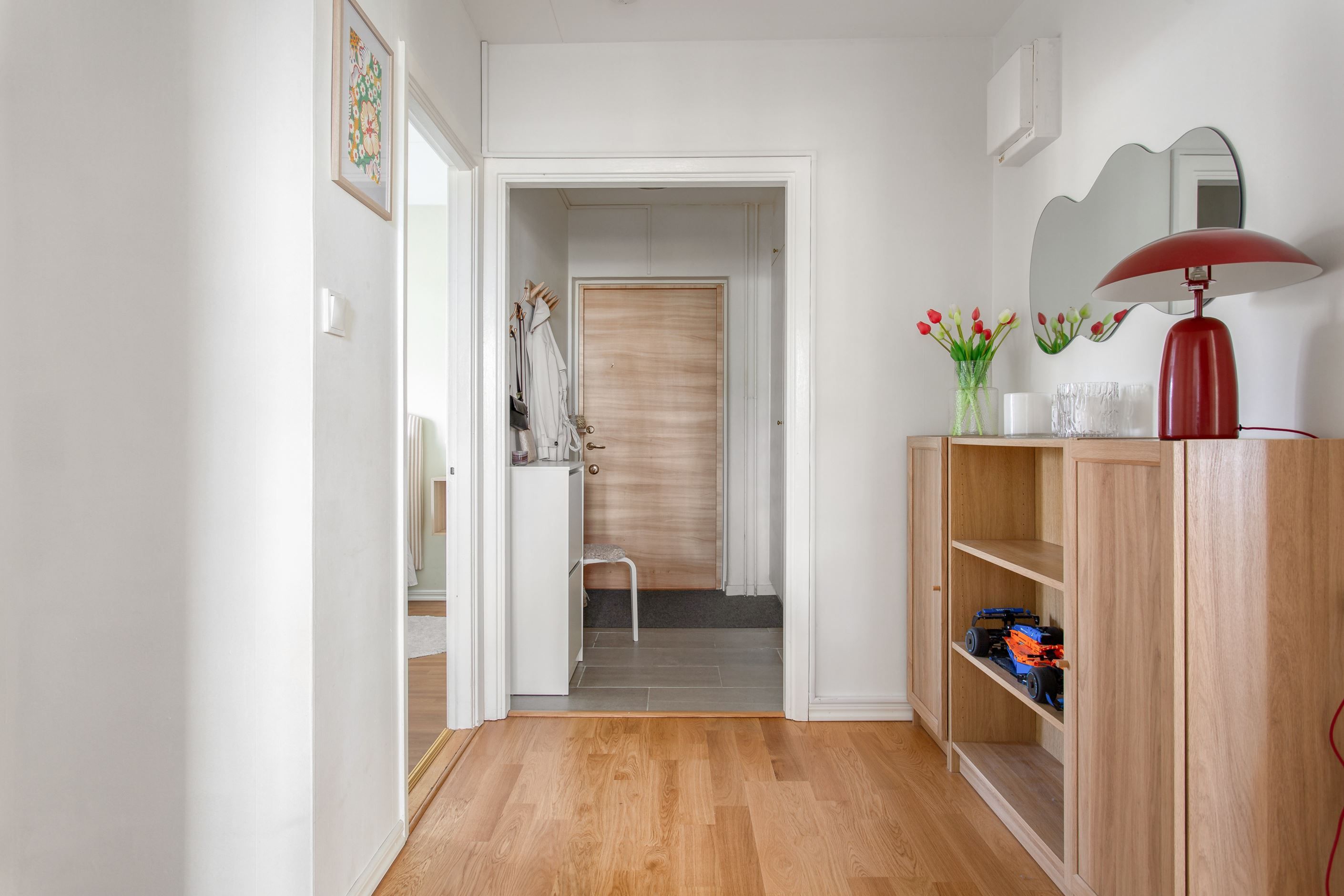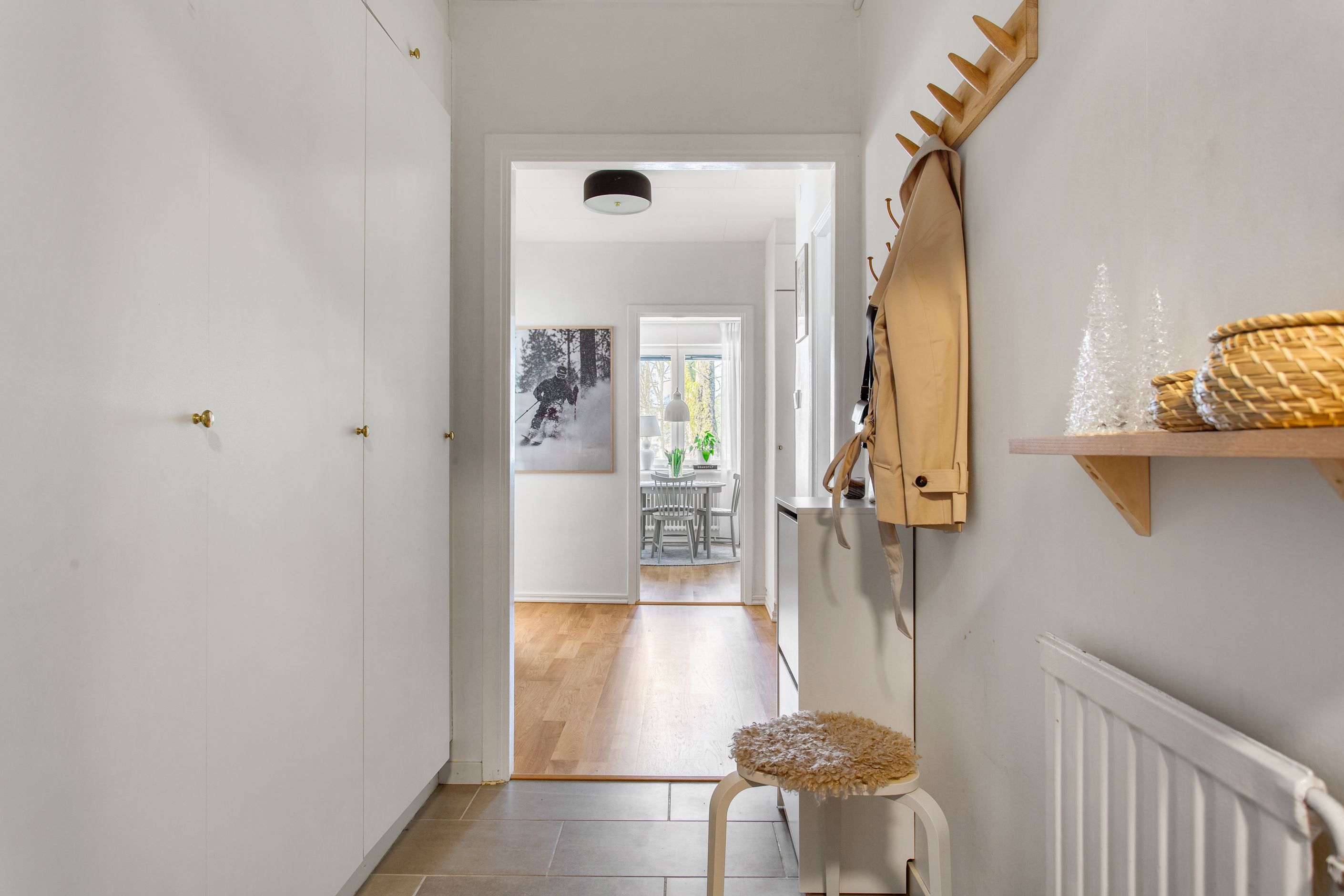 Bostaden präglas av ljusa och luftiga ytor där ett enhetligt golv löper genom hall, kök, matrum och vardagsrum som skapar en harmonisk helhet. Det trivsamma köket (2016) erbjuder både god förvaring och generösa arbetsytor med ett praktiskt matrum intill, medan det rymliga vardagsrummet bjuder in till sociala tillställningar. Här finns även ett badrum utrustat med tvättmaskin samt ett rogivande sovrum med mycket goda förvaringsmöjligheter. Den välplanerade hallen erbjuder dessutom ytterligare förvaring i flera garderober.