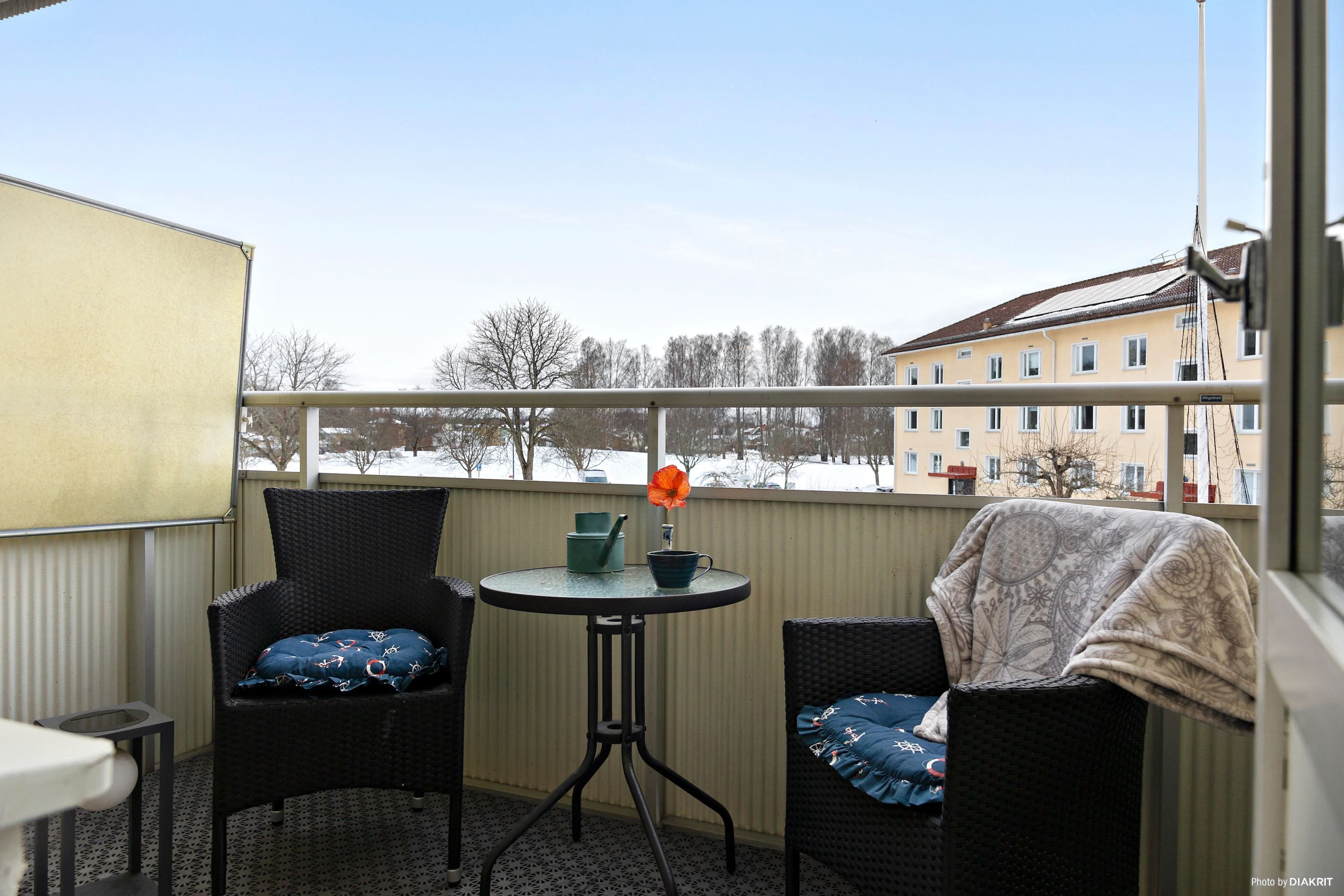 Balkongen nås från vardagsrummet och är en naturlig plats att njuta av lugnet, med den lugna utsikten och solen som sällskap under stora delar av de soliga dagarna.