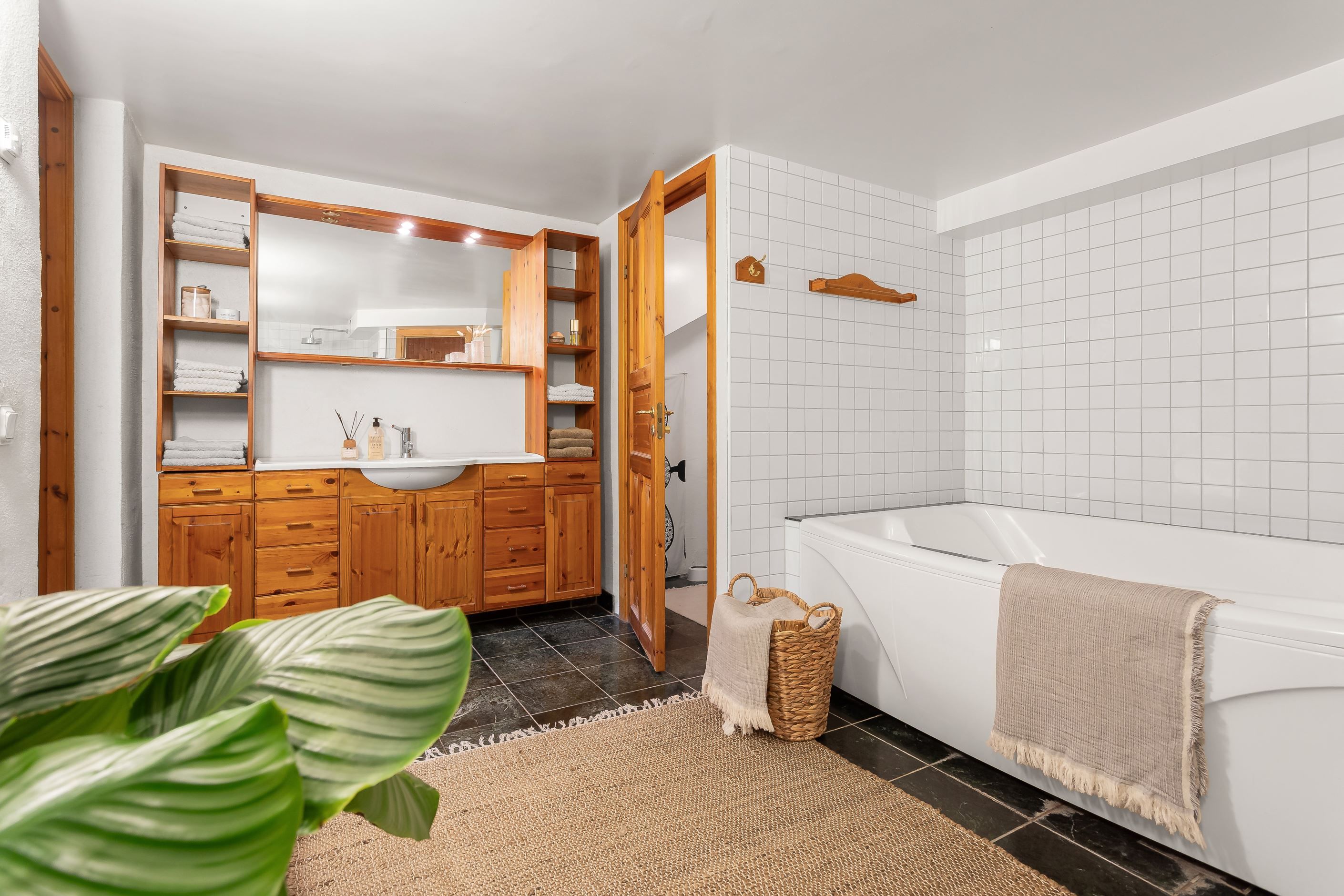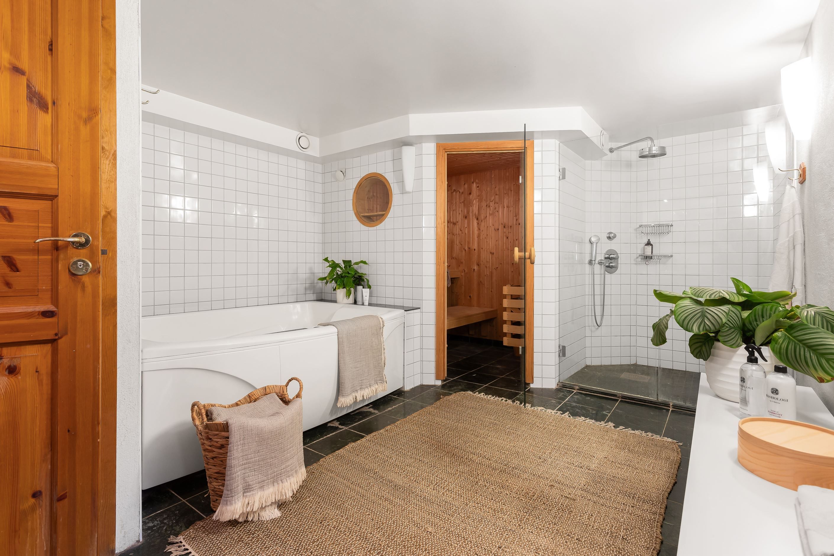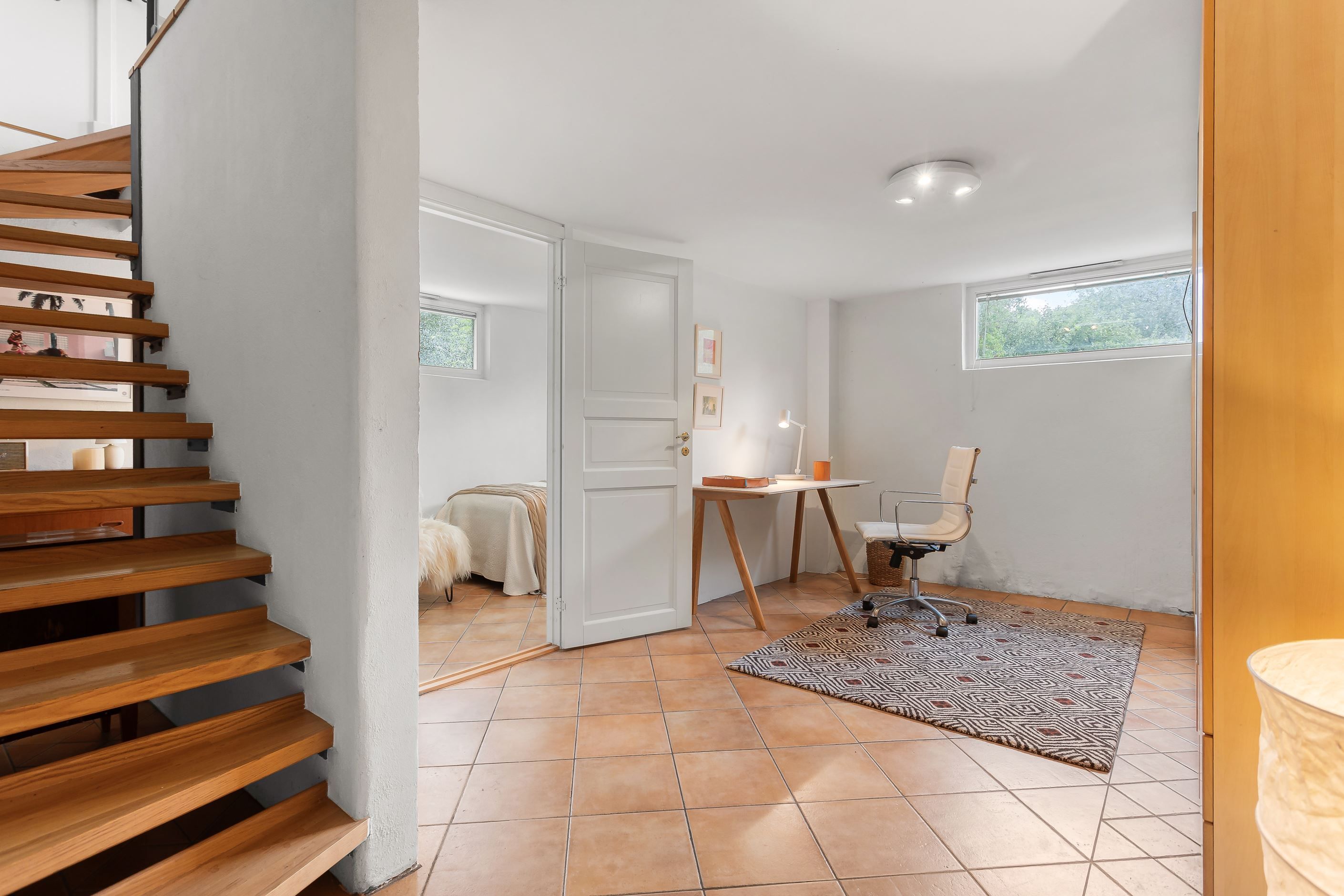 En trappa ner finner du ytterligare ett sovrum samt en flexibel hall som kan användas som arbetsrum eller allrum. Här ligger också det stora badrummet med både bastu och bubbelbad – en riktig vardagslyx. Från källarplanet nås dessutom föreningens tvättstuga som ligger bara några meter från bostaden.