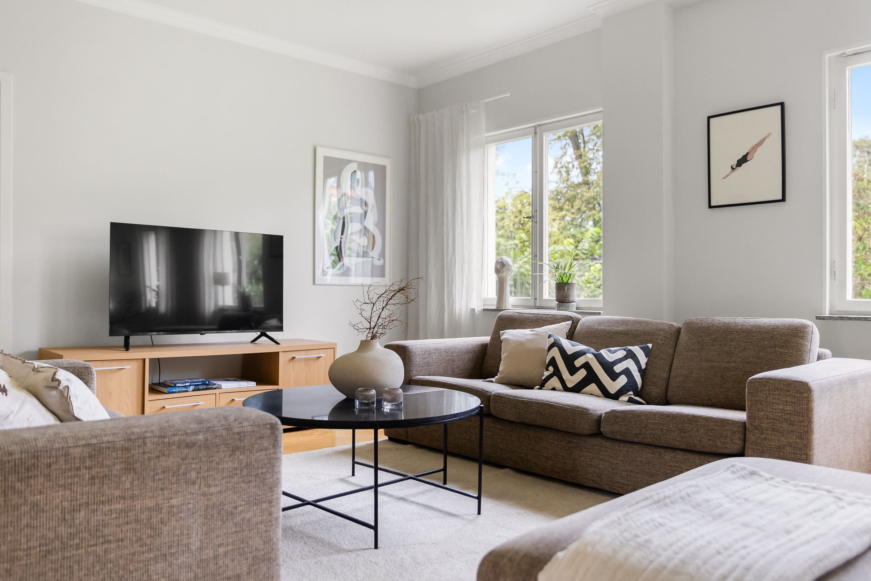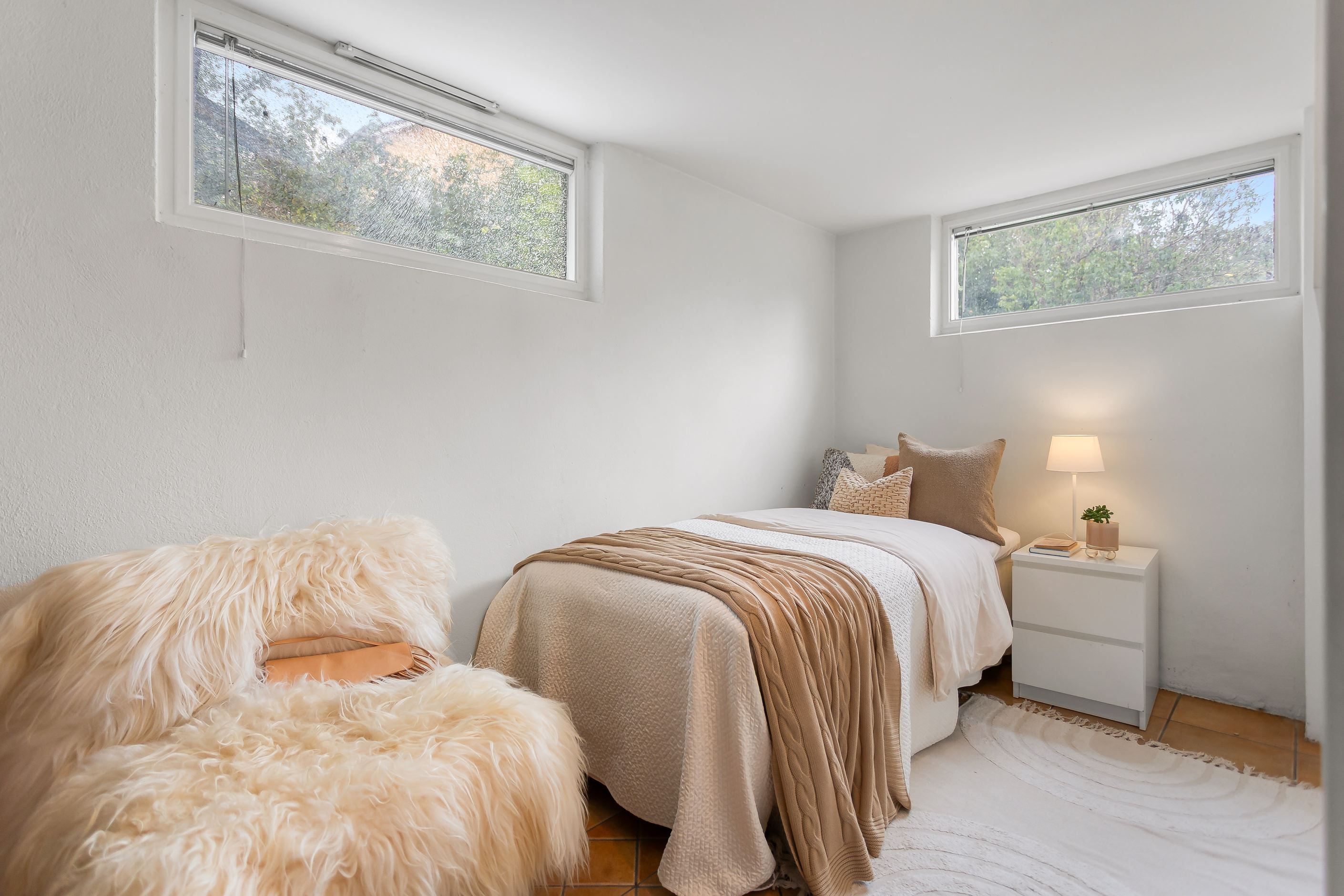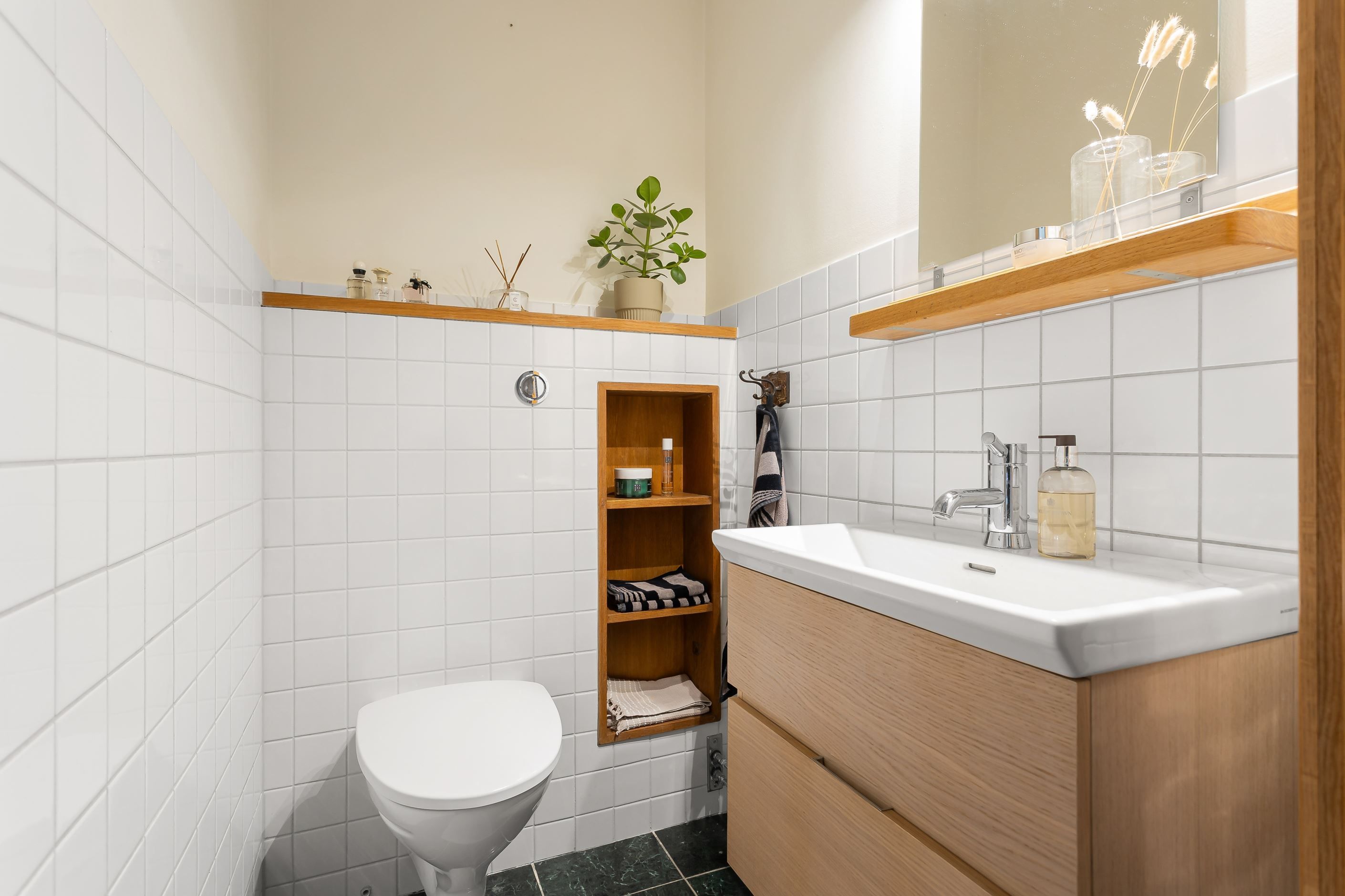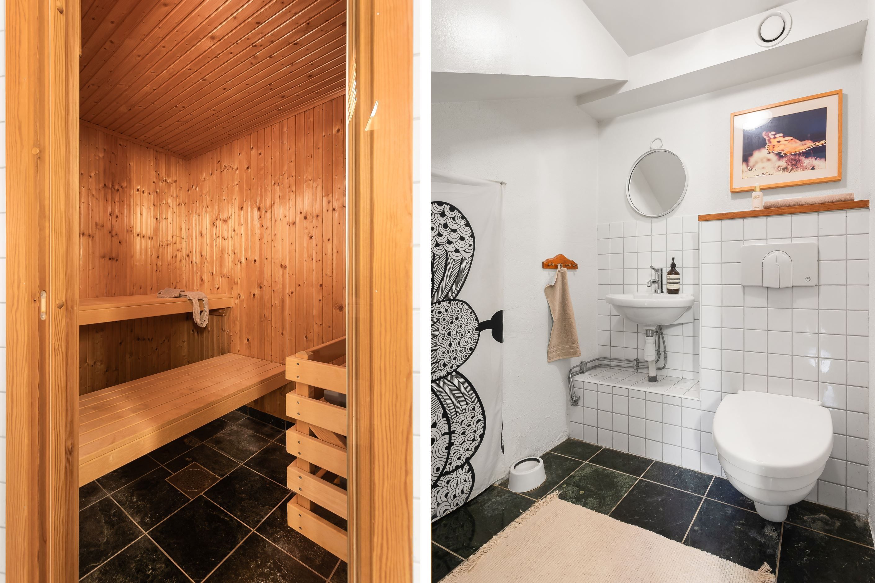 En trappa ner finner du ytterligare ett sovrum samt en flexibel hall som kan användas som arbetsrum eller allrum. Här ligger också det stora badrummet med både bastu och bubbelbad – en riktig vardagslyx. Från källarplanet nås dessutom föreningens tvättstuga som ligger bara några meter från bostaden.