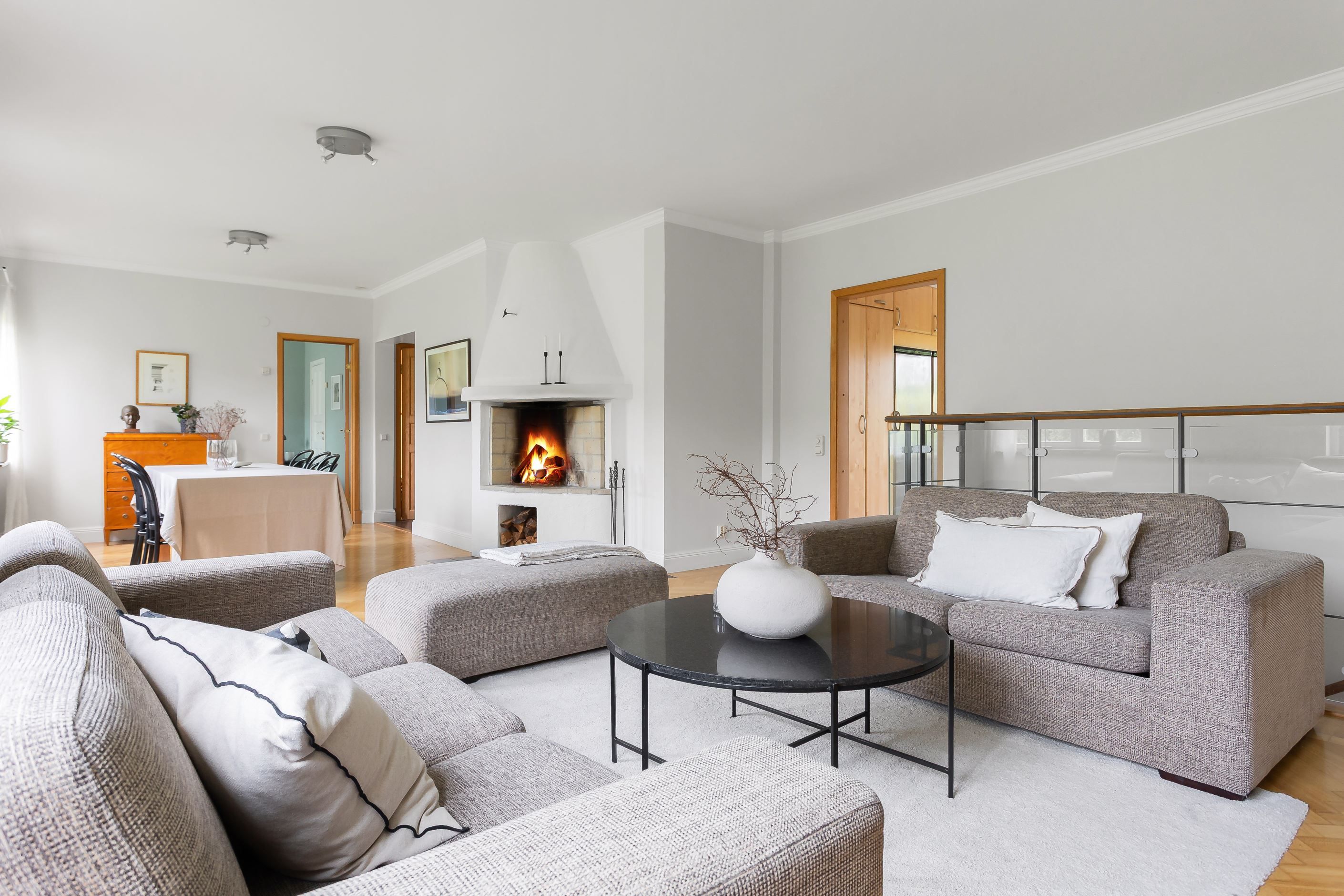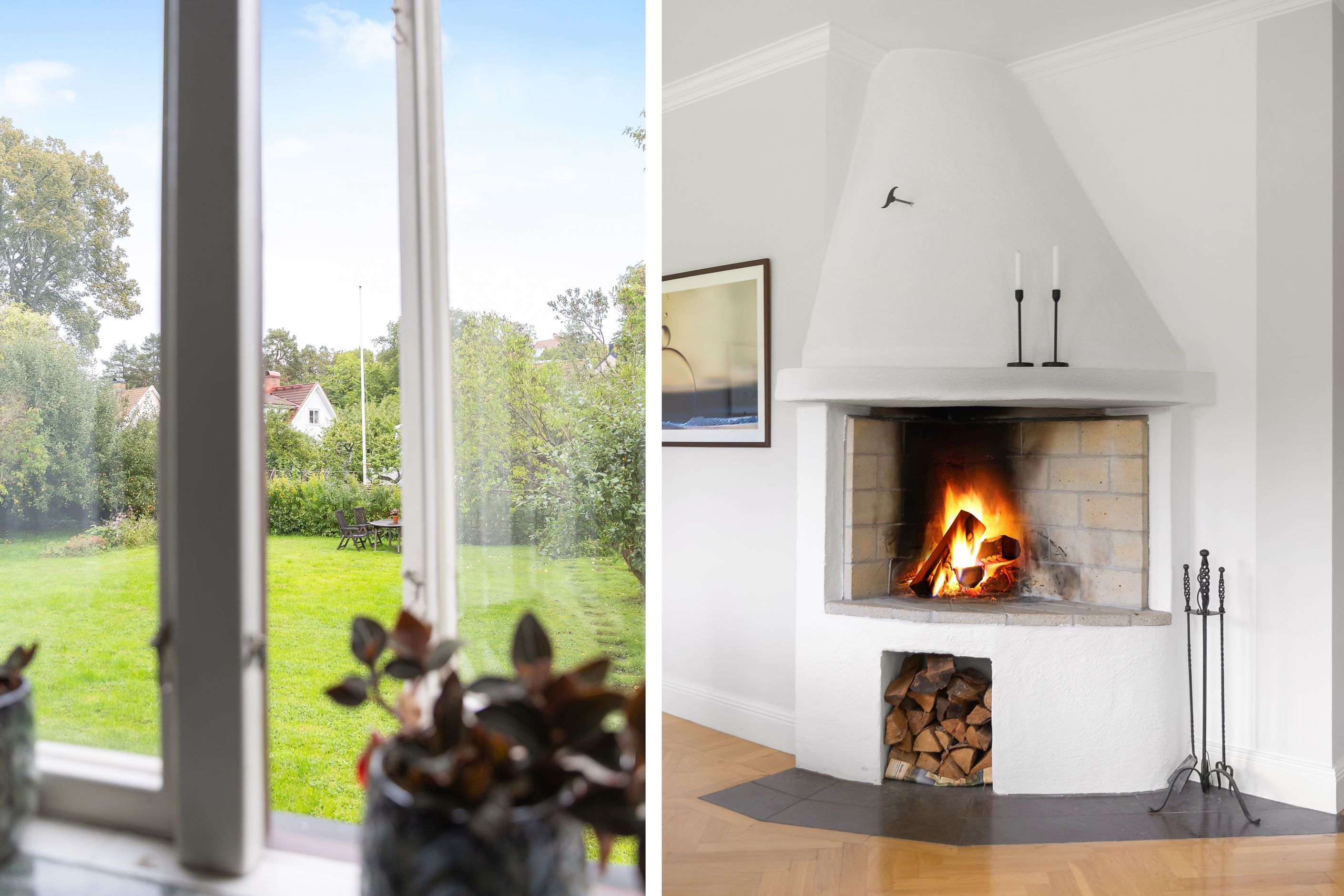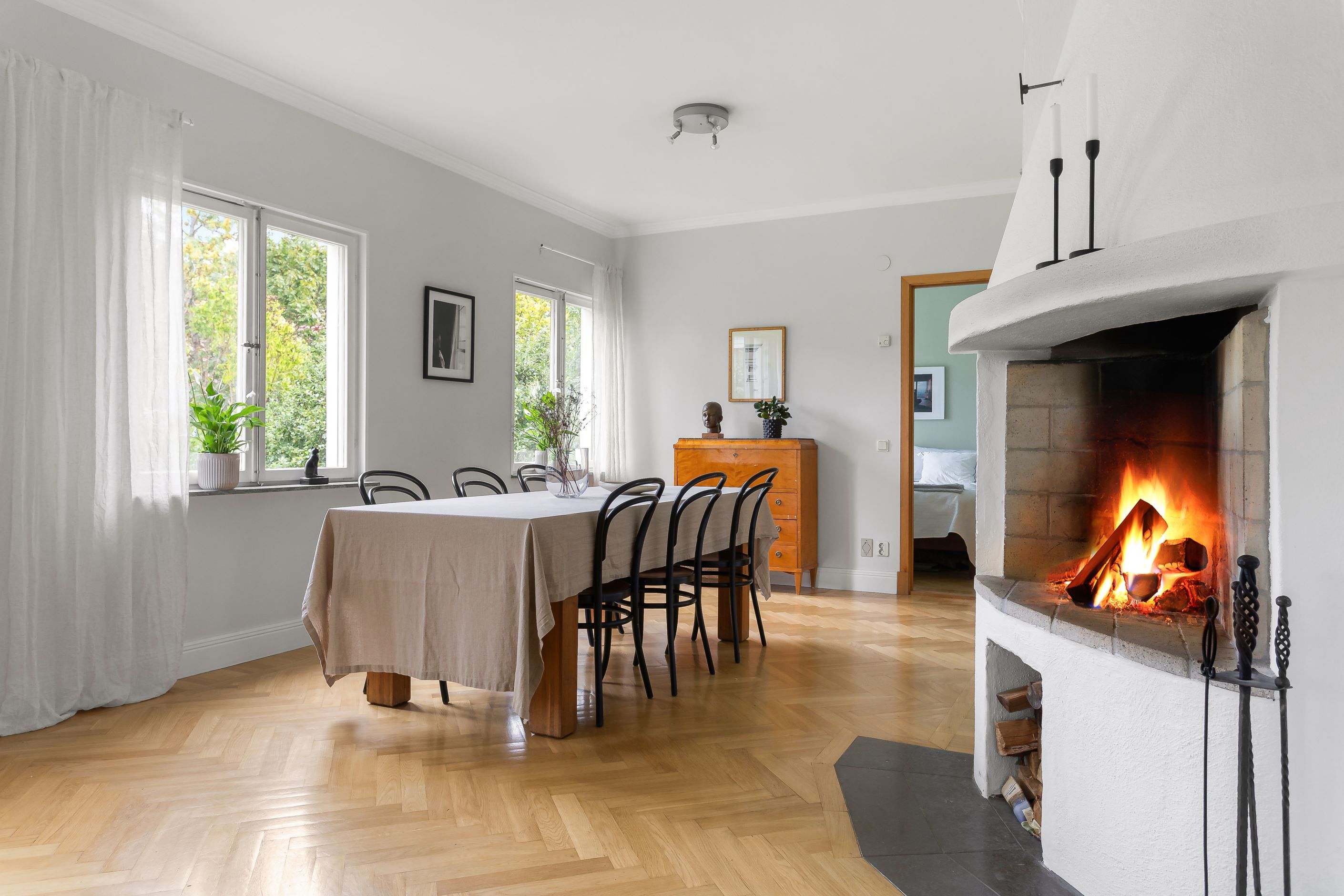 På det övre planet möts du av ett stort och inbjudande vardagsrum med fyra vackra fönster i fil som vetter mot föreningens grönskande trädgård. Här finns gott om plats för både soffgrupp, loungedel och ett långt matbord för det stora sällskapet. Rummet ramas in av vacker fiskbensparkett och en stämningsfull öppen spis. Intill ligger det rymliga köket med generösa förvaringsmöjligheter och direkt utgång till den privata uteplatsen. På samma plan finns även två väl tilltagna sovrum, en stor hall med möjlighet att skapa ett tredje sovrum samt en praktisk wc.