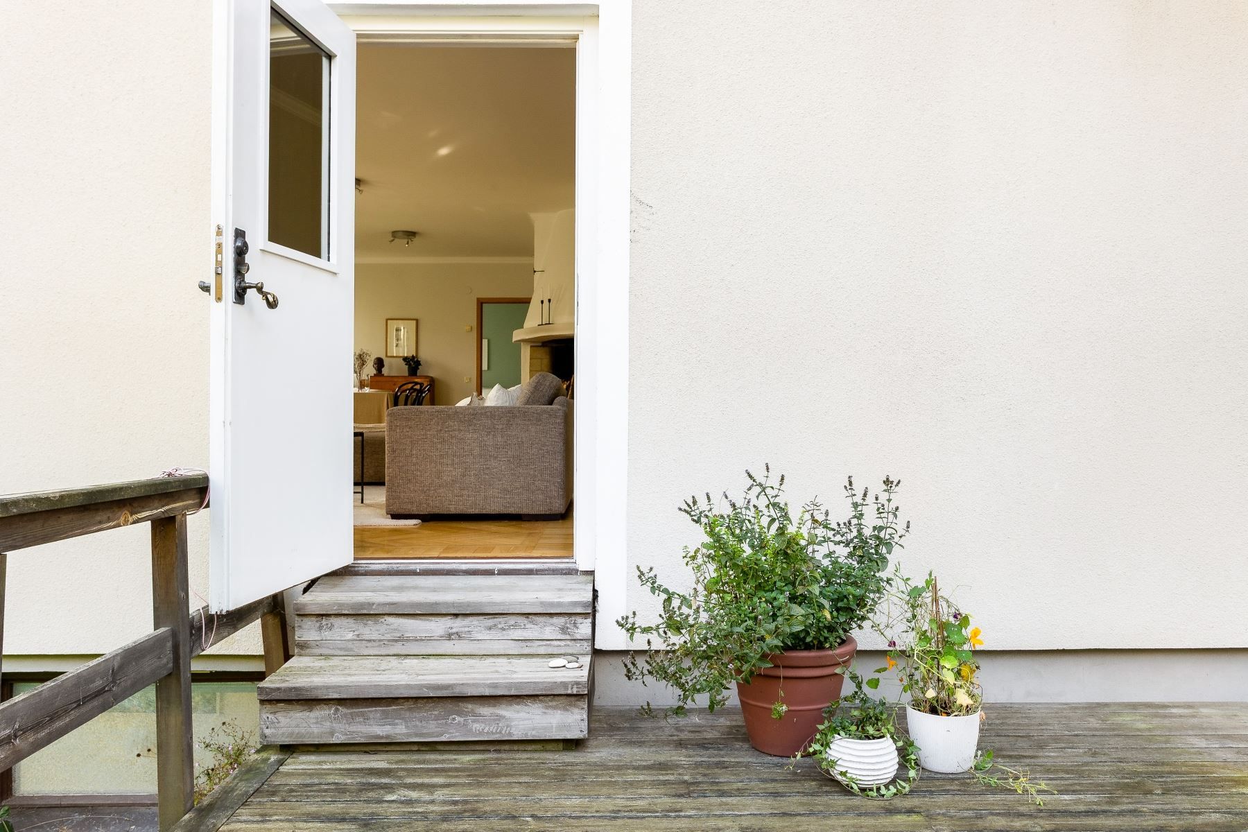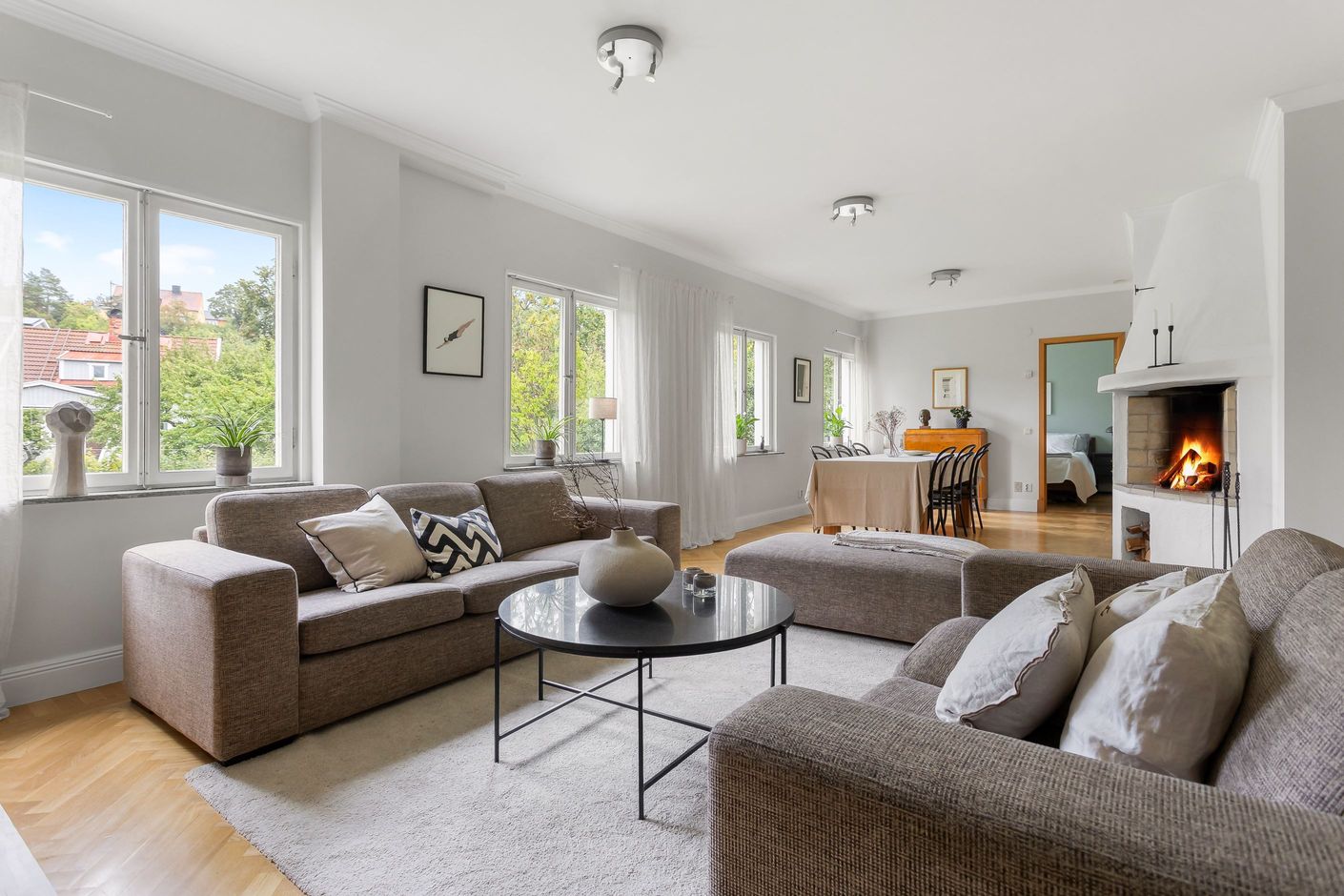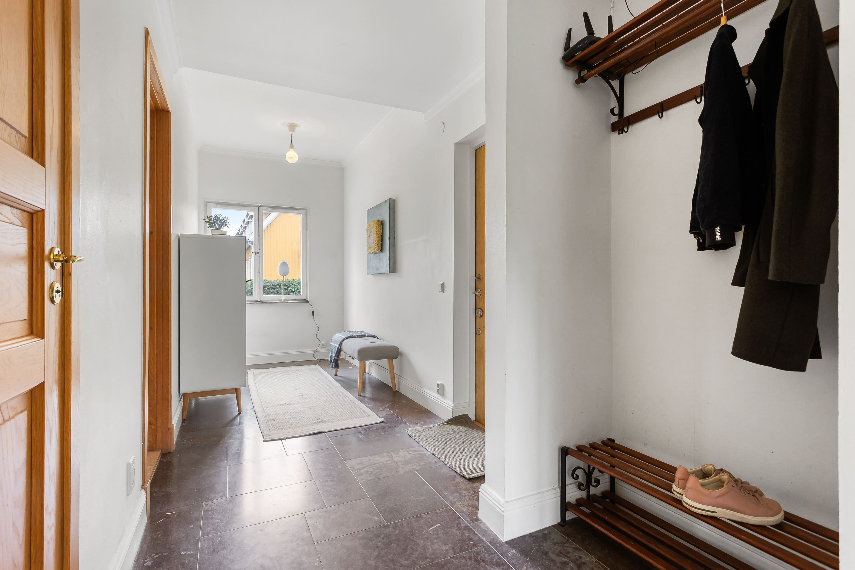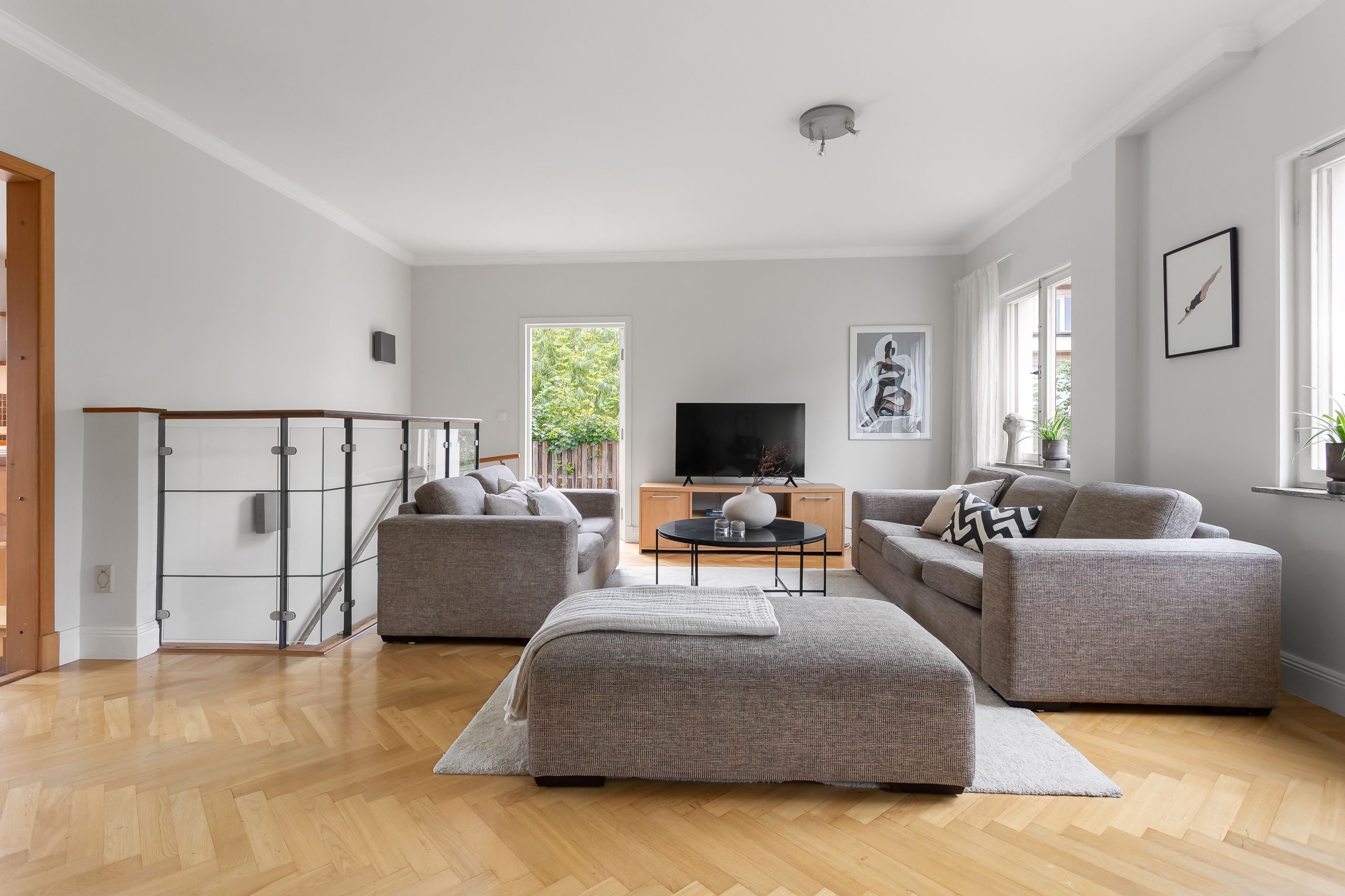 På det övre planet möts du av ett stort och inbjudande vardagsrum med fyra vackra fönster i fil som vetter mot föreningens grönskande trädgård. Här finns gott om plats för både soffgrupp, loungedel och ett långt matbord för det stora sällskapet. Rummet ramas in av vacker fiskbensparkett och en stämningsfull öppen spis. Intill ligger det rymliga köket med generösa förvaringsmöjligheter och direkt utgång till den privata uteplatsen. På samma plan finns även två väl tilltagna sovrum, en stor hall med möjlighet att skapa ett tredje sovrum samt en praktisk wc.