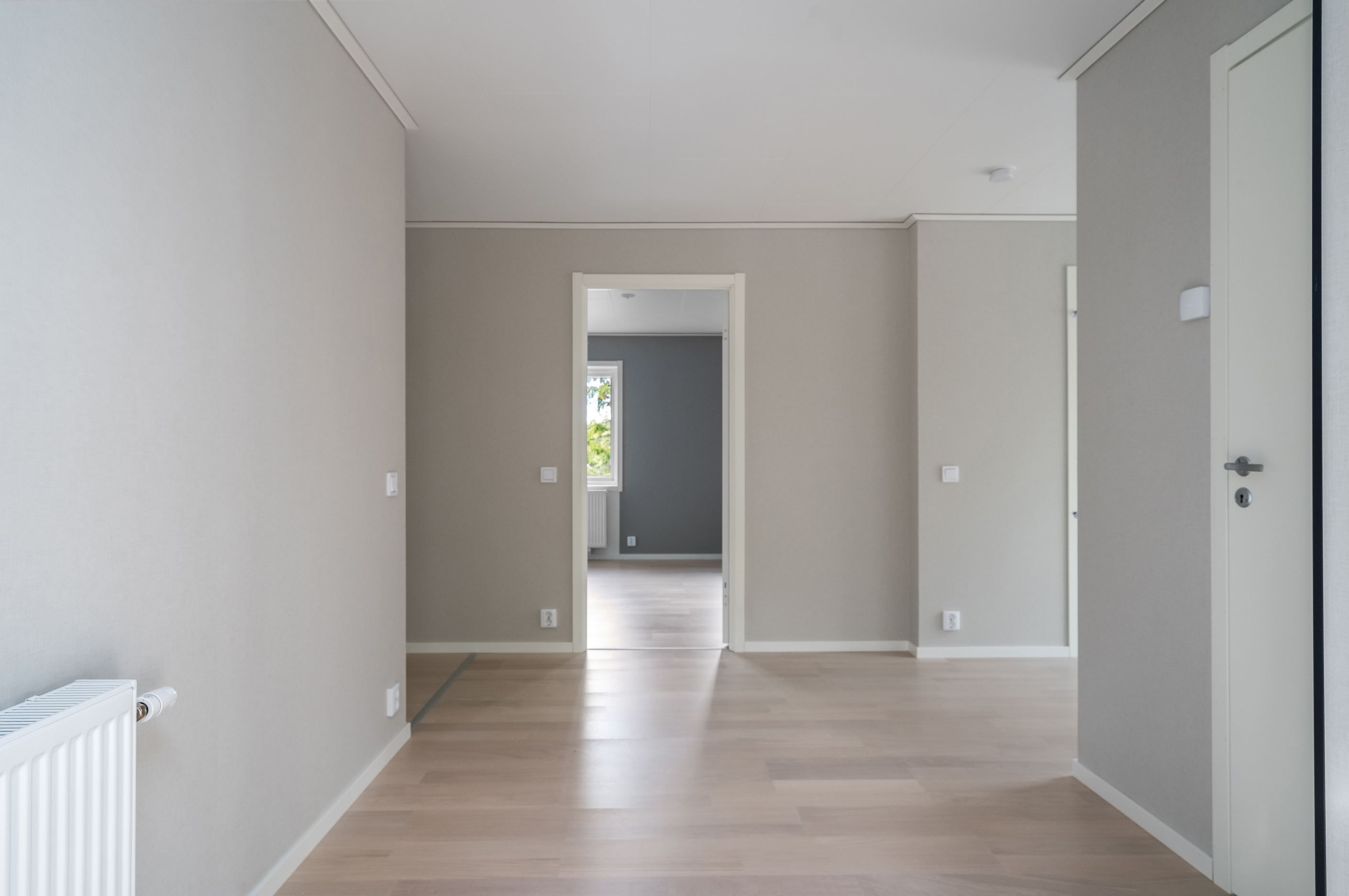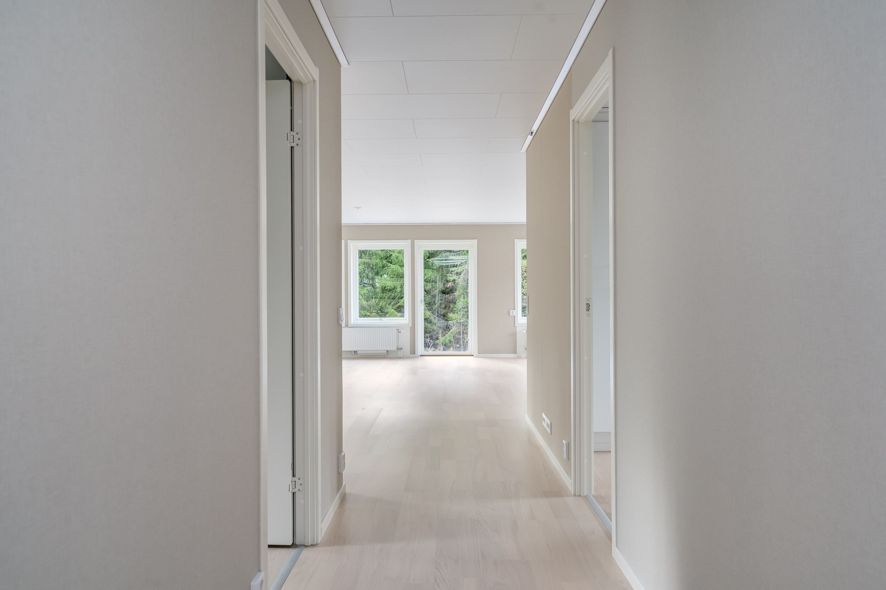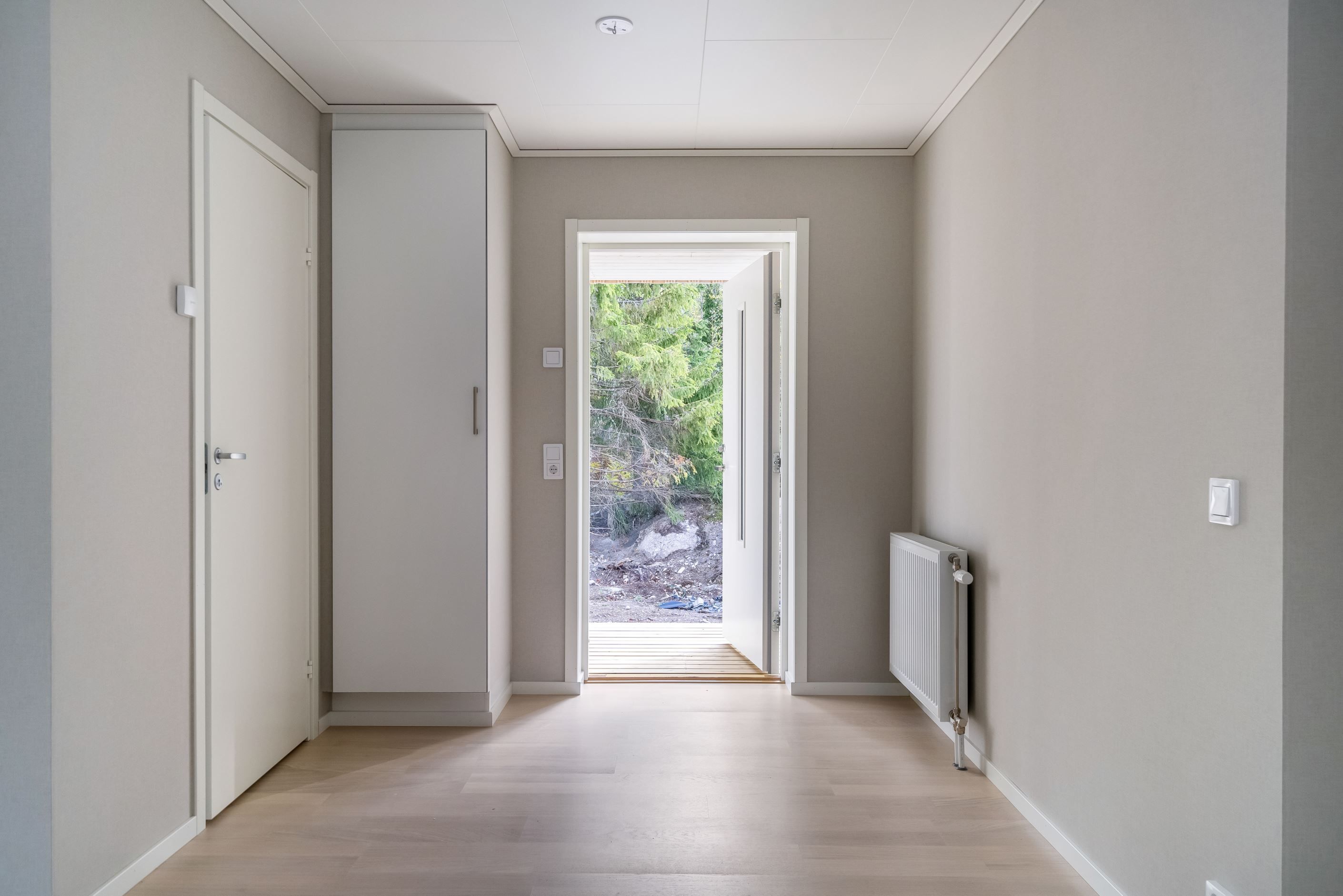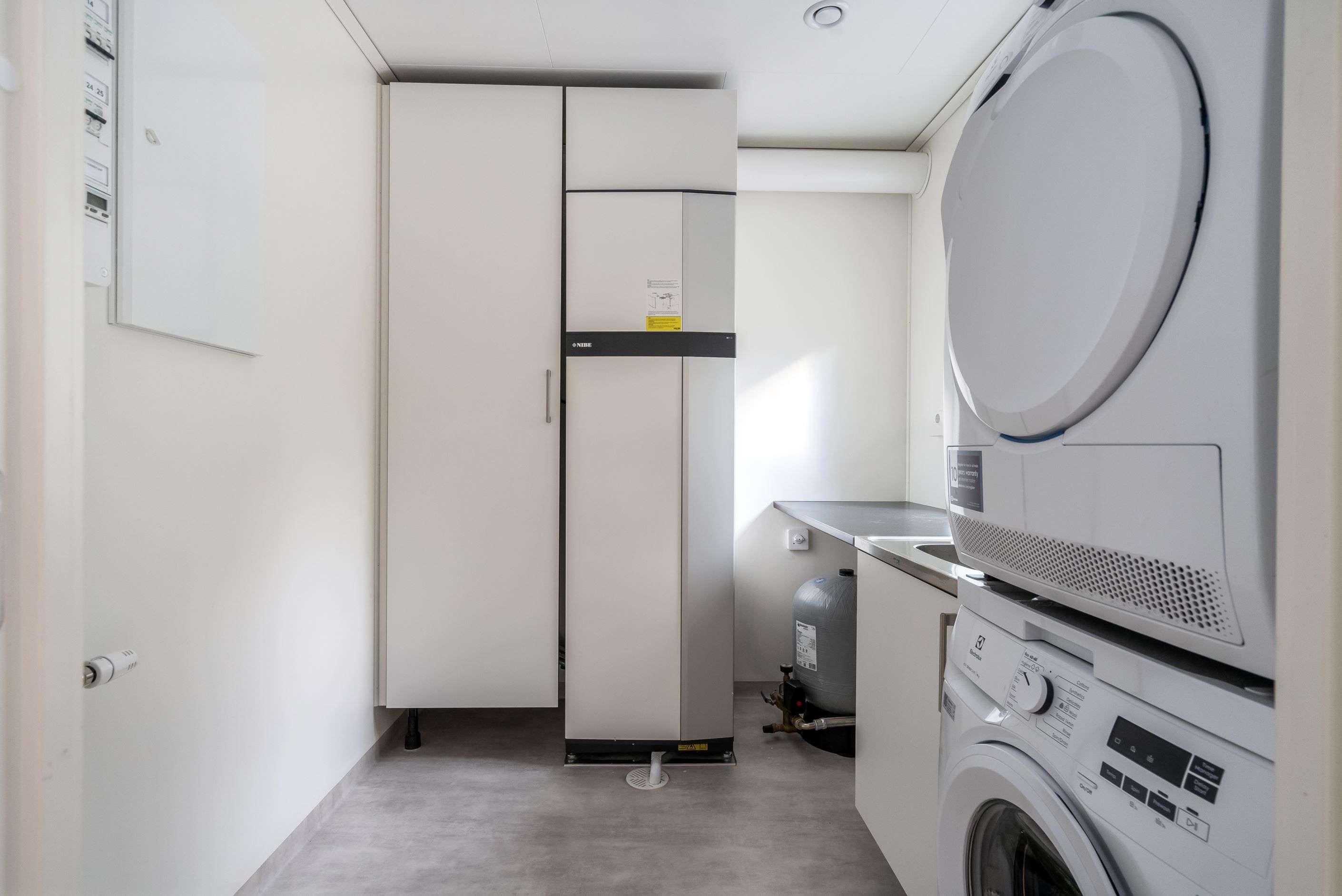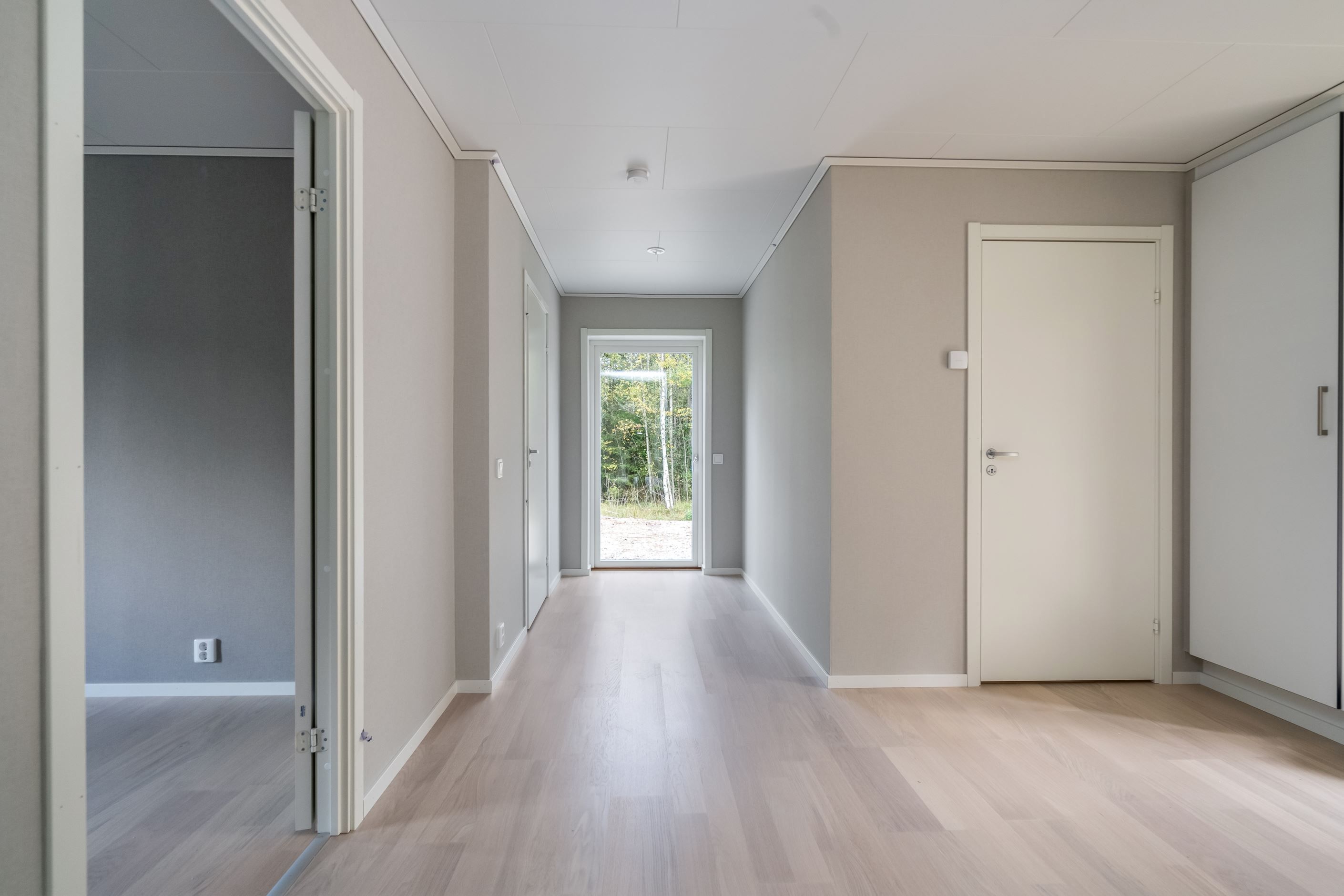 Väl innanför ytterdörren möts du av en rymlig hall med gott om plats för avhängning. Direkt till höger ligger husets tvättstuga, utrustad med ho, förvaringsskåp, tvättmaskin och torktumlare. Här är även husets värmepump placerad.