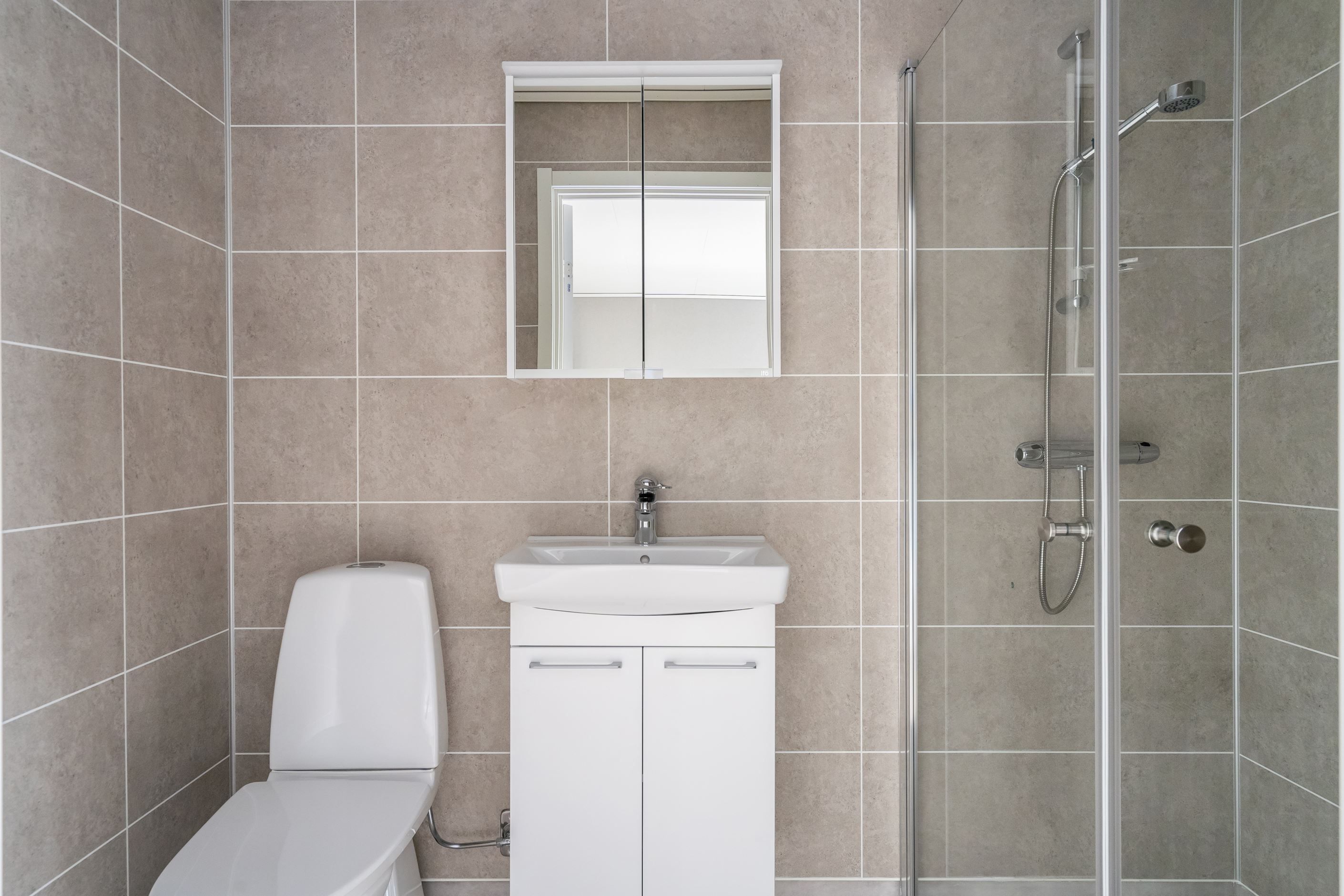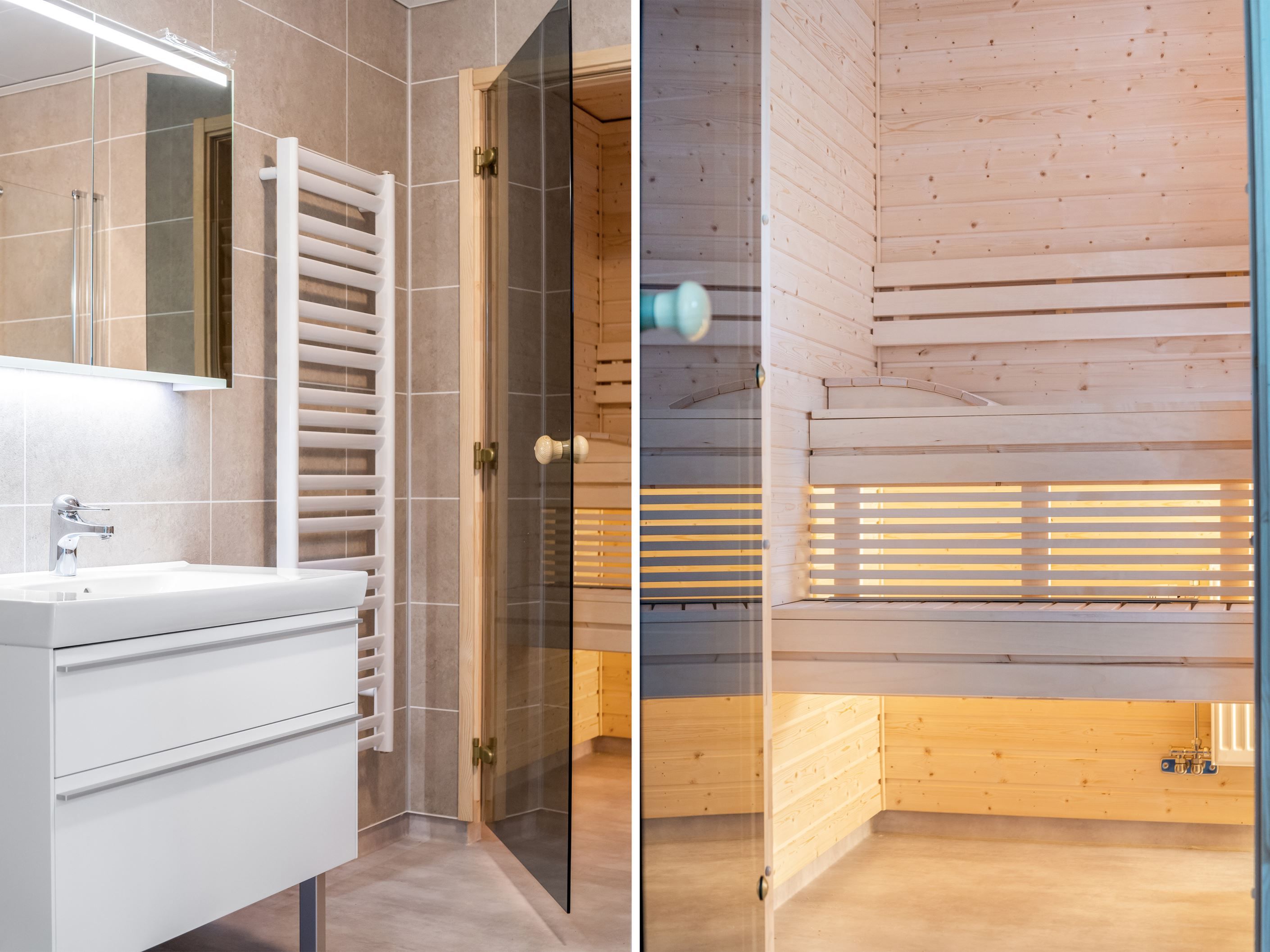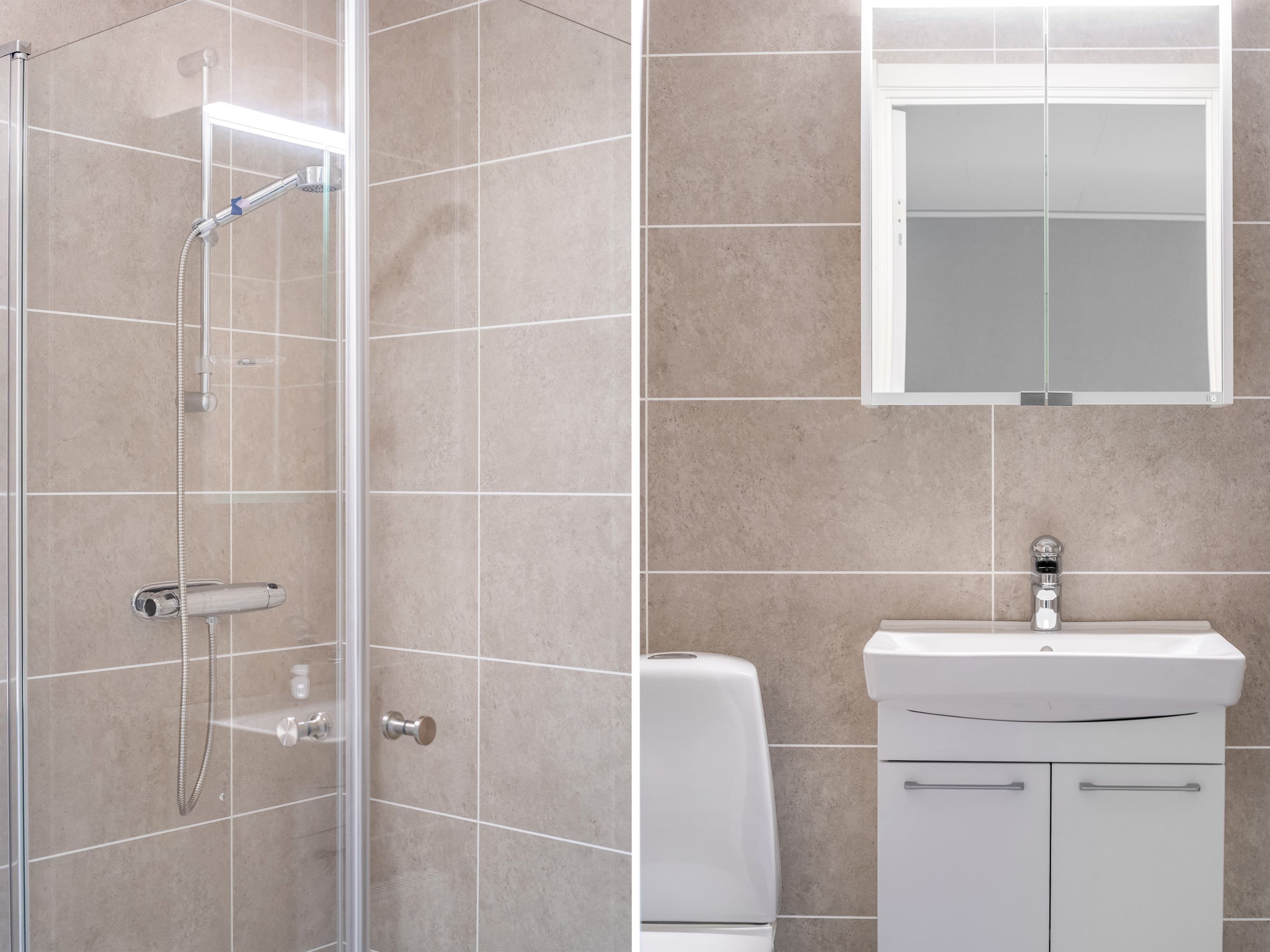 Vidare in i bostaden nås det stilrena badrummet, som även erbjuder en härlig och rymlig bastu. Badrummet är utrustat med duschhörna med både tak- och handdusch, samt vikbara duschväggar. Här finns även wc, handfat med kommod, handdukstork samt spegelskåp med inbyggd belysning och förvaring. Ett fönster släpper in vackert dagsljus och bidrar till en ljus och trivsam atmosfär.