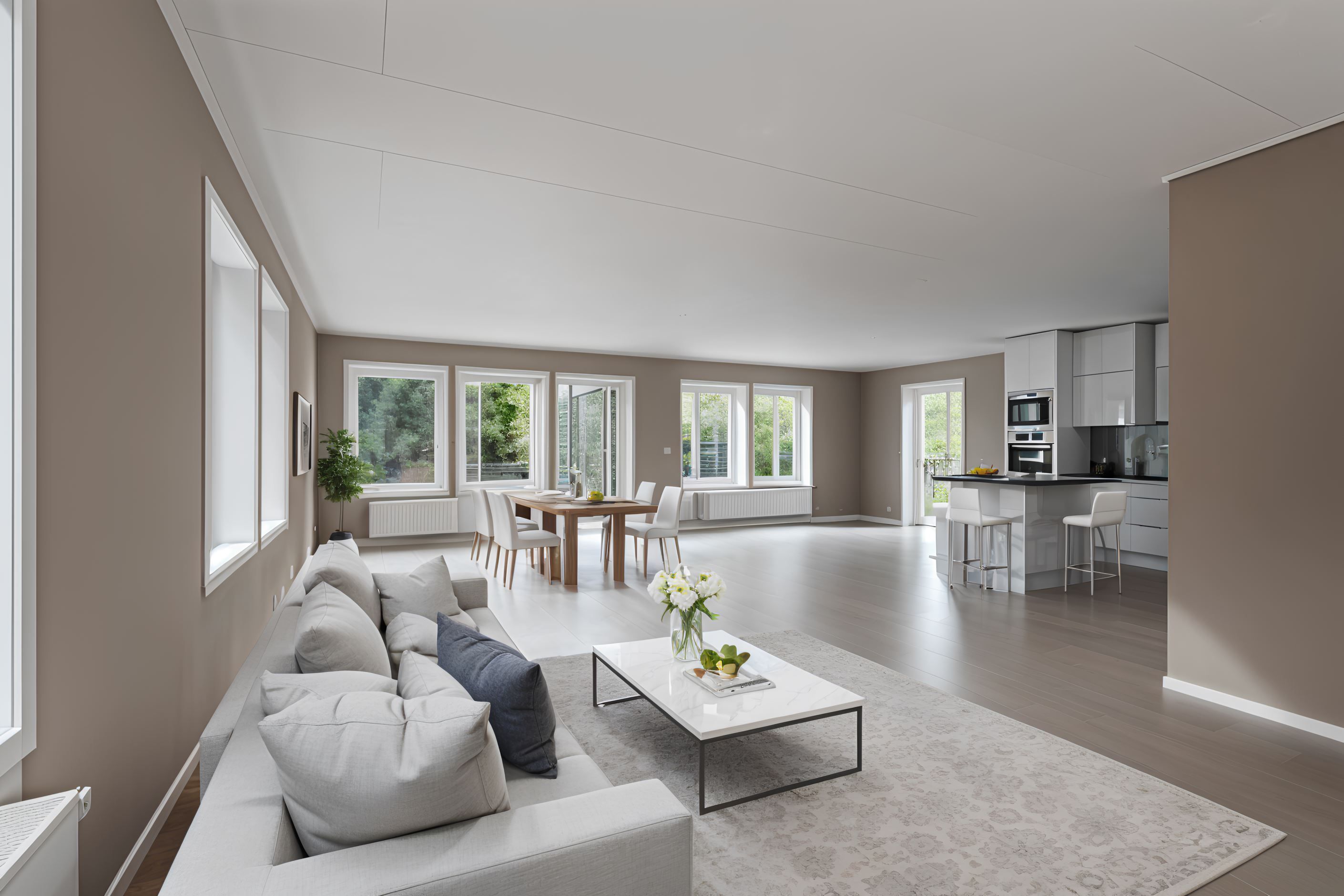 Huset bjuder på ett generöst vardagsrum om ca 33 m² i öppen planlösning med det luftiga köket på ca 25 m². Flertalet fönster gör att både vardagsrum och kök fullkomligt badar i ljus. Två helglasade altandörrar leder ut till tomten.