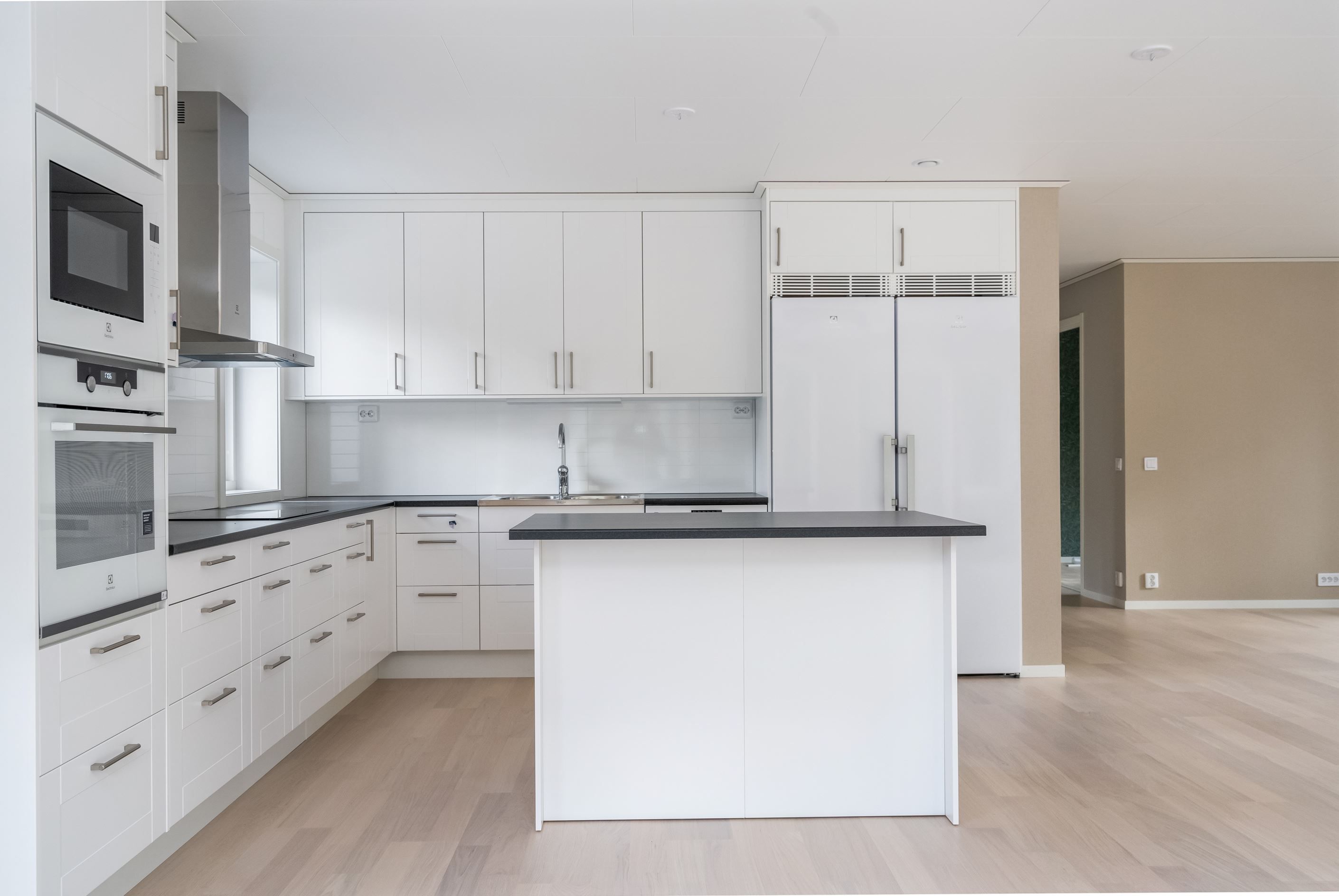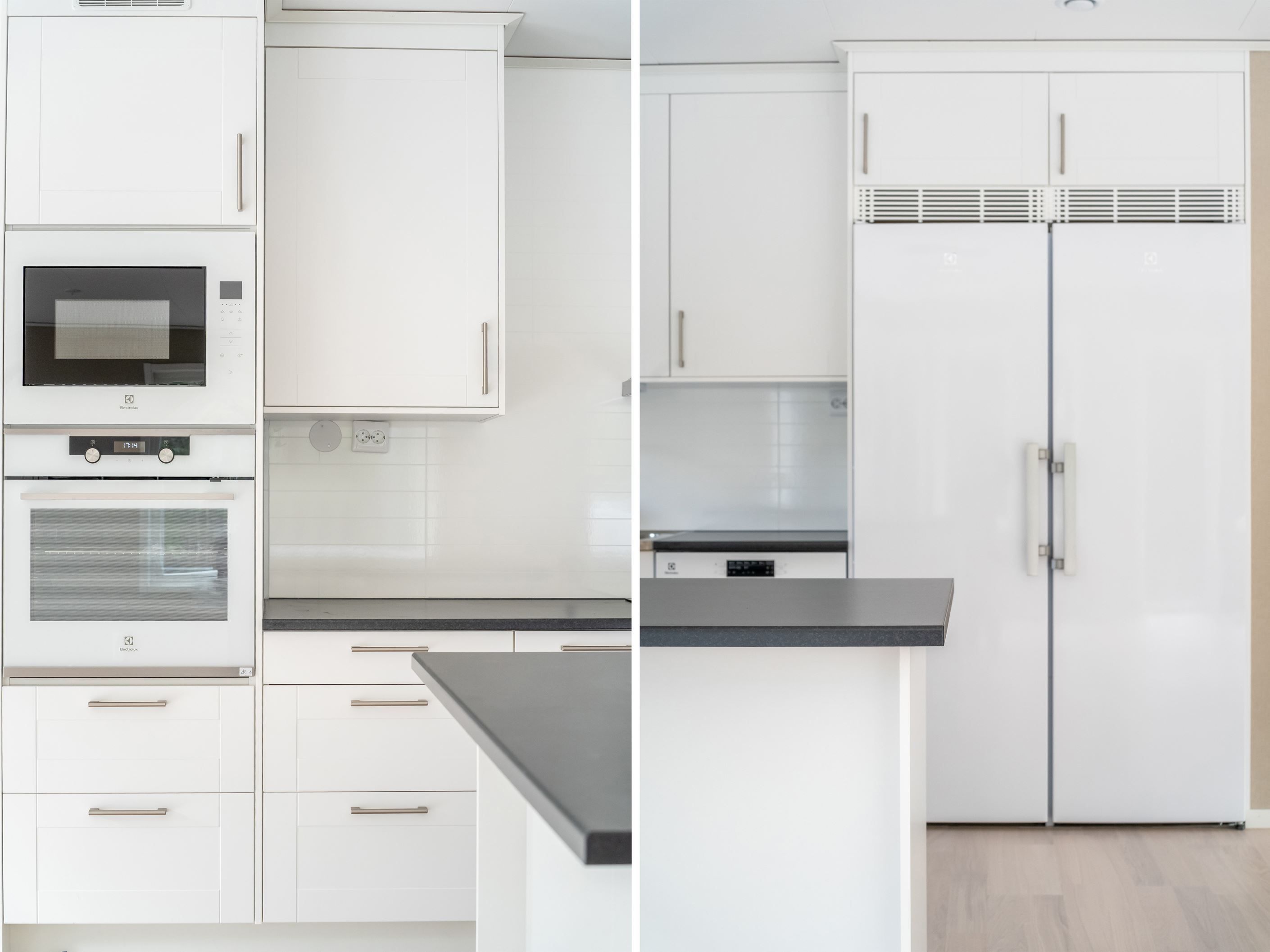 Den inbjudande köksön skapar en naturlig övergång mellan kök och vardagsrum, samtidigt som den erbjuder gott om arbetsyta. Köket är välutrustat med varmluftsugn, mikrovågsugn, spishäll, fläkt, fullstor kyl och frys, diskmaskin samt rikligt med förvaring.